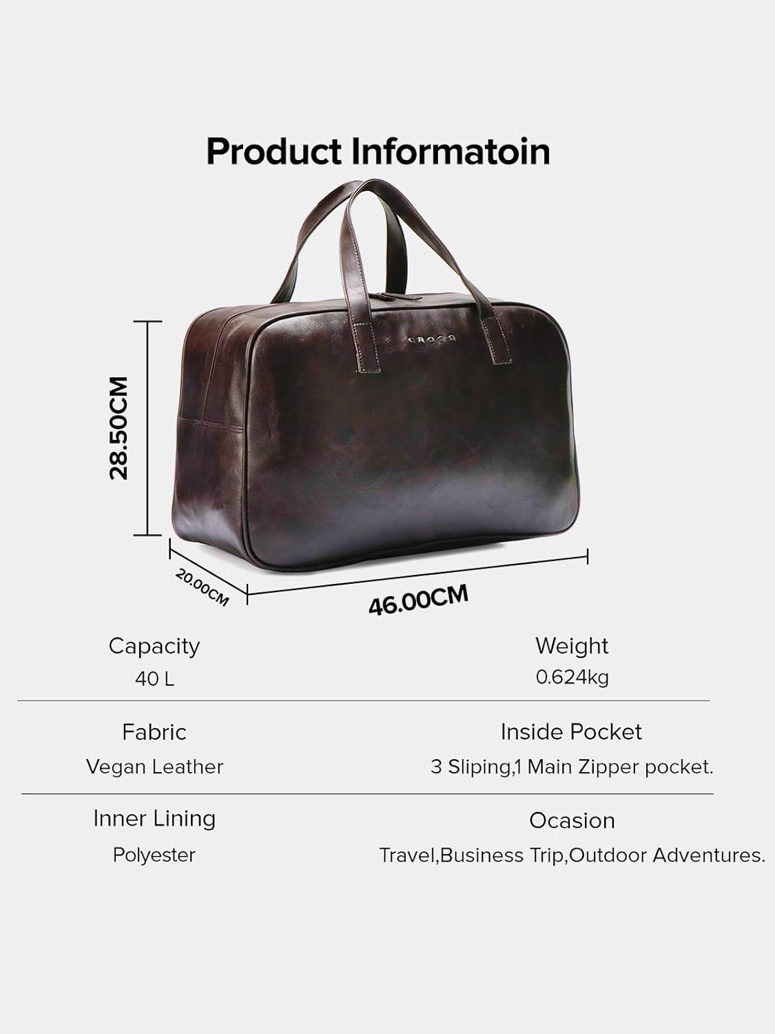 This Duffle Bag Comes With One Main Compartment , Inside Back Wall One Lining Zipper Pocket. It Has One Strong And Adjustable Shoulder Handle. It is Lightweight and comfortable to carry. This bag has decent capacity in inside to store essentials with inside zipper pockets to put your private or valuable items.
