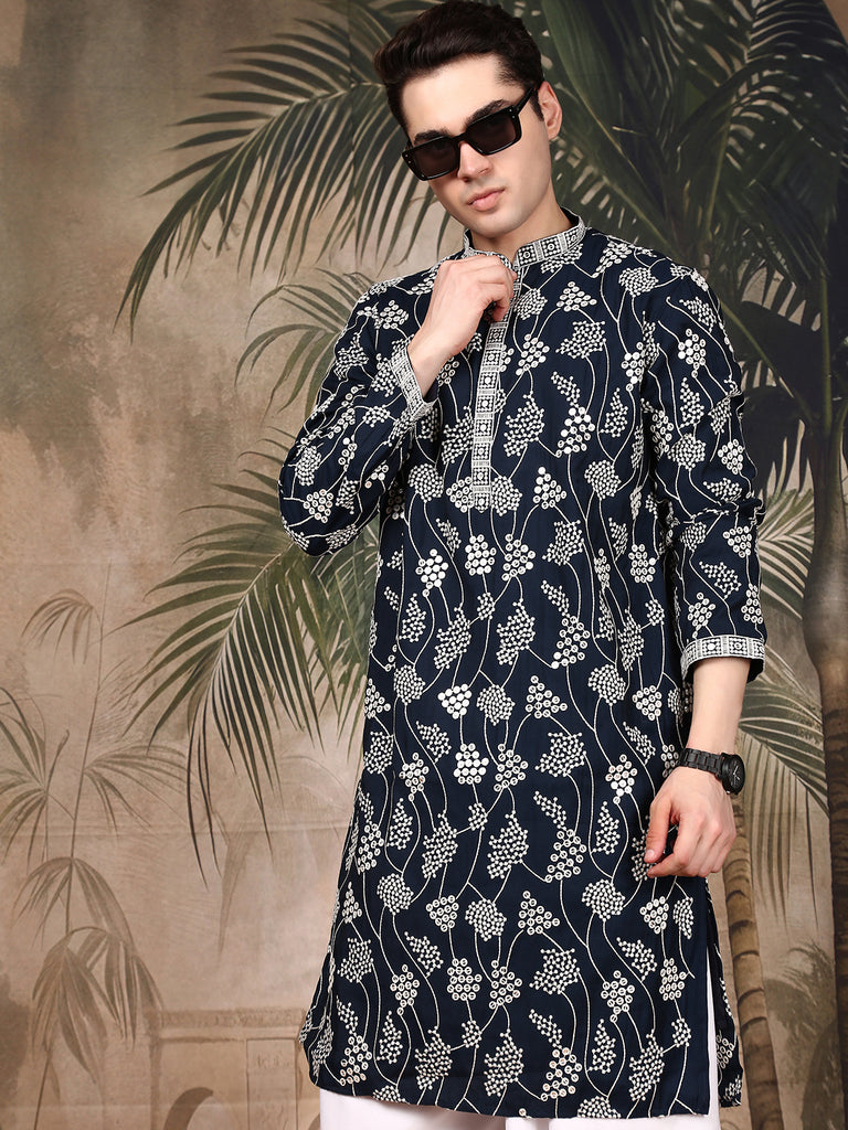 Sanwara Classic Deep Blue Kurta Set for Men with Minimalist Embroideryand Finest Sequins work,Ideal for Diwali, Navratri & Ethnic Wedding Wear
