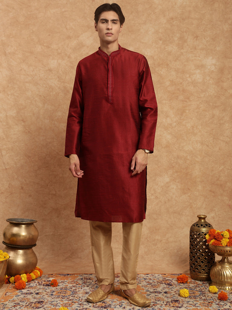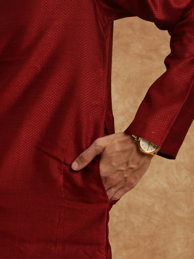 Men's Stylish Maroon Solid Traditional Silk Kurta by Sanwara