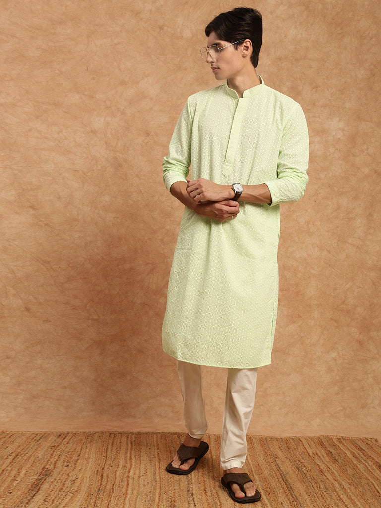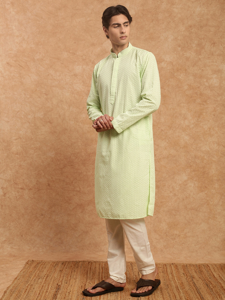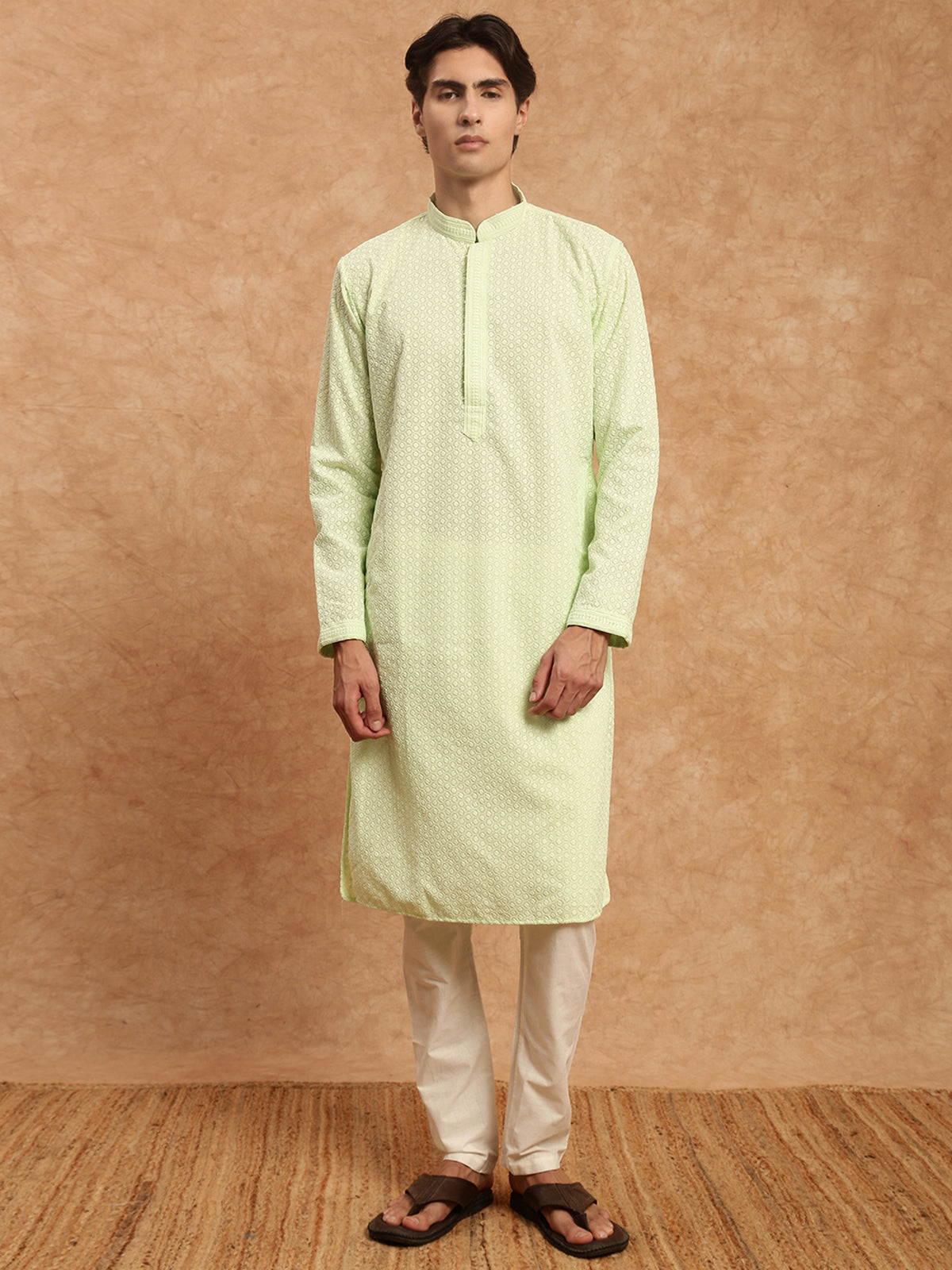 Sanwara's Solid Light Green Ethnic Chikankari Cotton Kurta for Men
