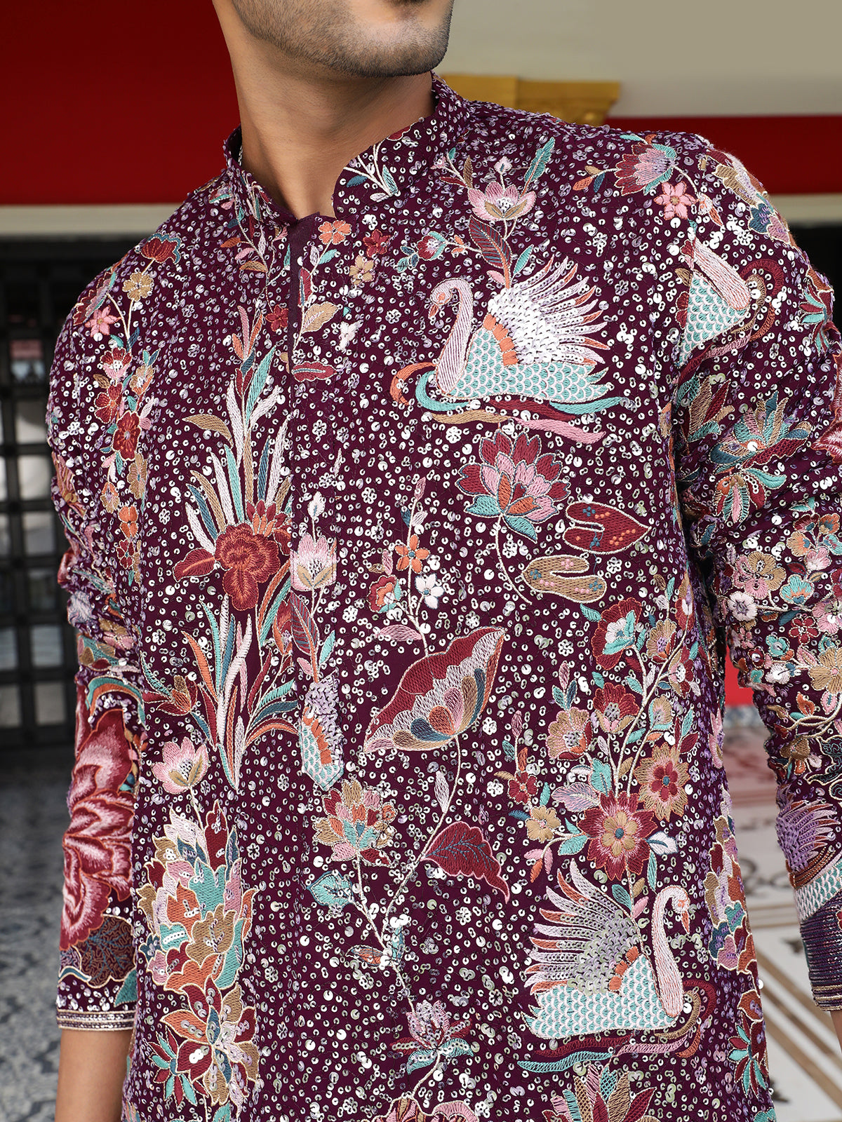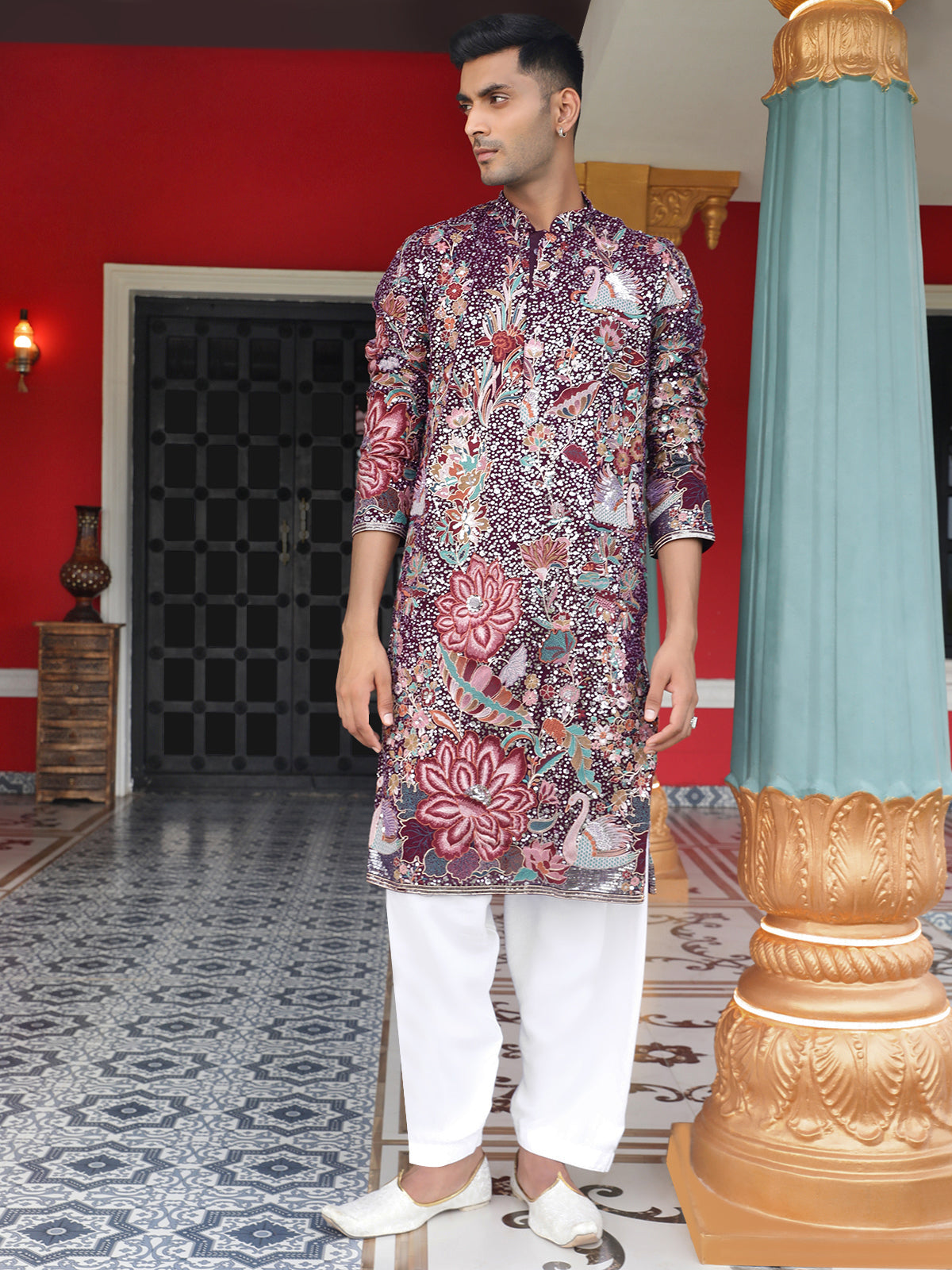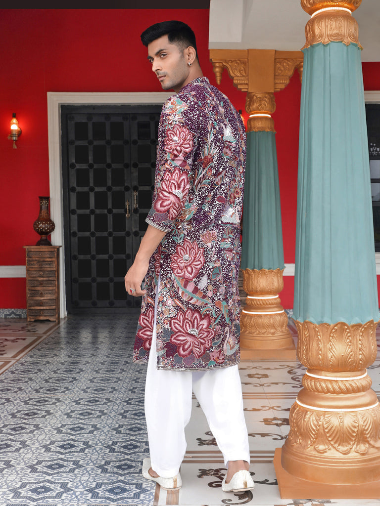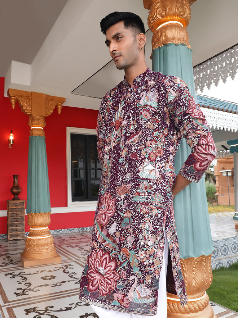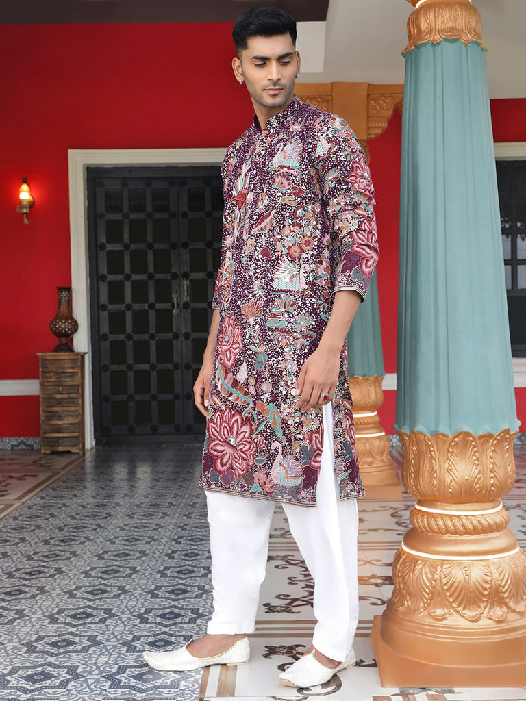 Sanwara Men's Purple Georgette Sequins With Heritage Embroidered Work Vintage Kurta Sets