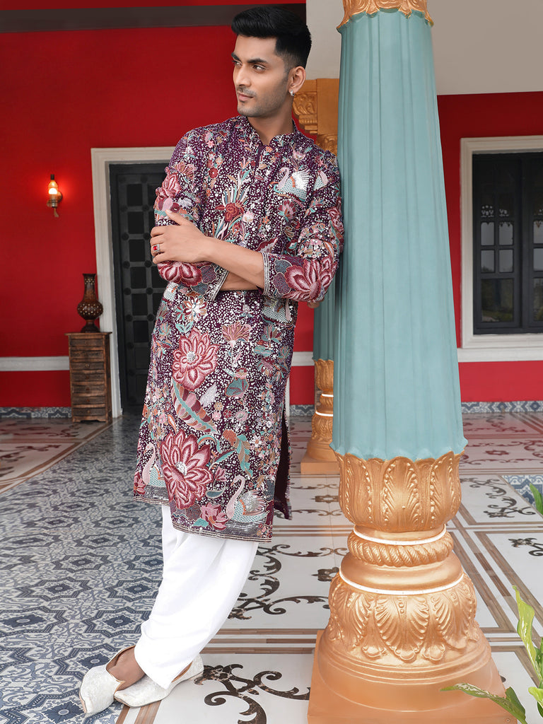 Sanwara Men's Purple Georgette Sequins With Heritage Embroidered Work Vintage Kurta Sets