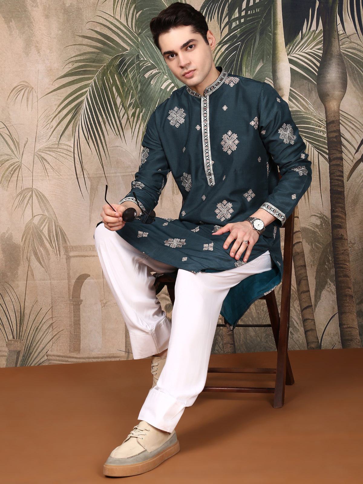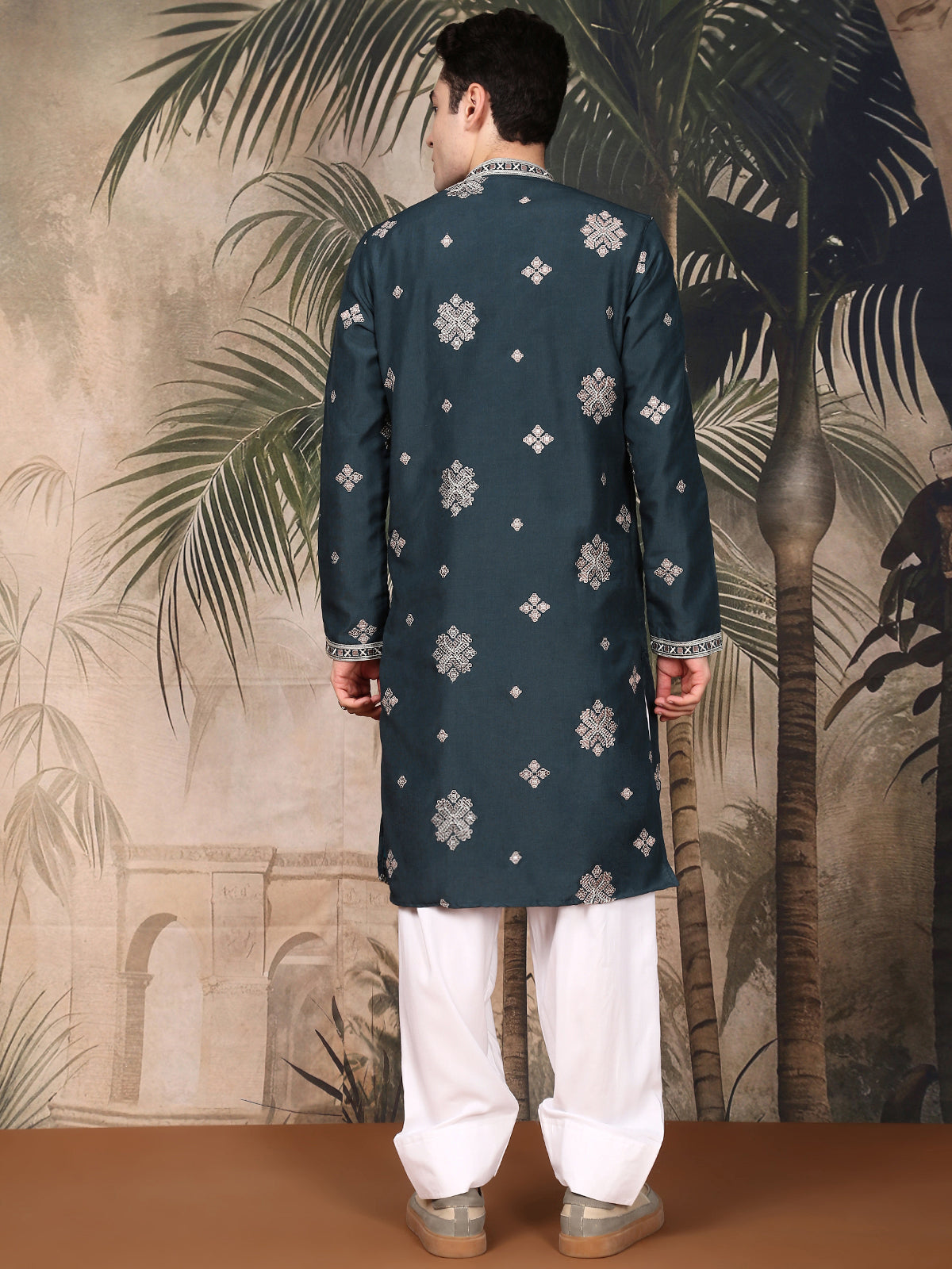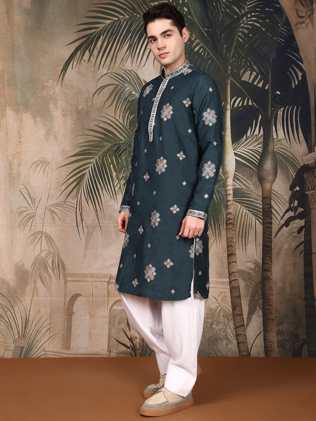 Sanwara Presents Denim Blue Men’s Kurta Set Crafted In Silk Blend And Sequins Ideal For Wedding Navratri And Diwali Celebrations
