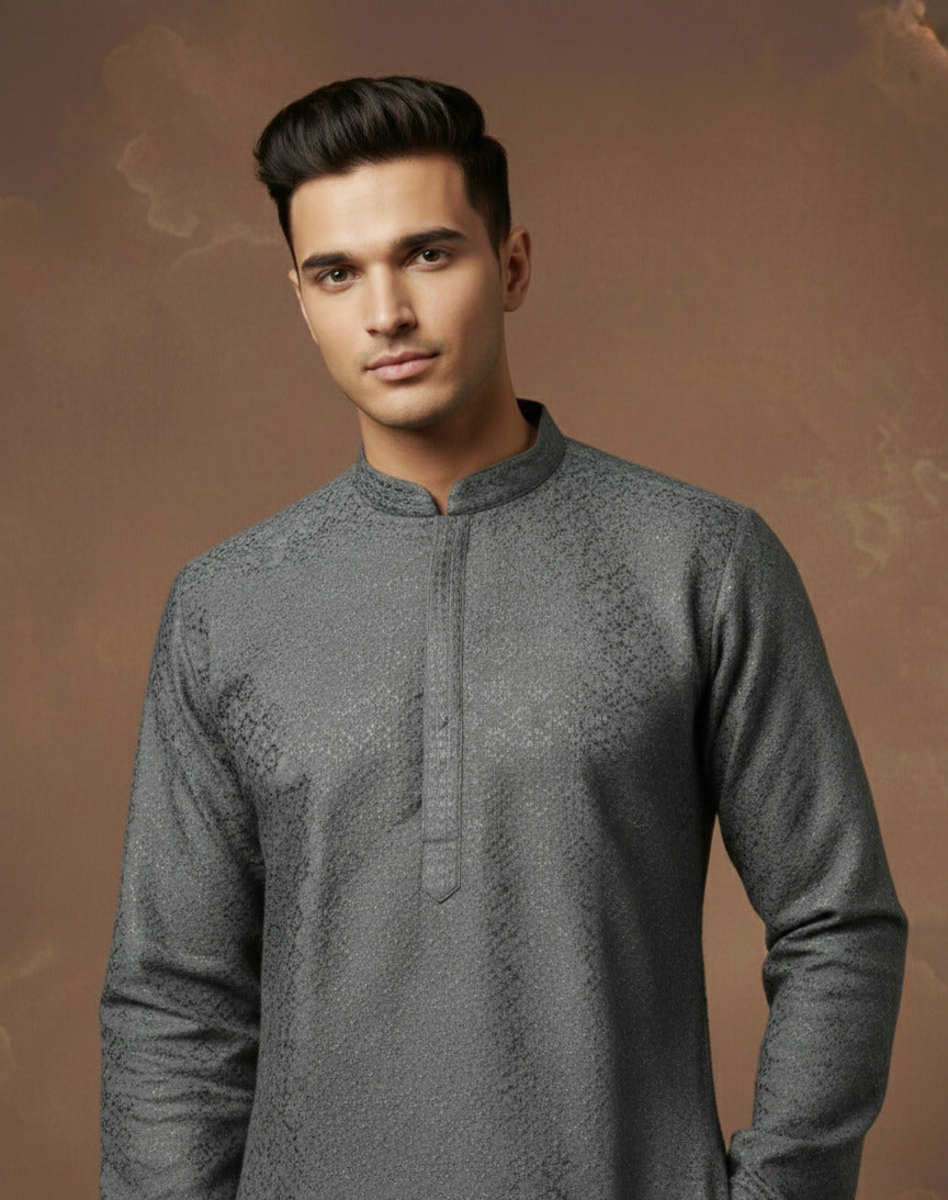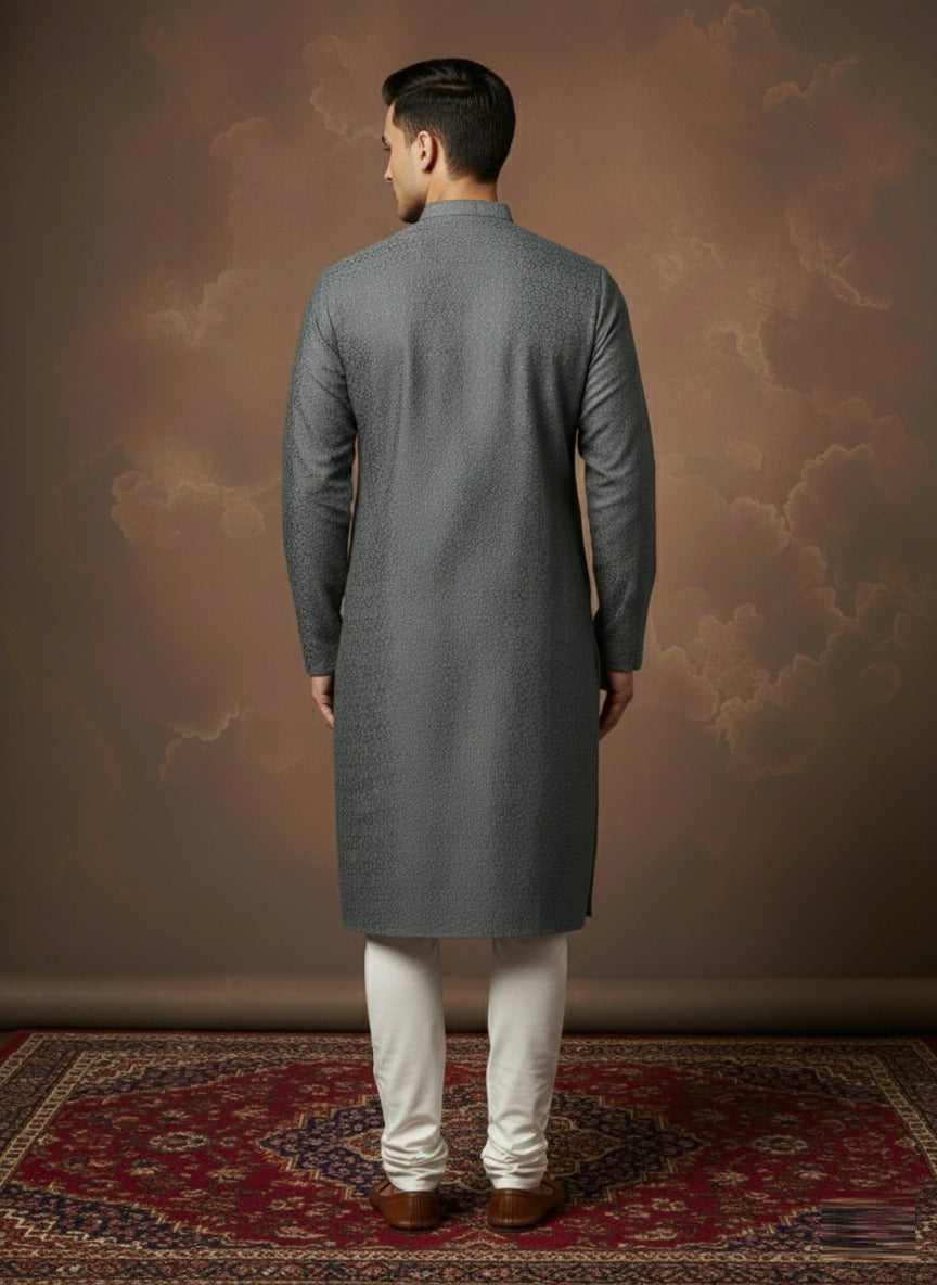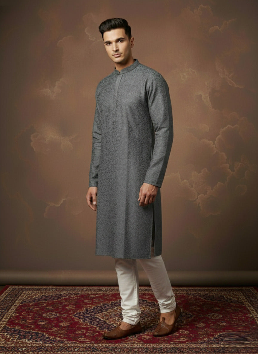 Sanwara Silk Blend Grey Kurta Set for Men with Chikankari Work