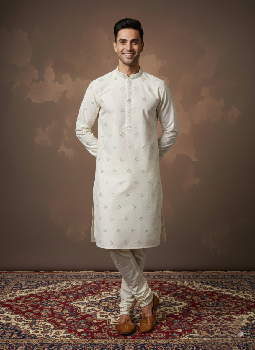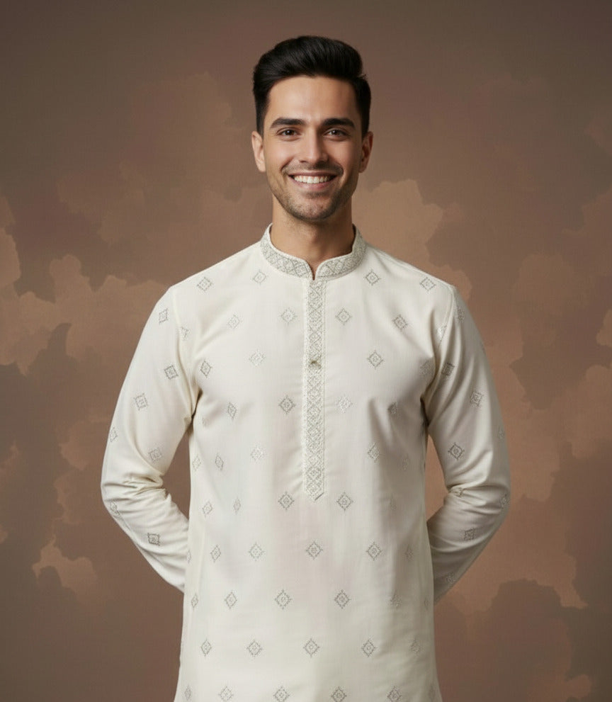 Sanwara Men’s Cream Silk Blend Kurta with Elegant Embellishments