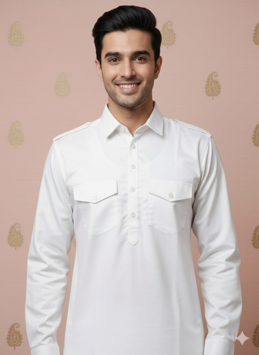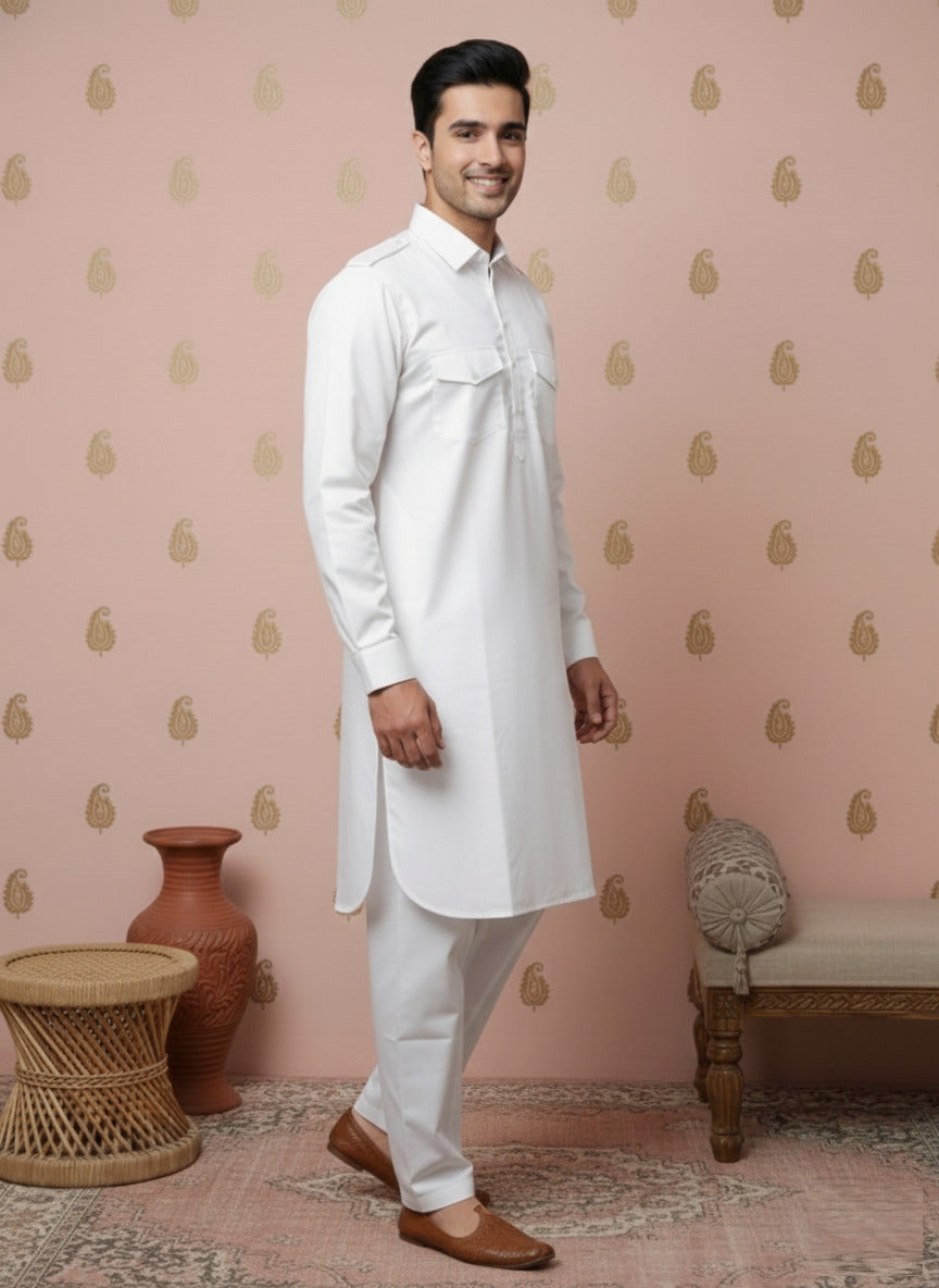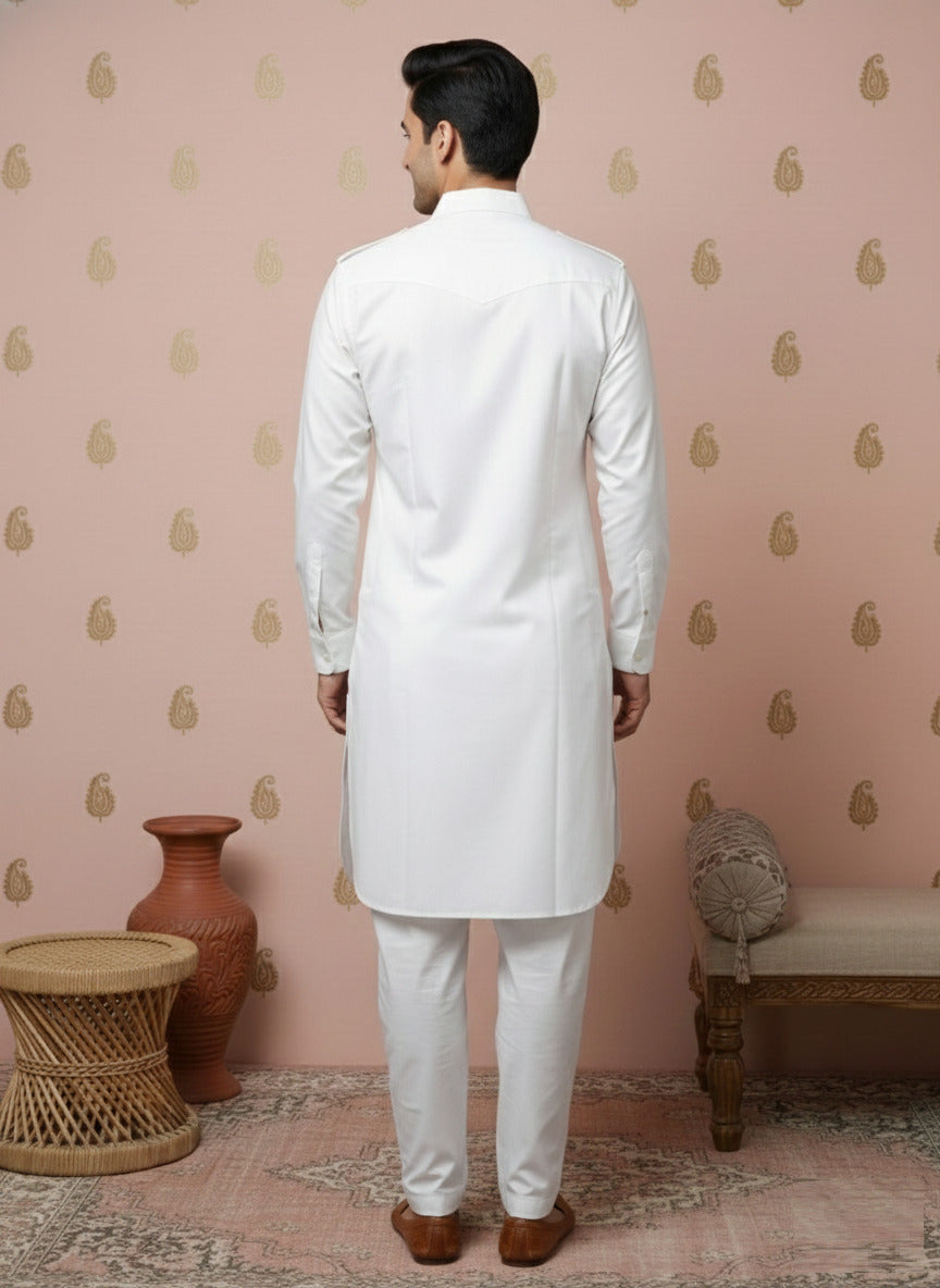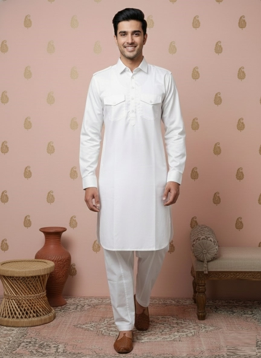 Sanwara Designer White Cotton Pathani Kurta Set for Men with Refined Contemporary Charm