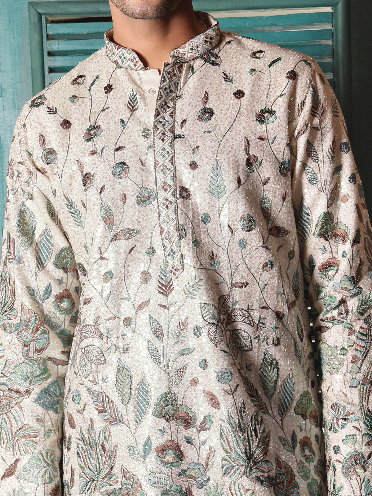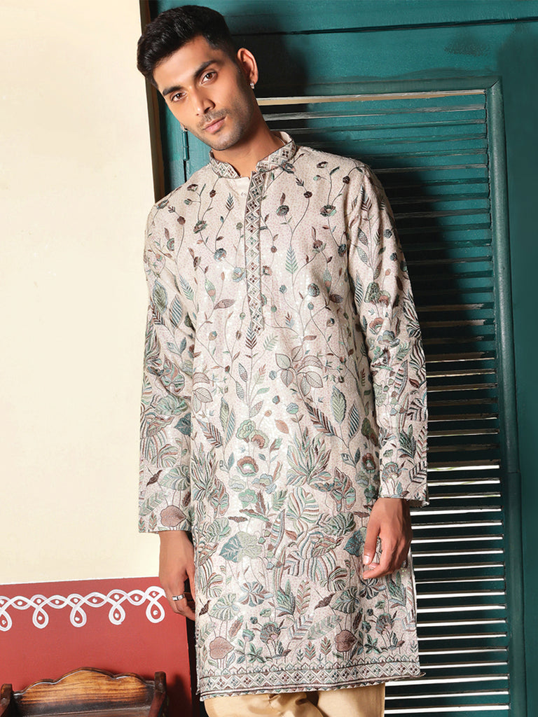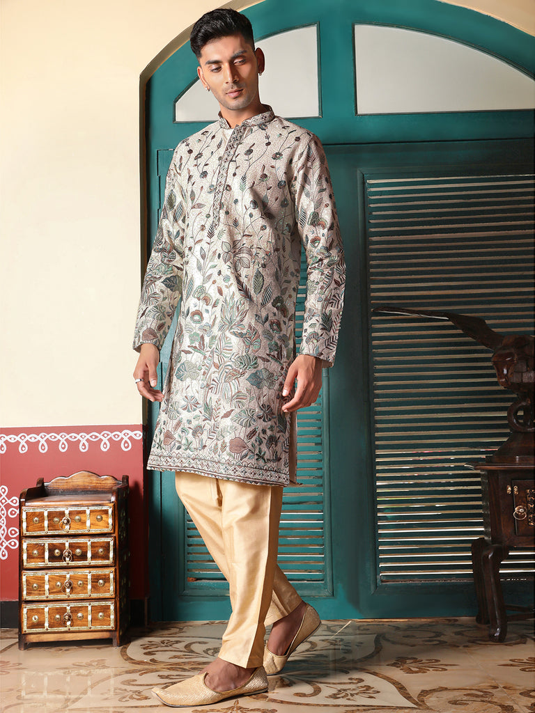 Sanwara Green Printed With Sequins Detailing Work Designer Kurta For Men's