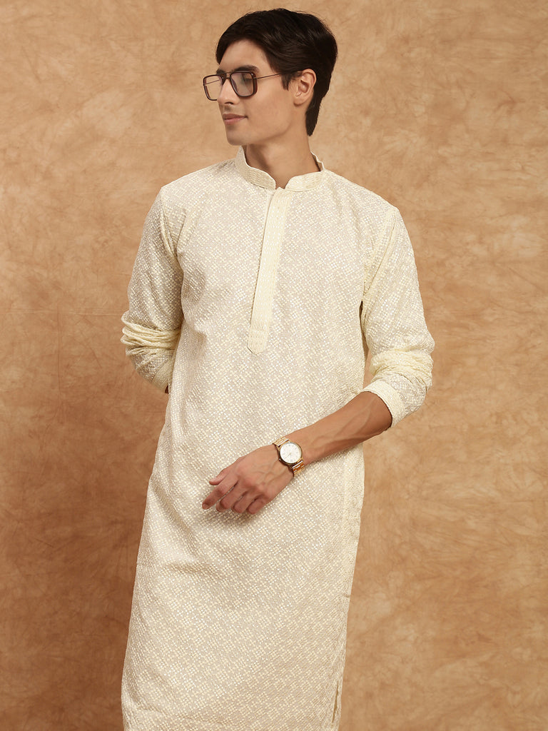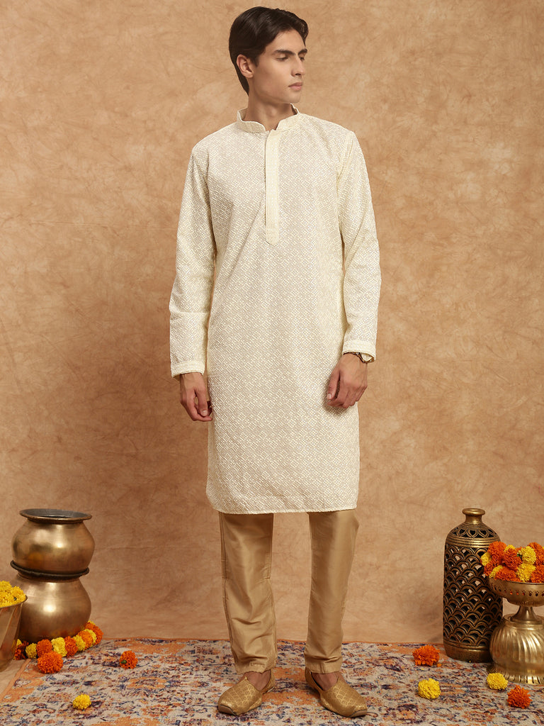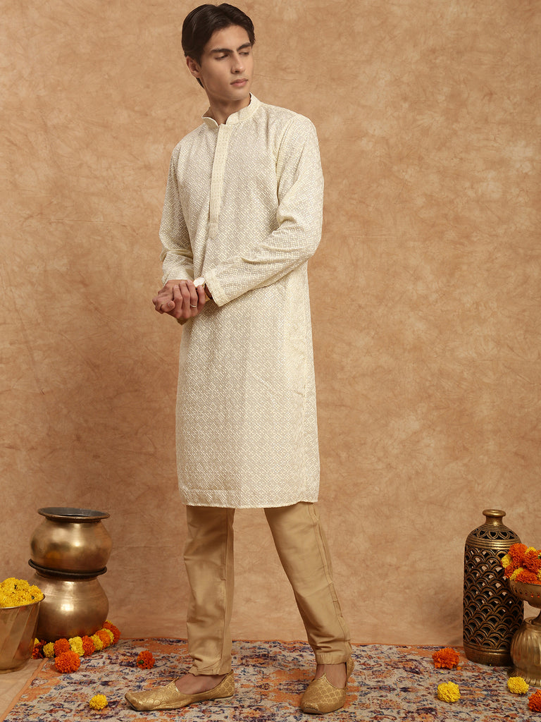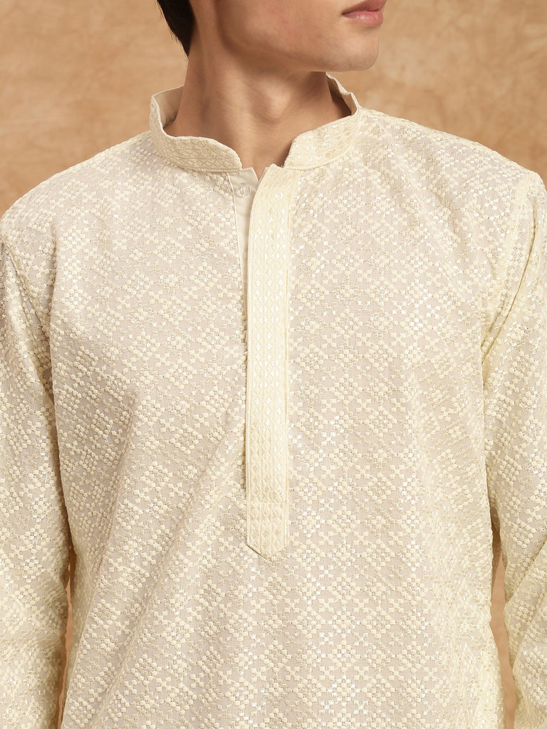 Men's Heritage Embroidered Work Off White Kurta Set In Cotton by Sanwara