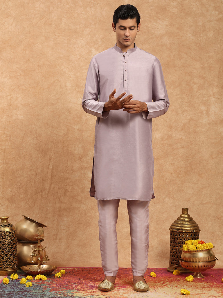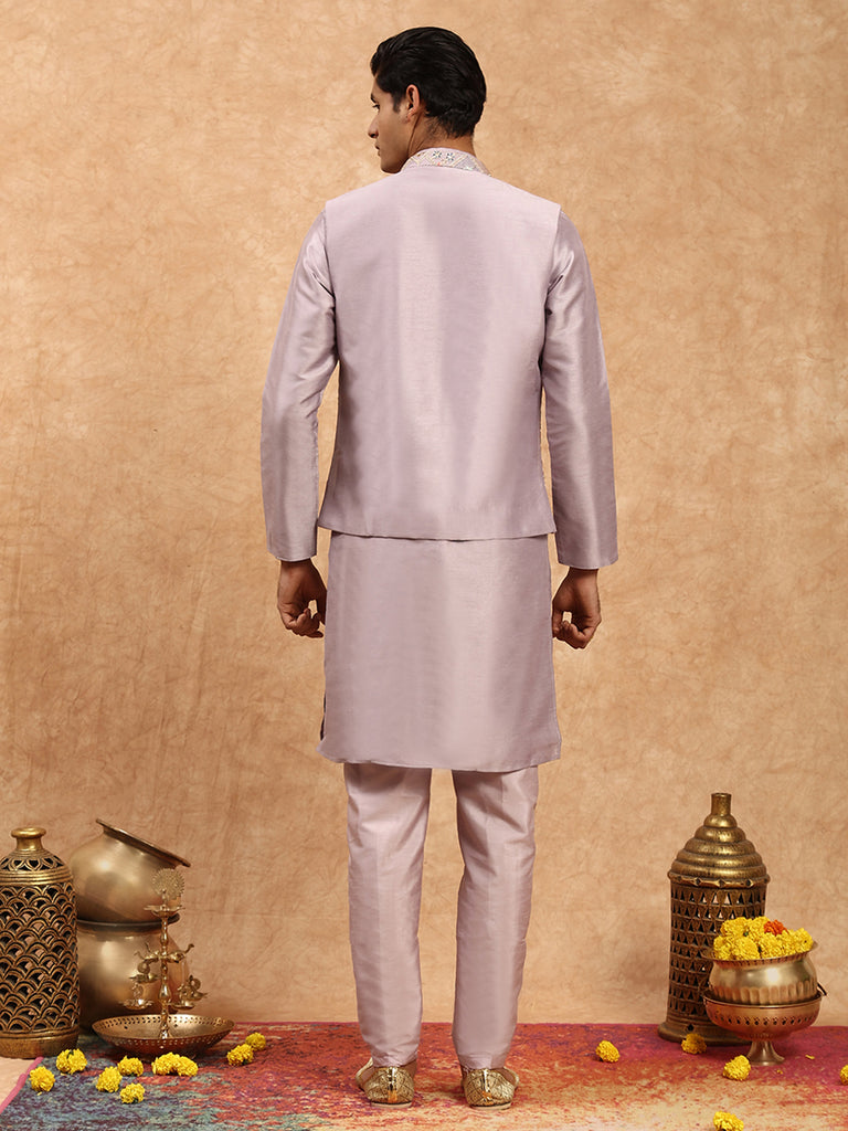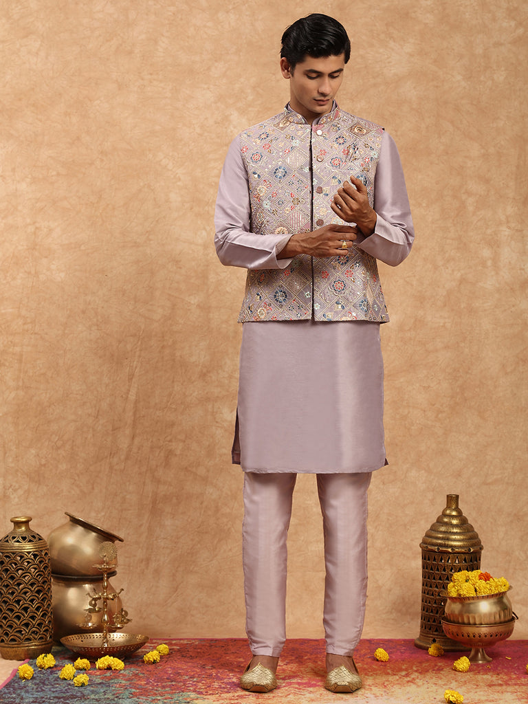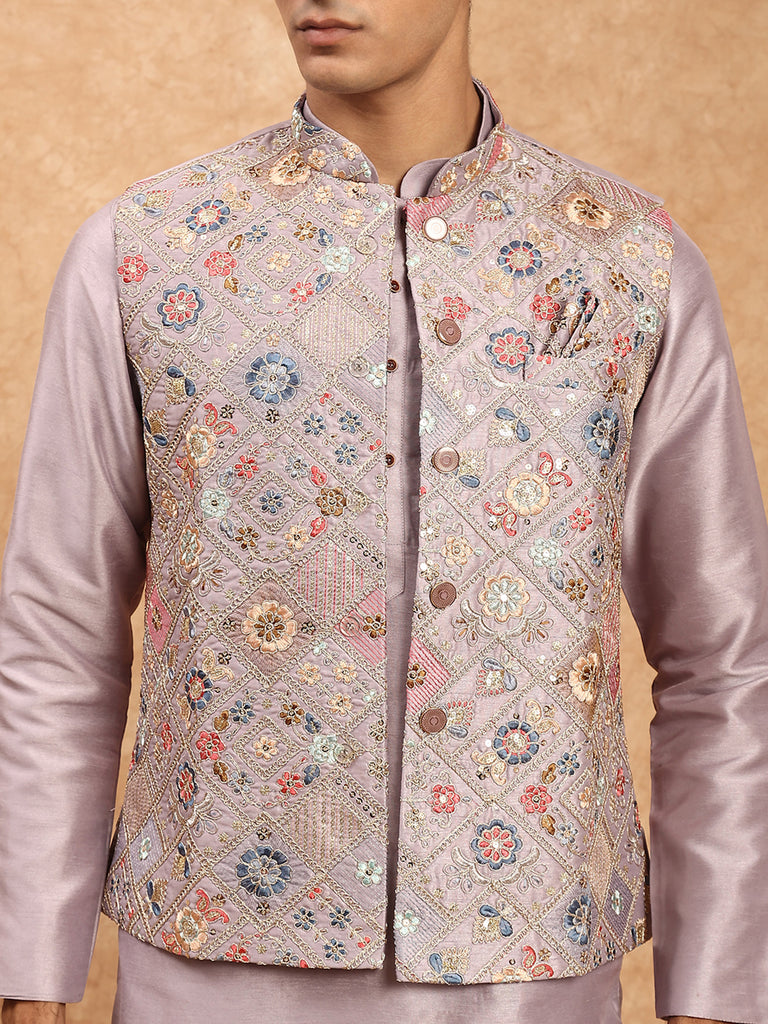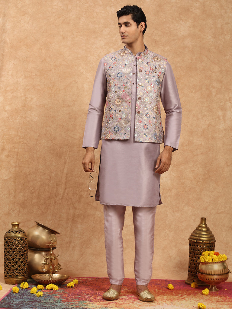 Sanwara Men's Solid Purple Kurta with Floral JacketSet & Pant Combine with Modern Style for Wedding