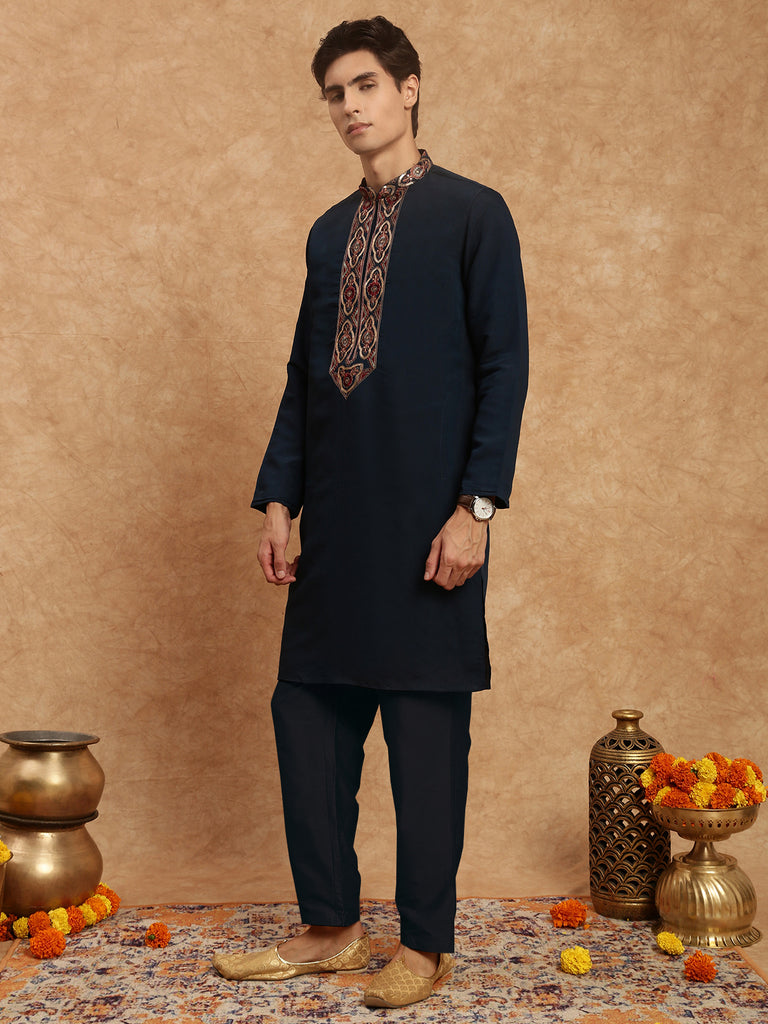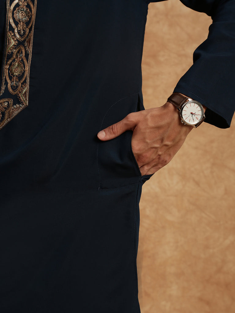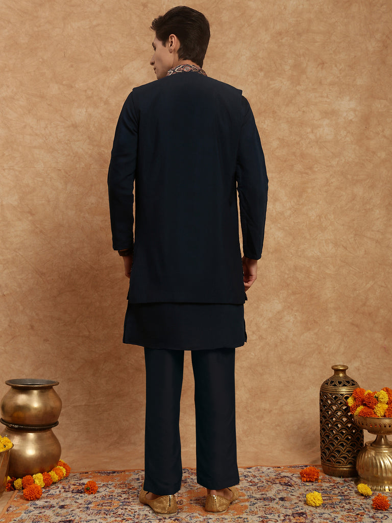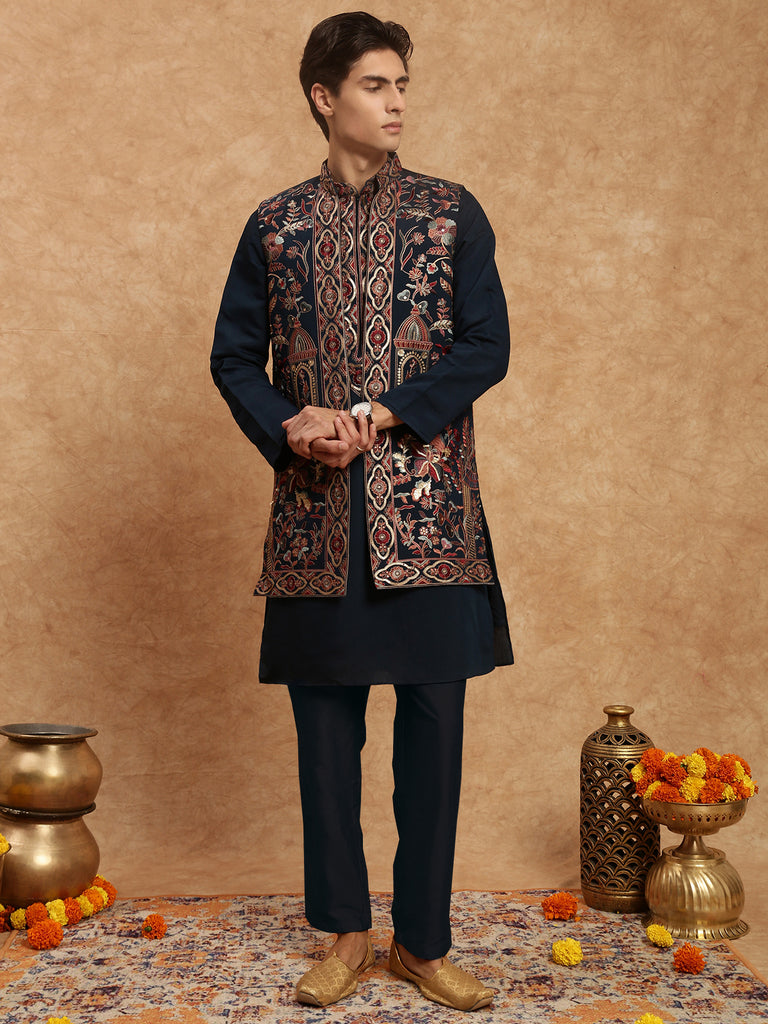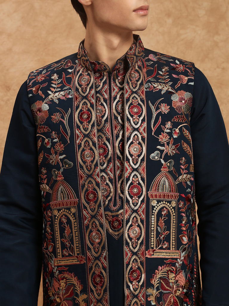 Sanwara Men's Solid Navy Blue Kurta and Floral Jacket Set Designed for the Modern Look