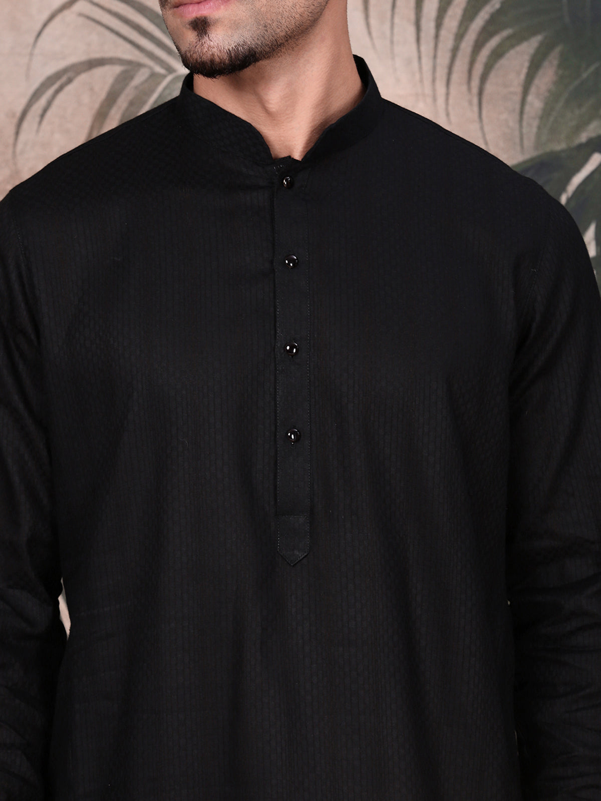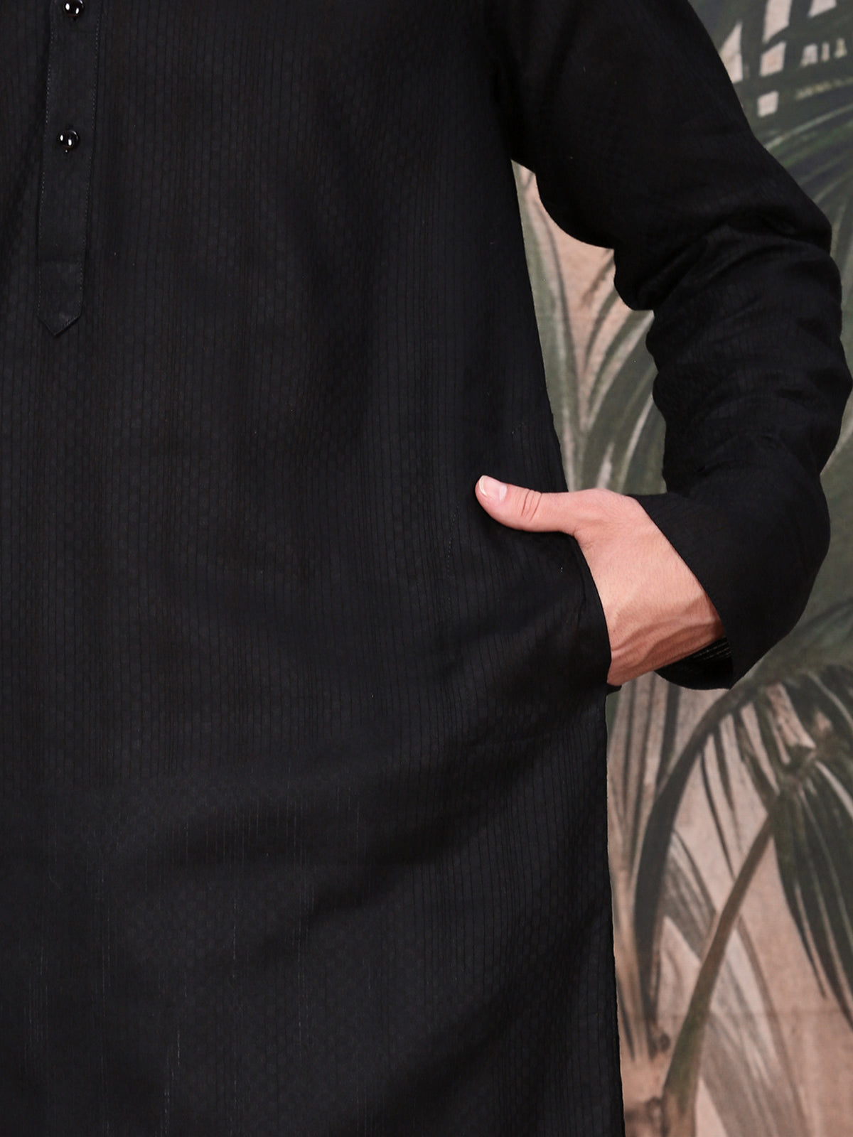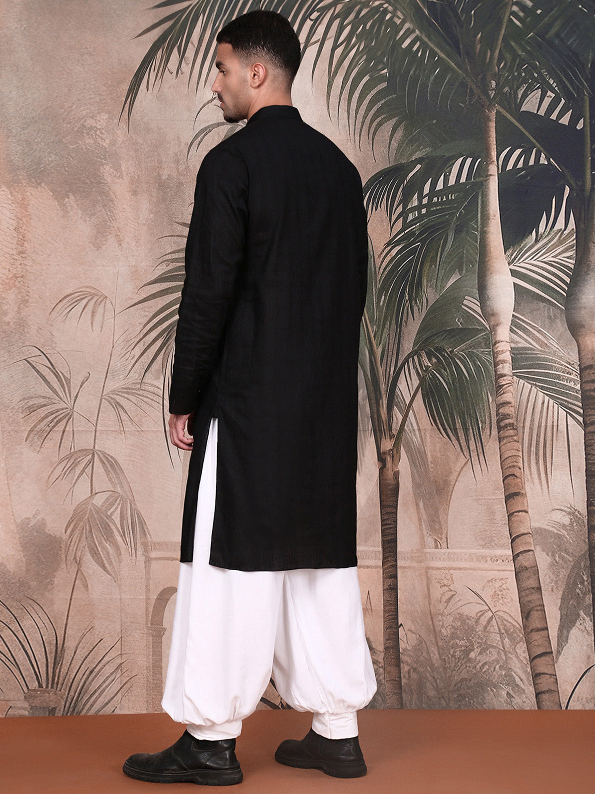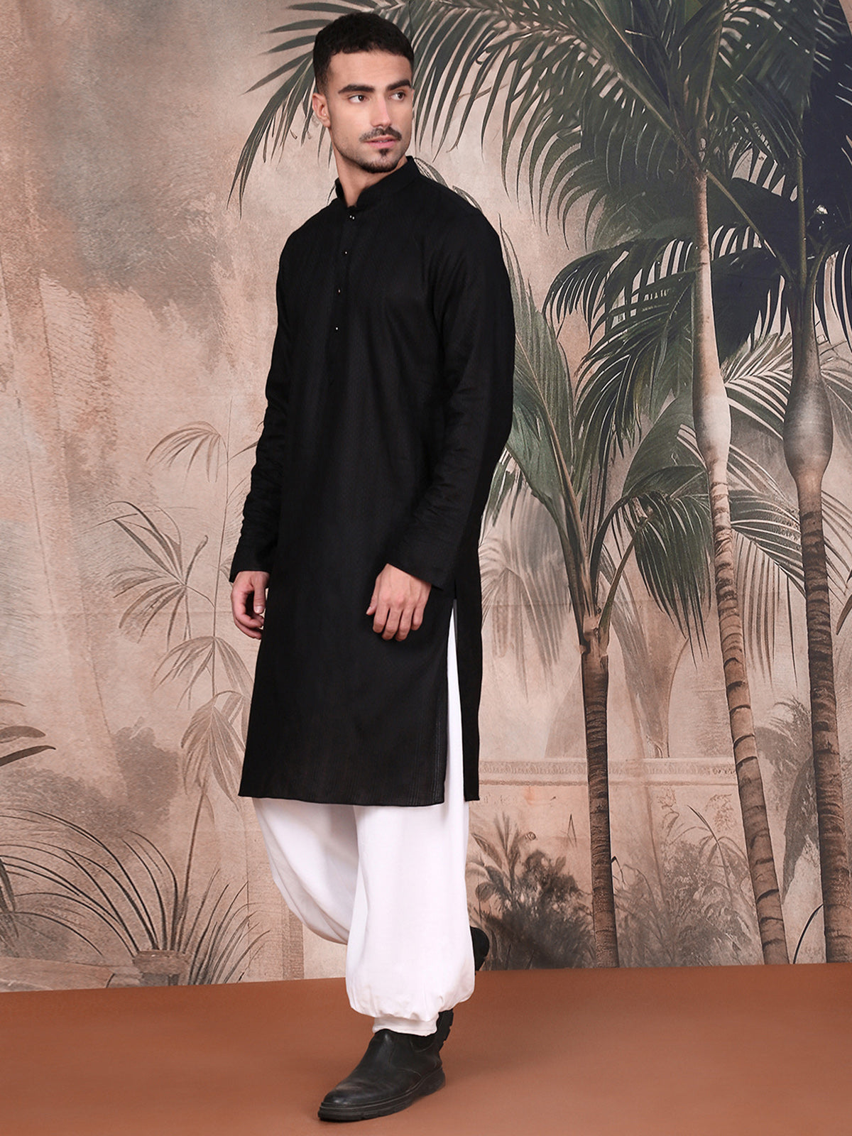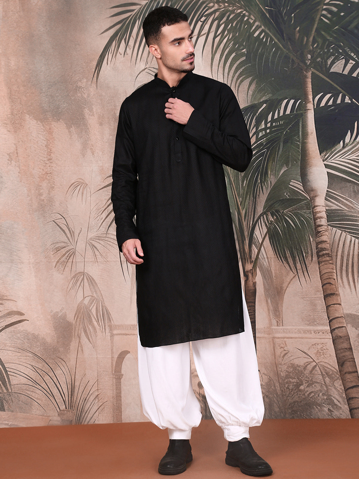 Sanwara Men’s Solid Black Textured Kurta Set Hand-Embroidered Silk Meets Modern Chic