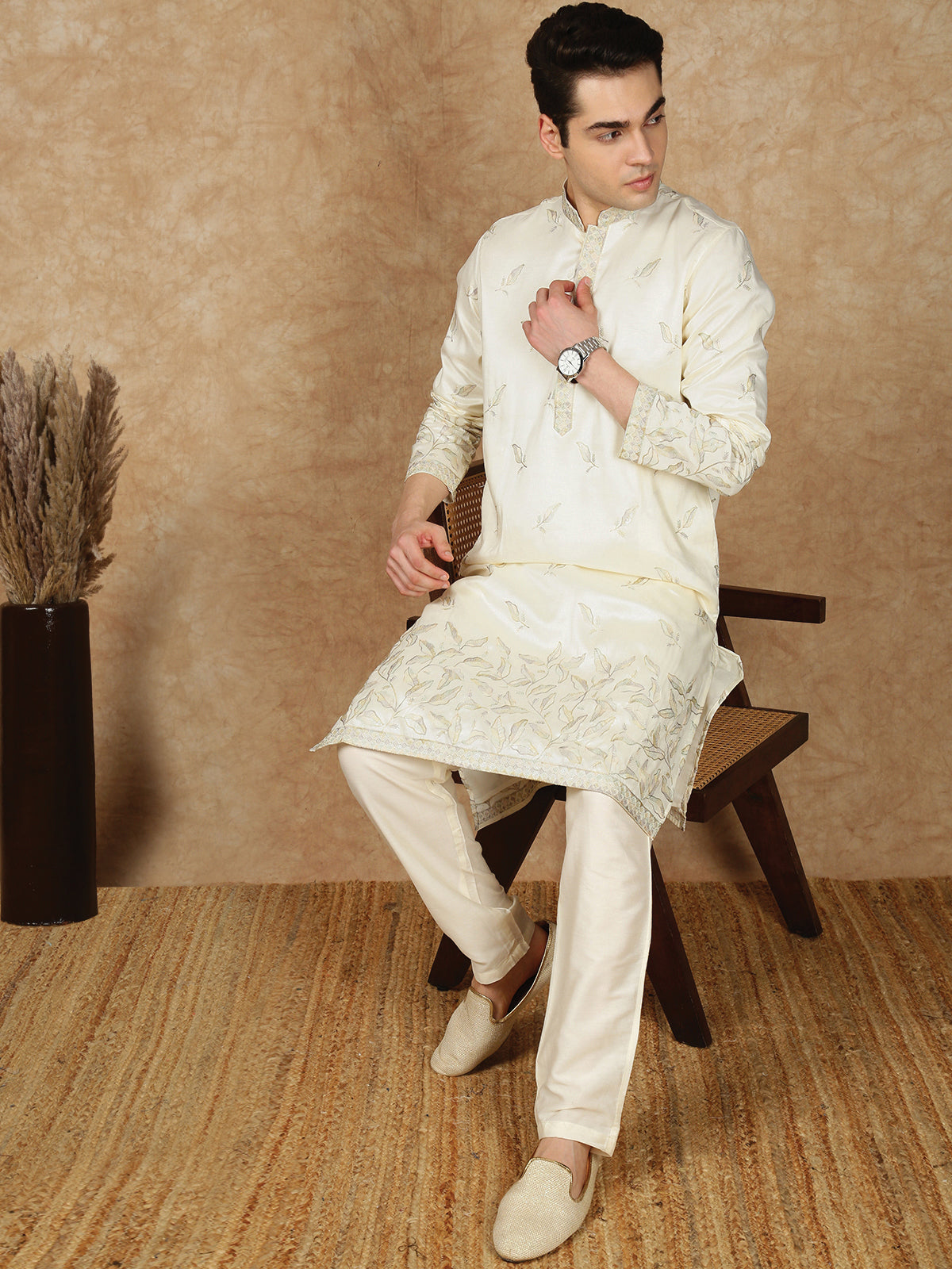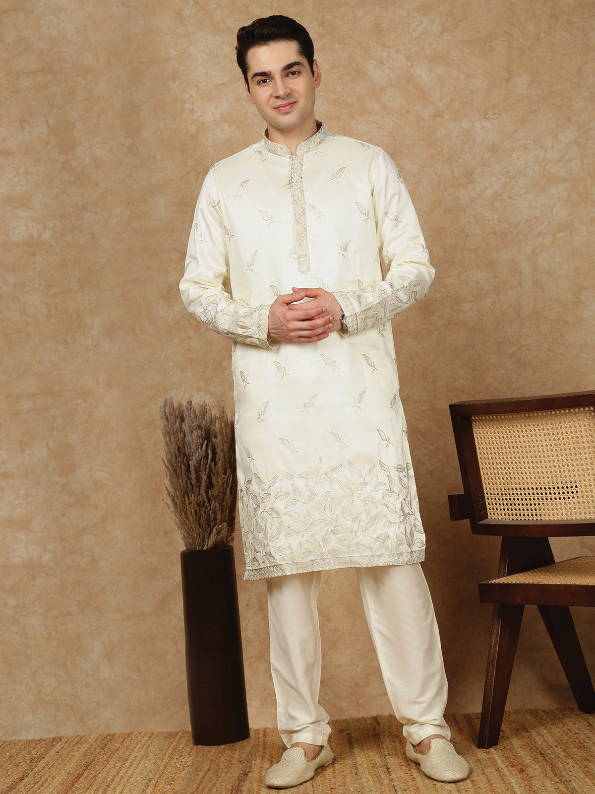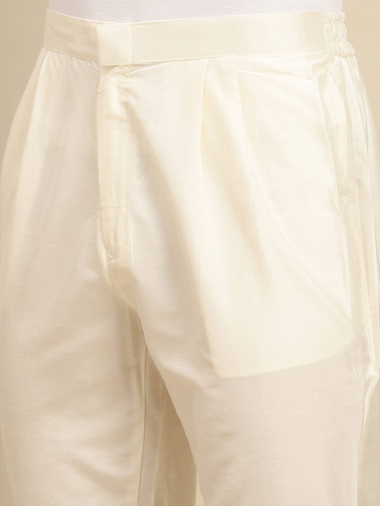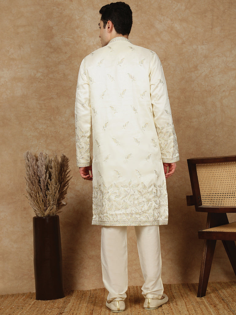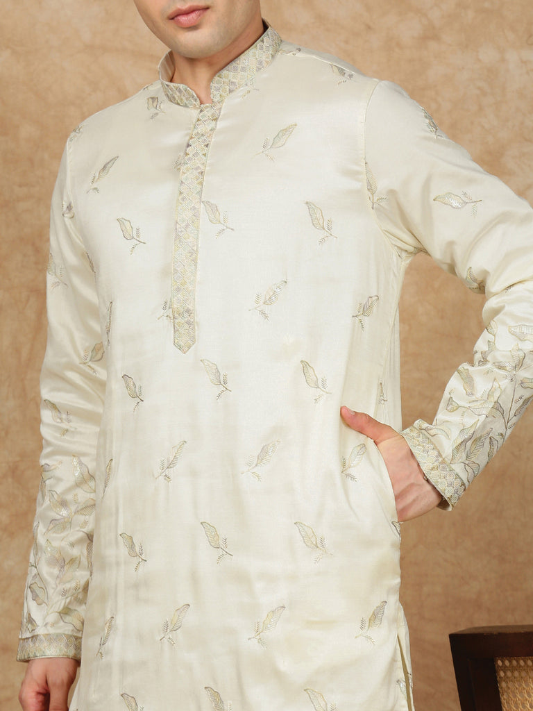 Sanwara Premium Thread Work Cream Silk Blend Kurta Set for Men – Stylish, Comfortable Festival Wear, Ideal for Navratri, Diwali & Cultural Celebrations with Elegant Detailing