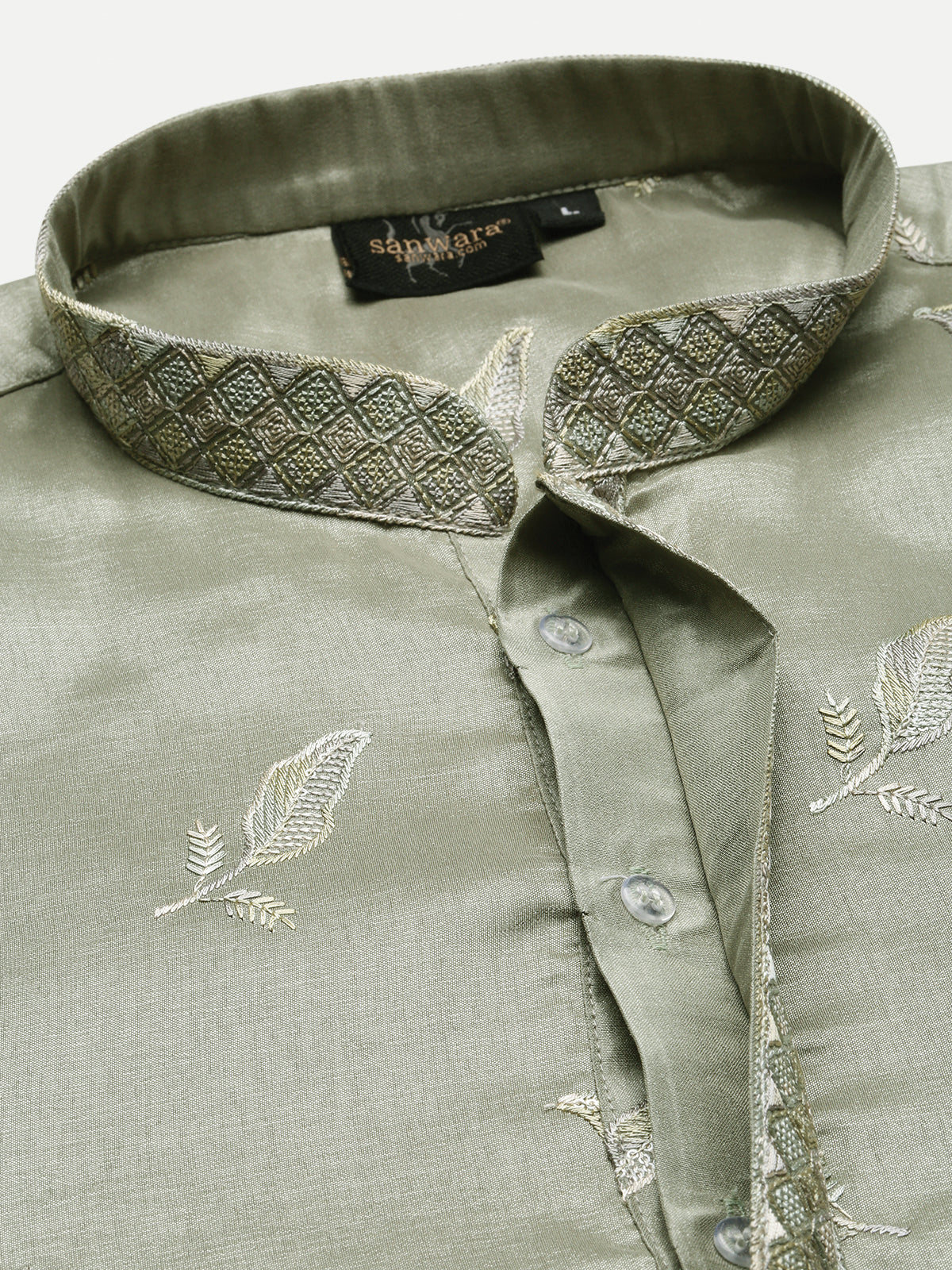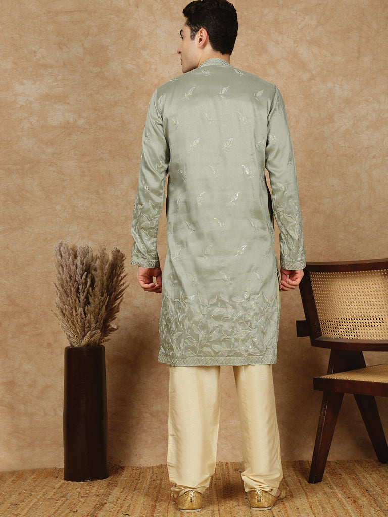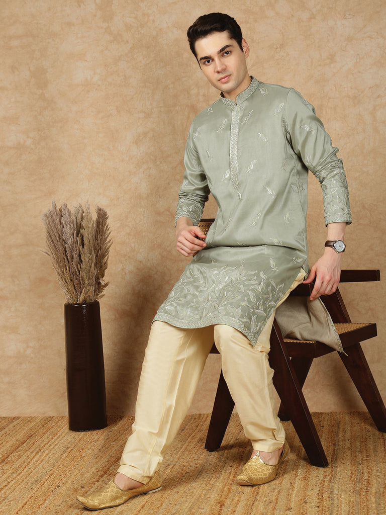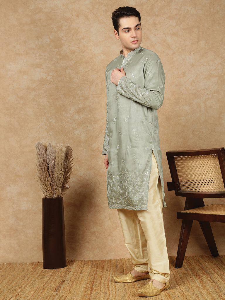 Sanwara Premium Thread Work Steal Green Silk Blend Kurta Set for Men – Stylish, Comfortable Festival Wear, Ideal for Navratri, Diwali & Cultural Celebrations with Elegant Detailing