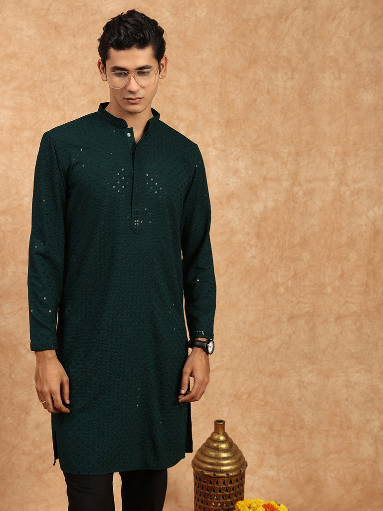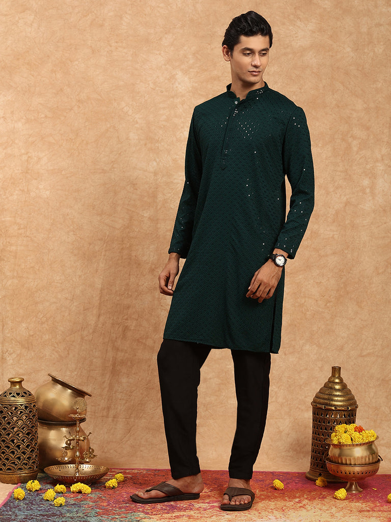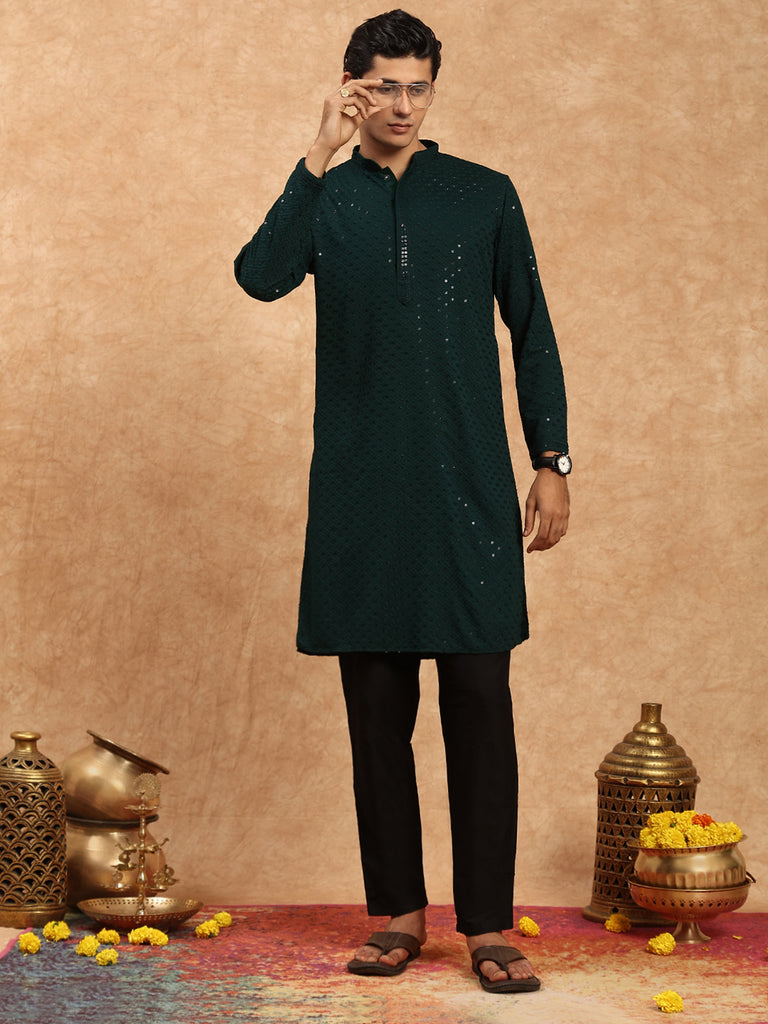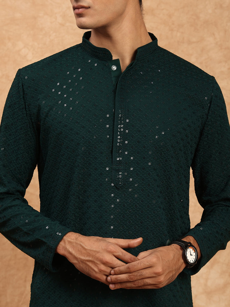 Sanwara Men's Classic Deep Green Chikankari Kurta Set With Sequins Detailing for Every Occasion