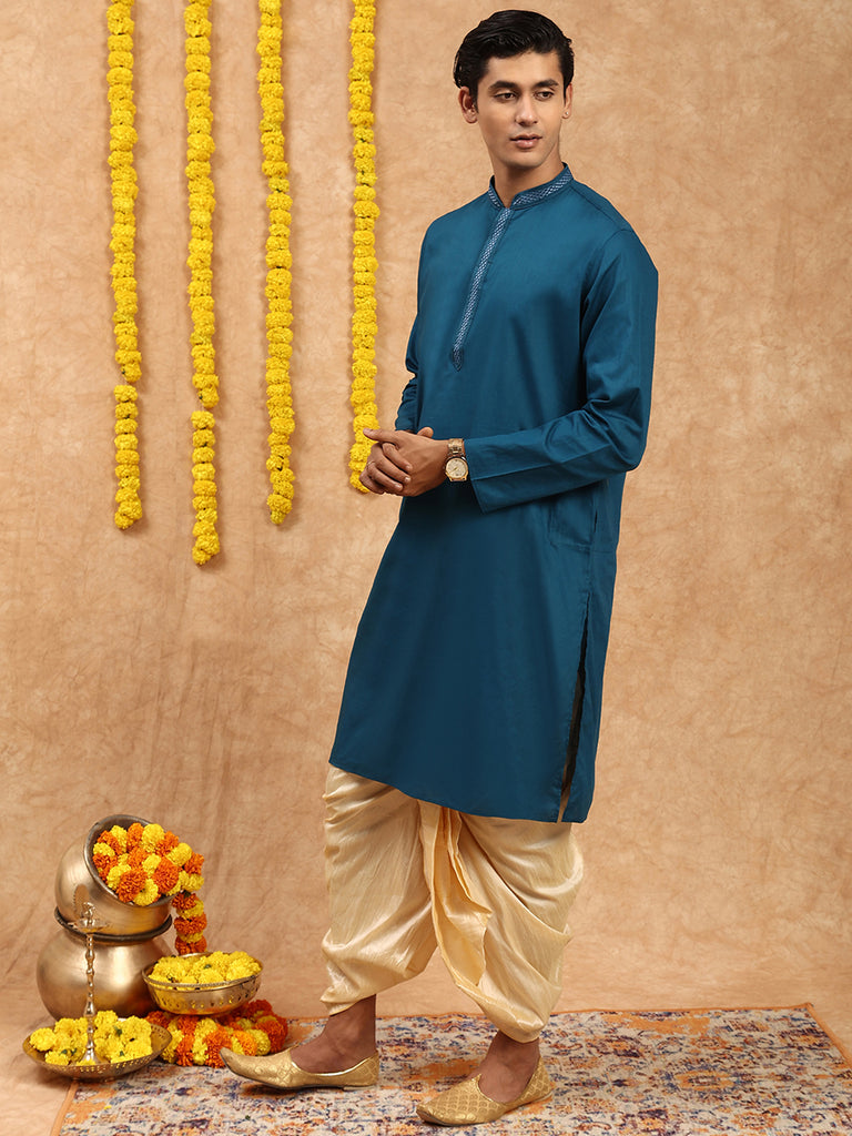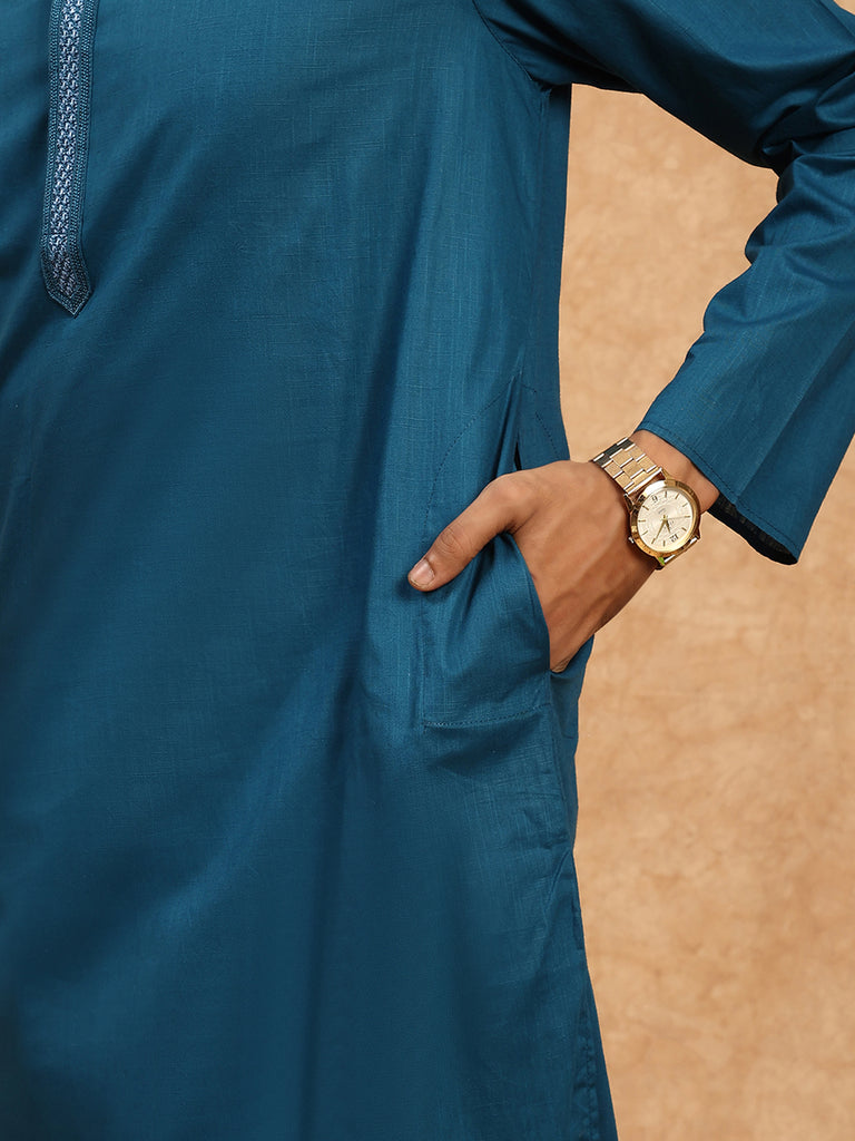 Sanwara Solid Cotton Firozi Collor Work Kurta Set For Men's
