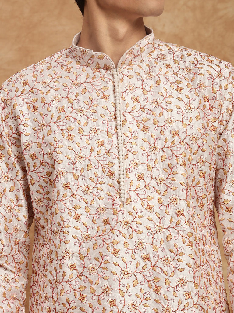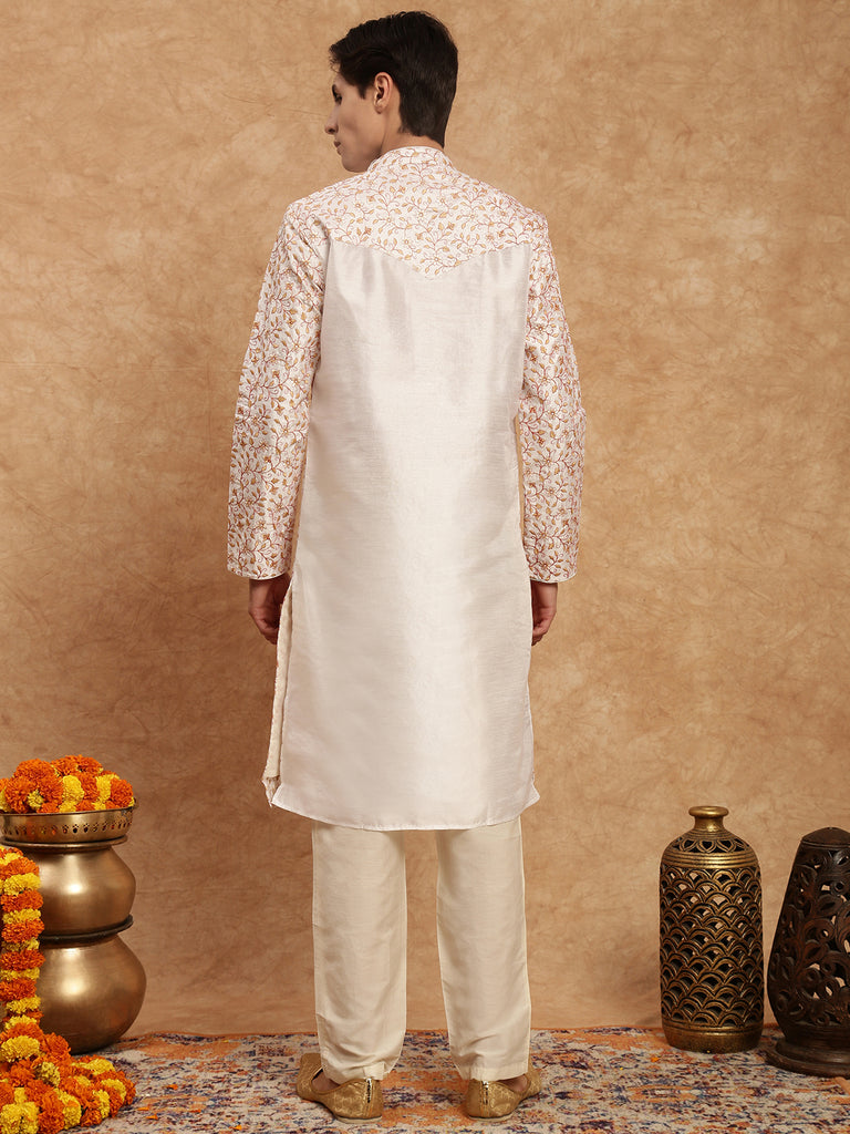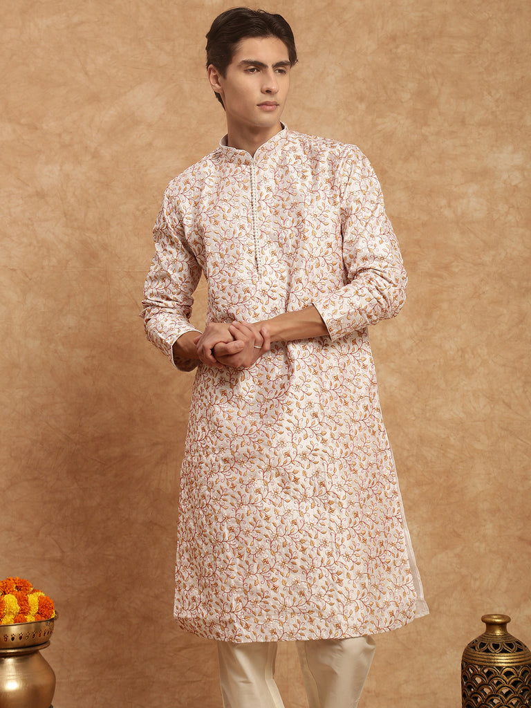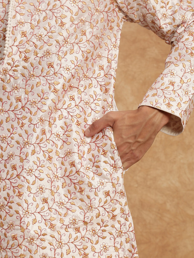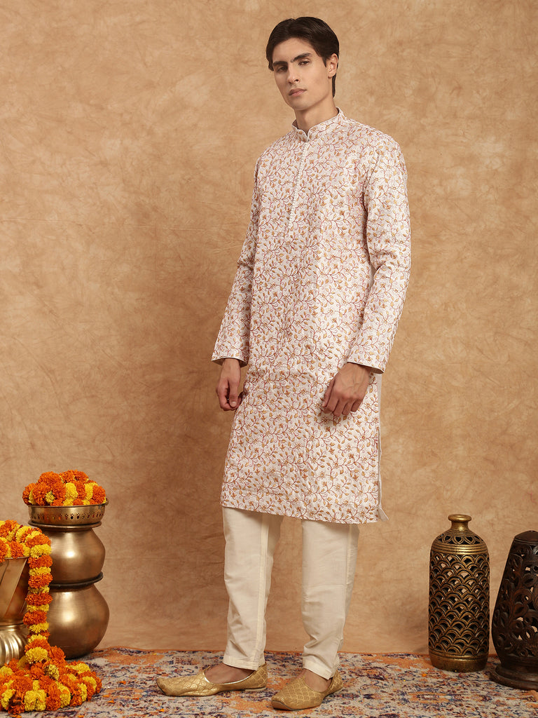 Men's Heritage Printed Work Embroidered Off White Kurta Set In Silk by Sanwara