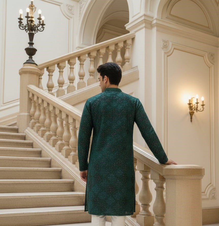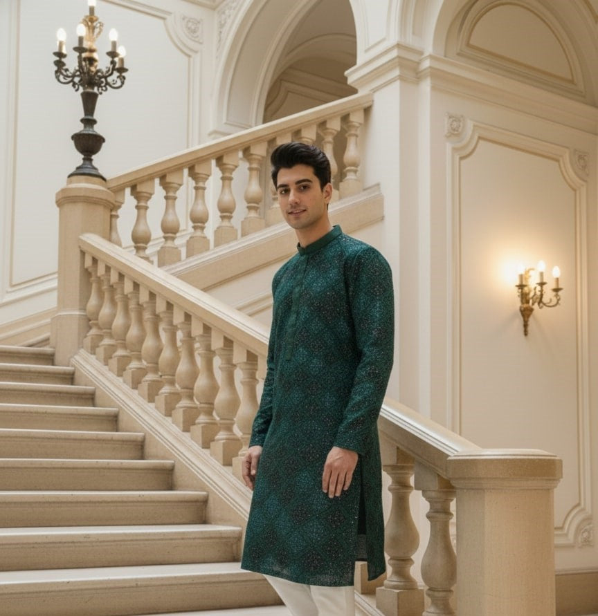 Sanwara Men's Deep Green Solid Kurta with Heavy Sequins Work A Bold Fusion of Floral Splendor