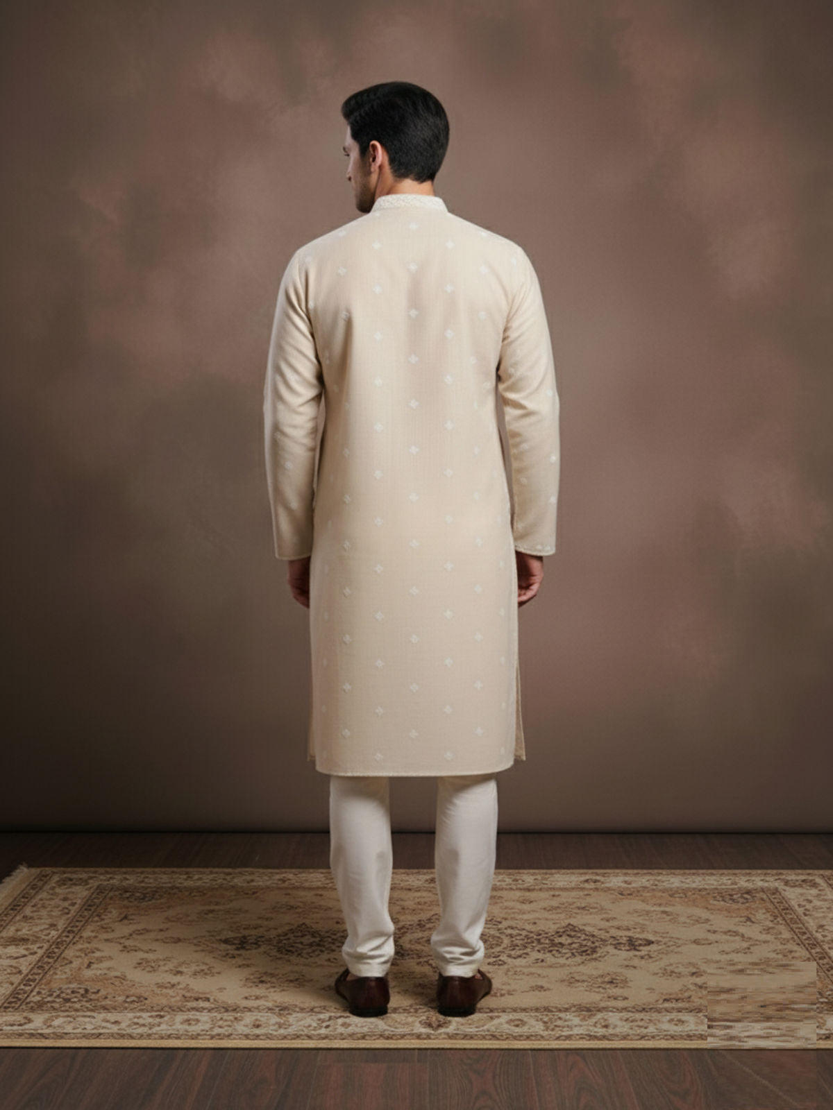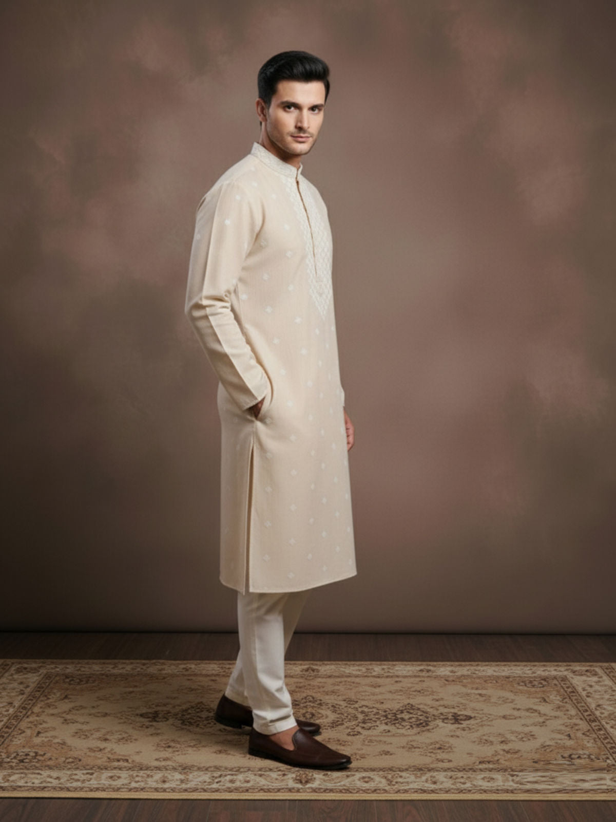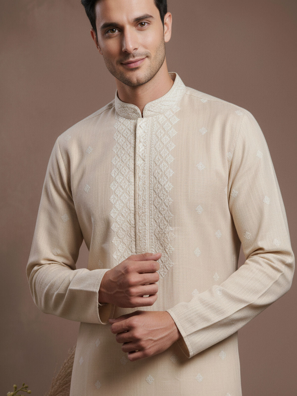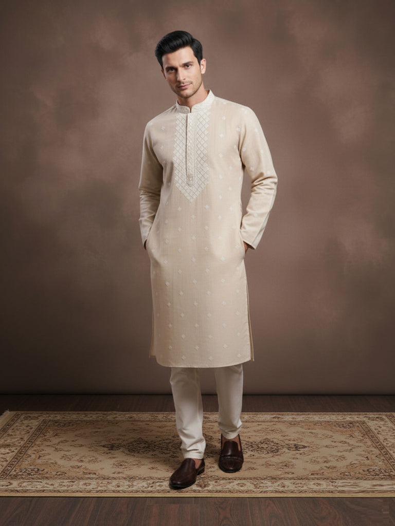 Sanwara Solid Chikankari Linen Beige Kurta for Men