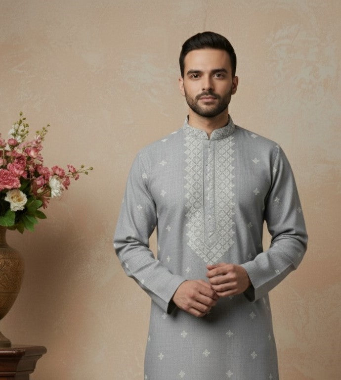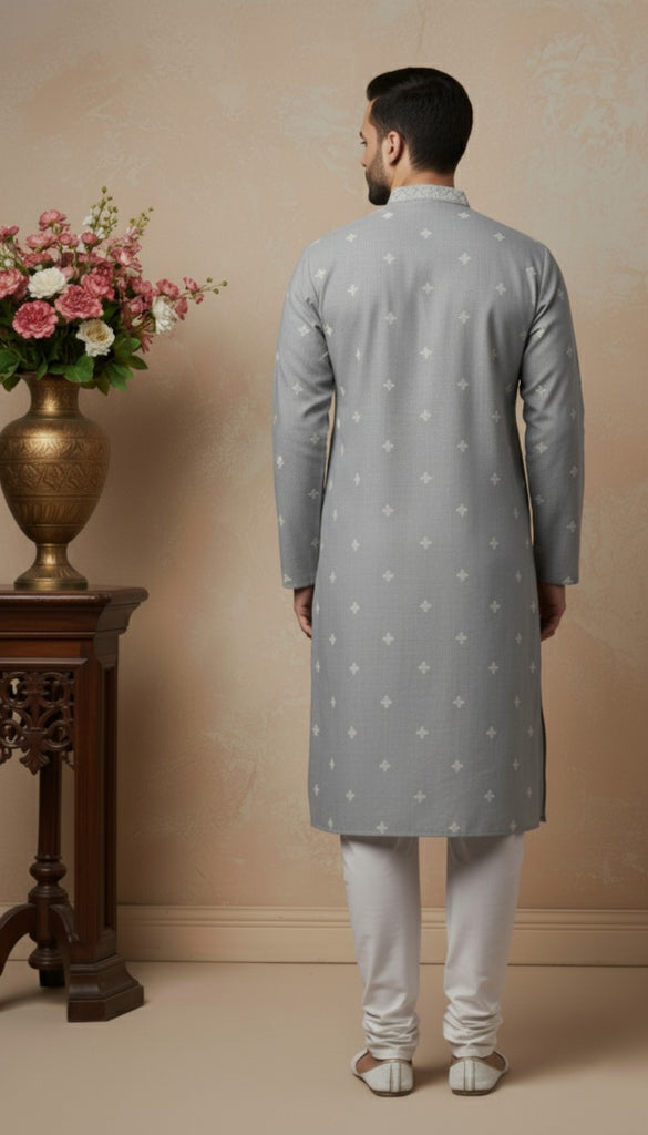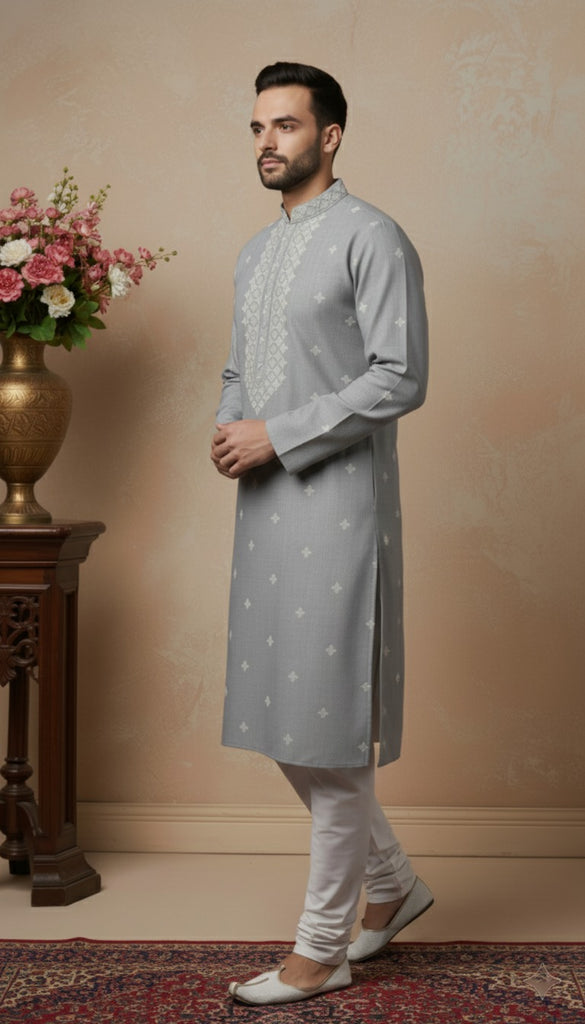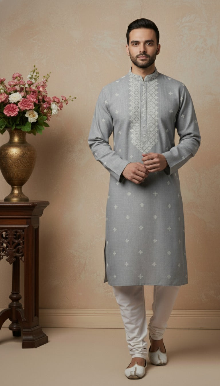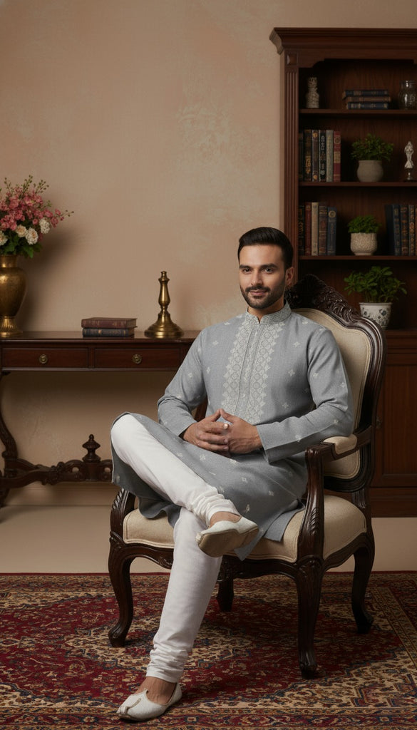 Sanwara Solid Chikankari Linen Grey Kurta for Men