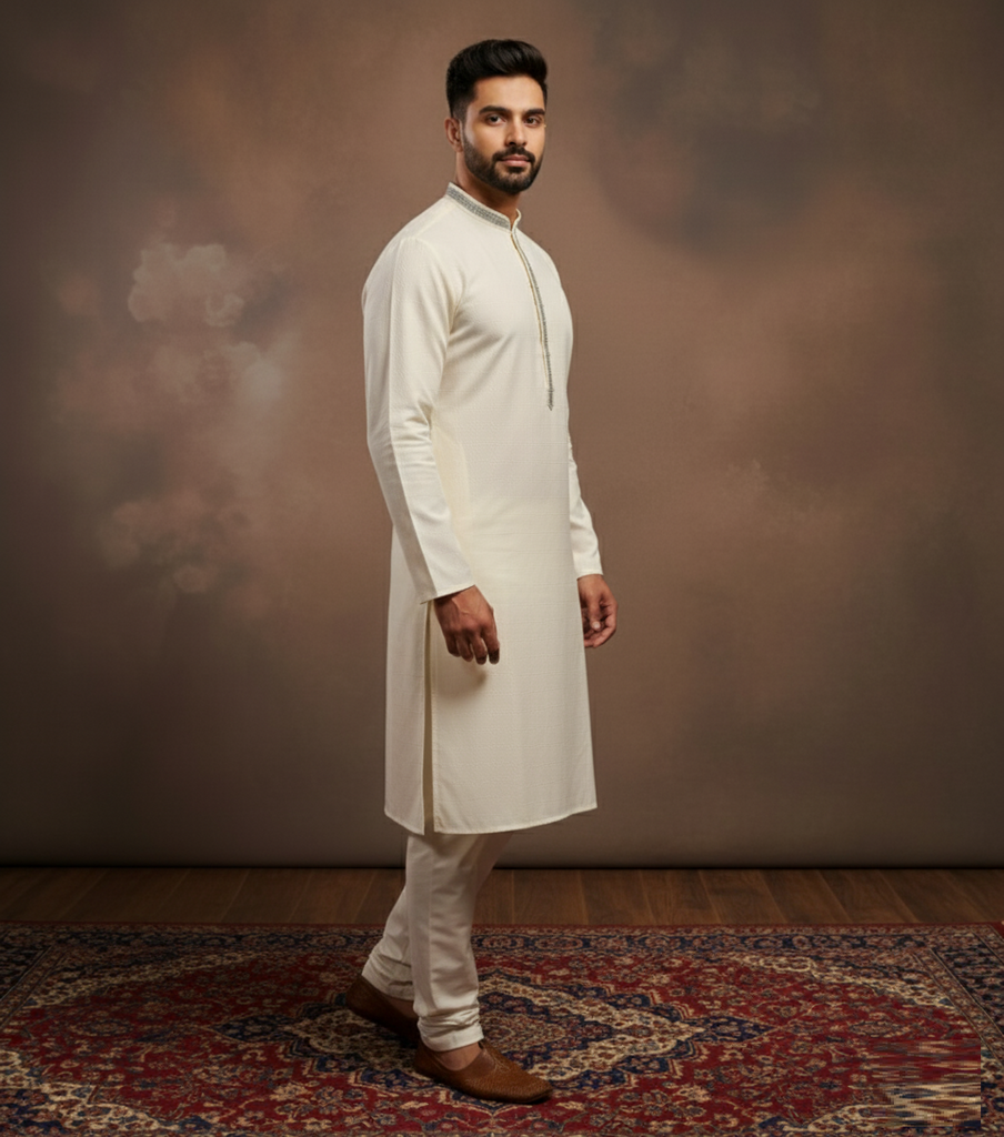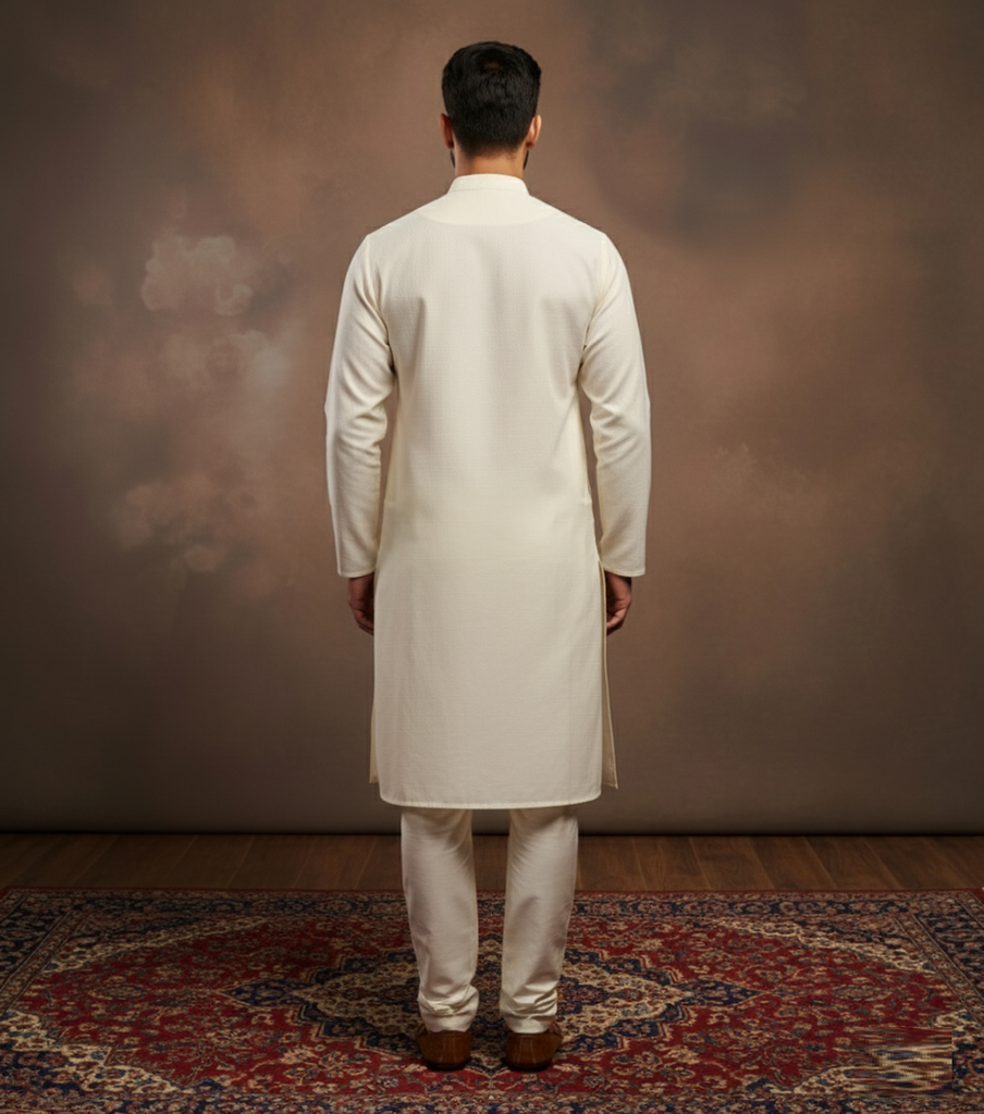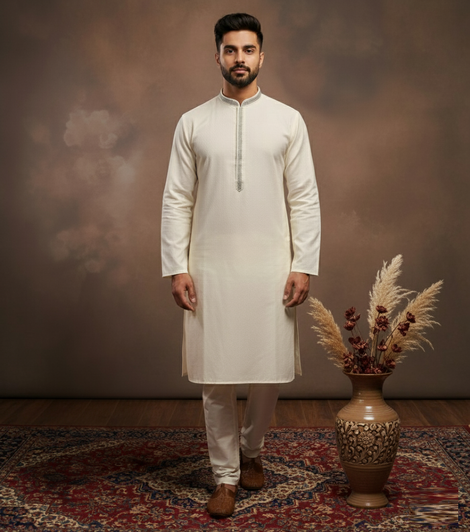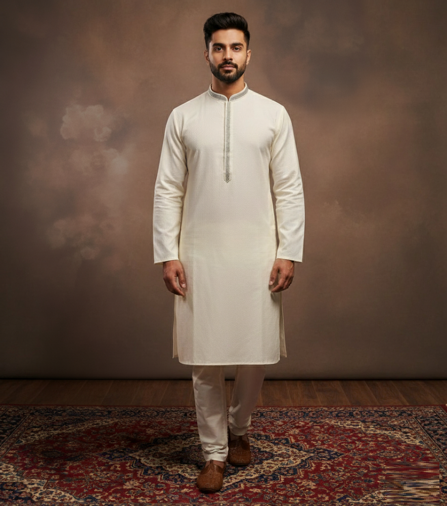 Sanwara Classic Cotton White Self Pattern Kurta for Men