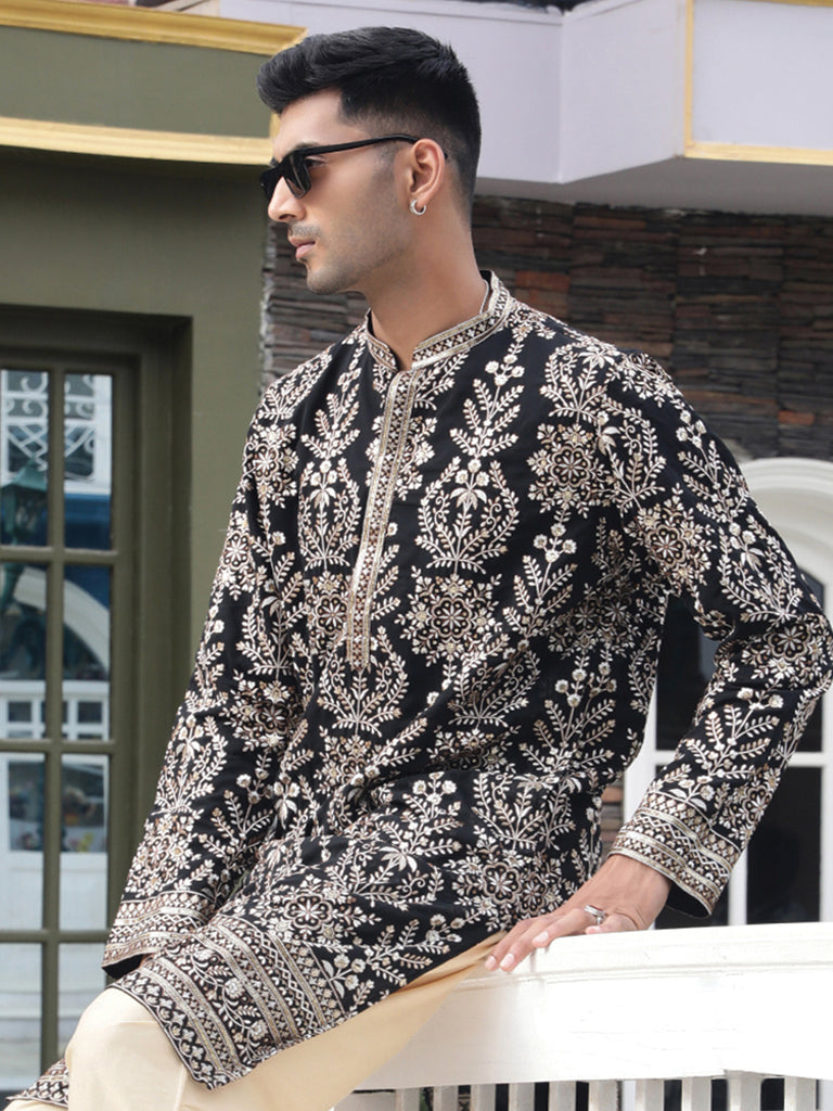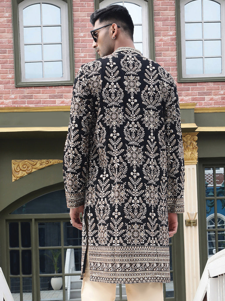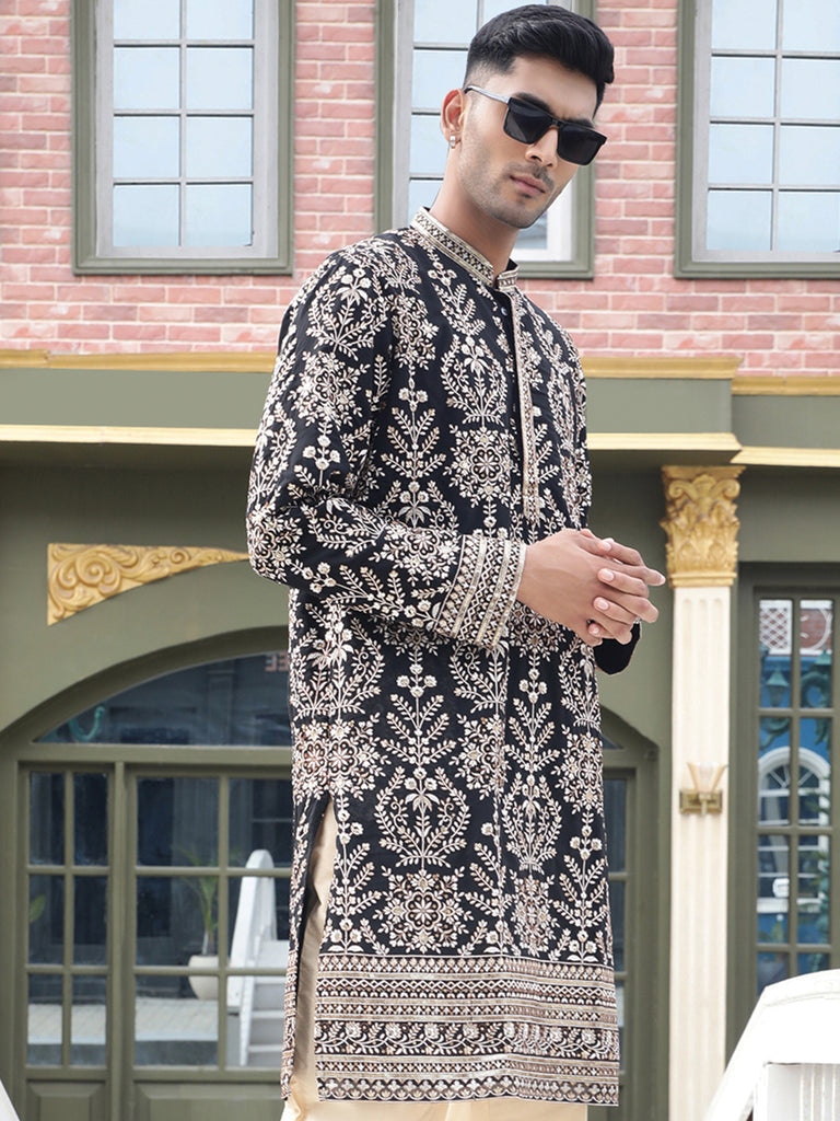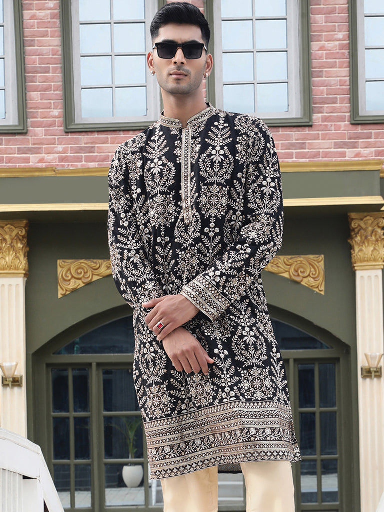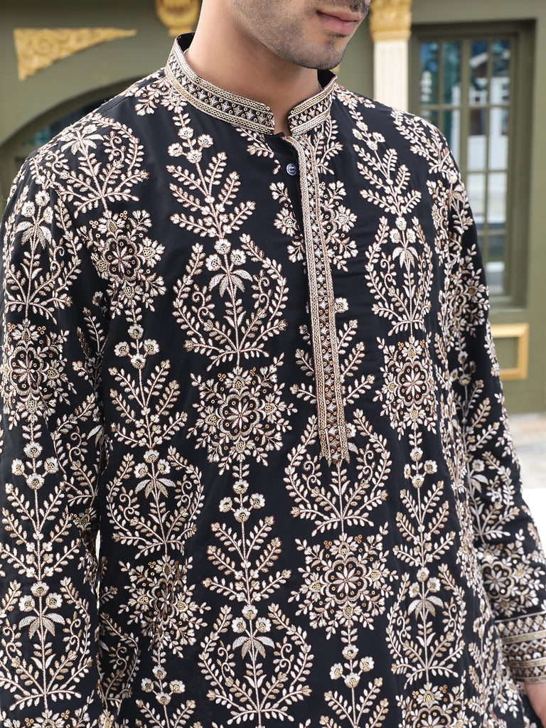 Sanwara Men's Georgette Black Vintage Embroidered Kurta with Alluring Sequin Accents.