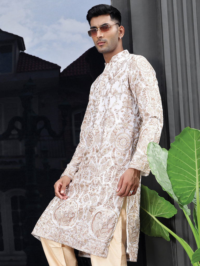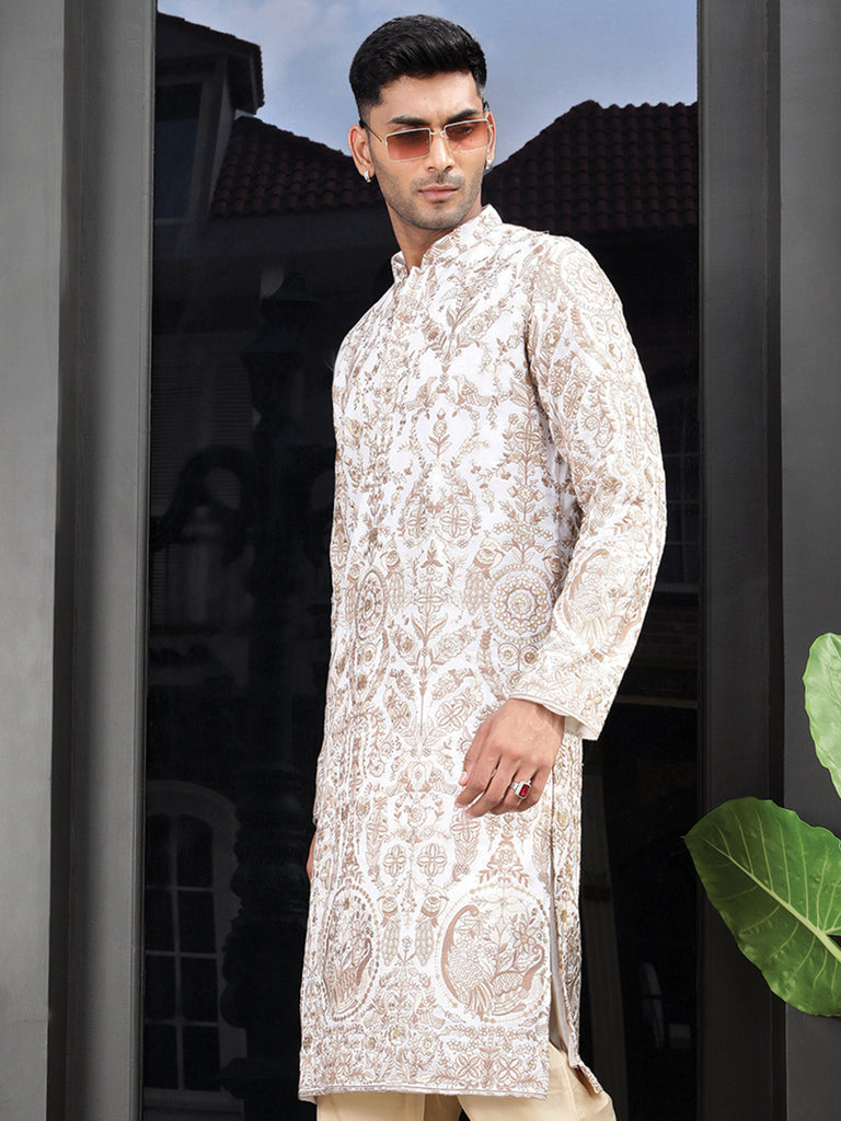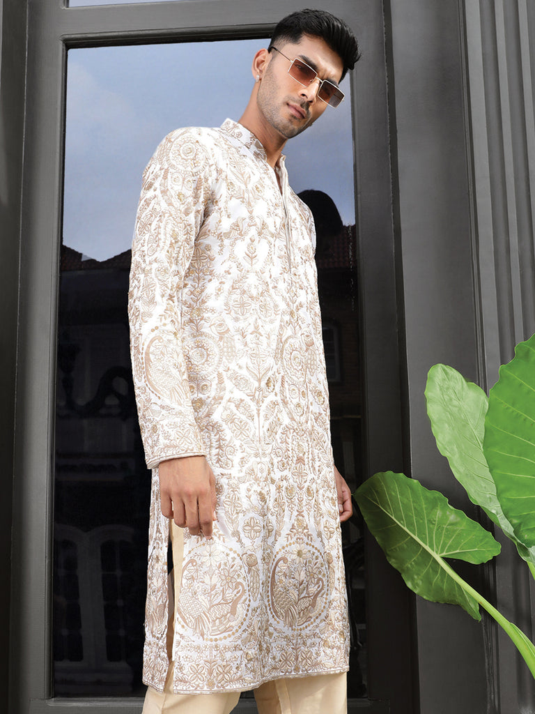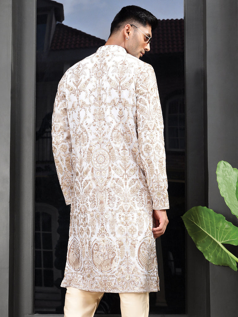 Sanwara Men's White Georgette Sequins With Heritage Embroidered Work Vintage kurtas