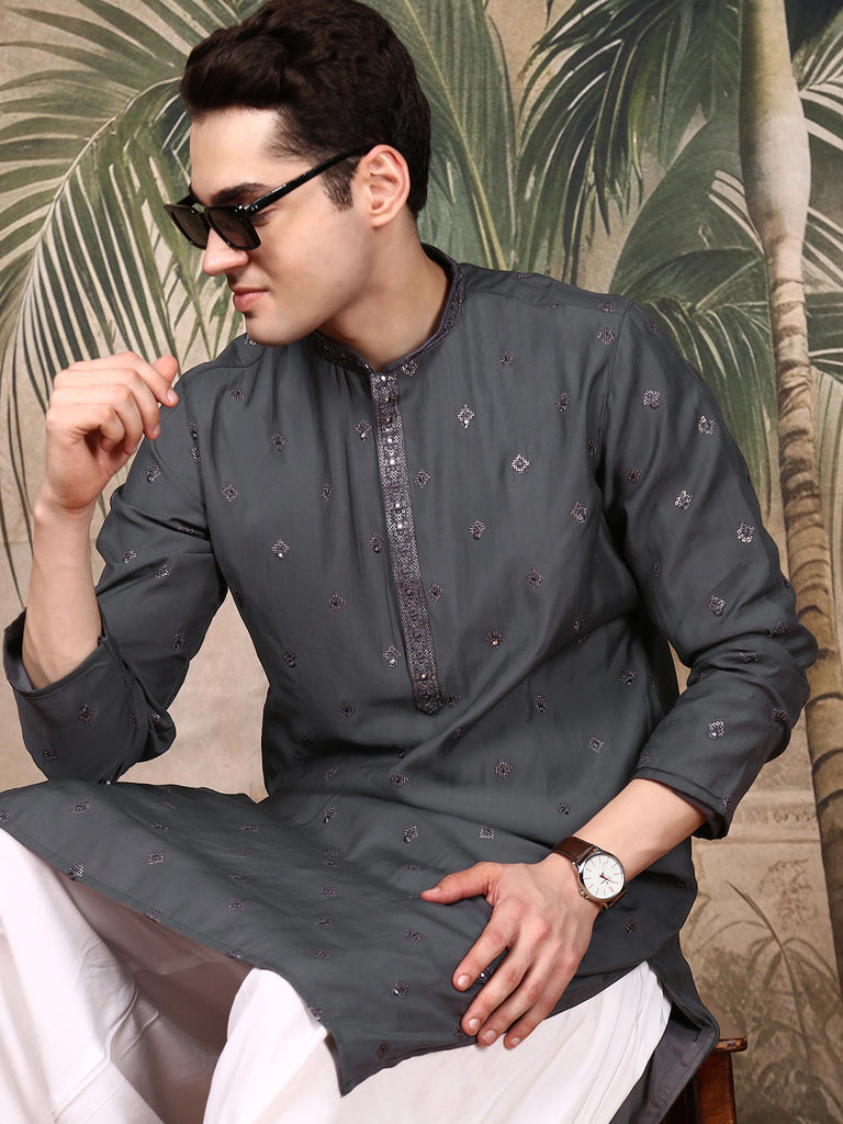 Sanwara Men’s Grey Designer Sequins Work Kurta in Rich Silk Blend Featuring Contemporary Flair for Festive Navratri Diwali Occasions