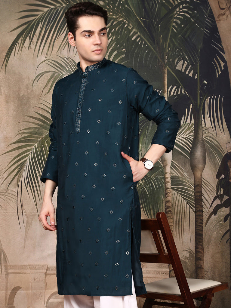 Sanwara Men’s Deep Blue Designer Sequins Work Kurta in Rich Silk Blend Featuring Contemporary Flair for Festive Navratri Diwali Occasions