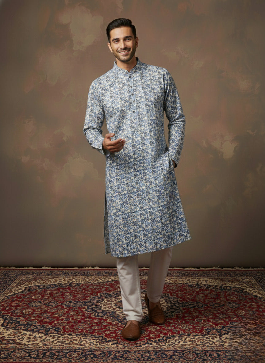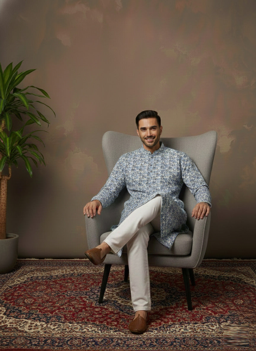 Sanwara Presents a Lavish Cotton Blue Men’s Kurta Set with Rich Sequin and Printed Work