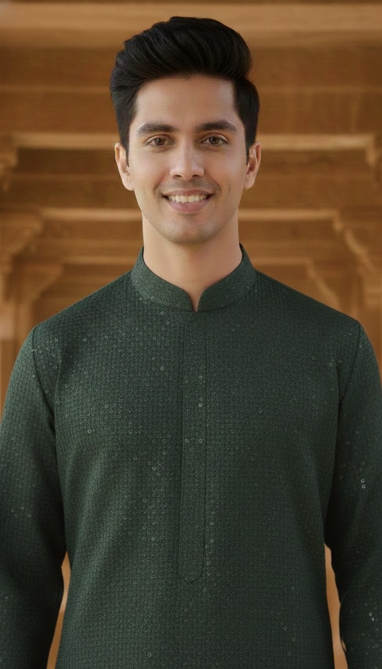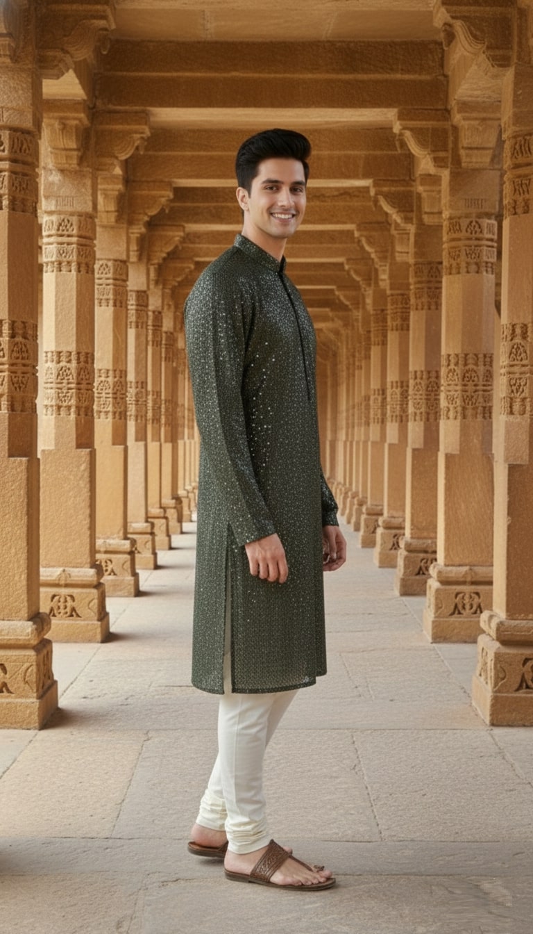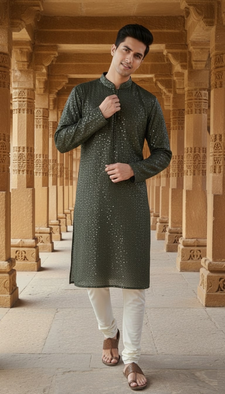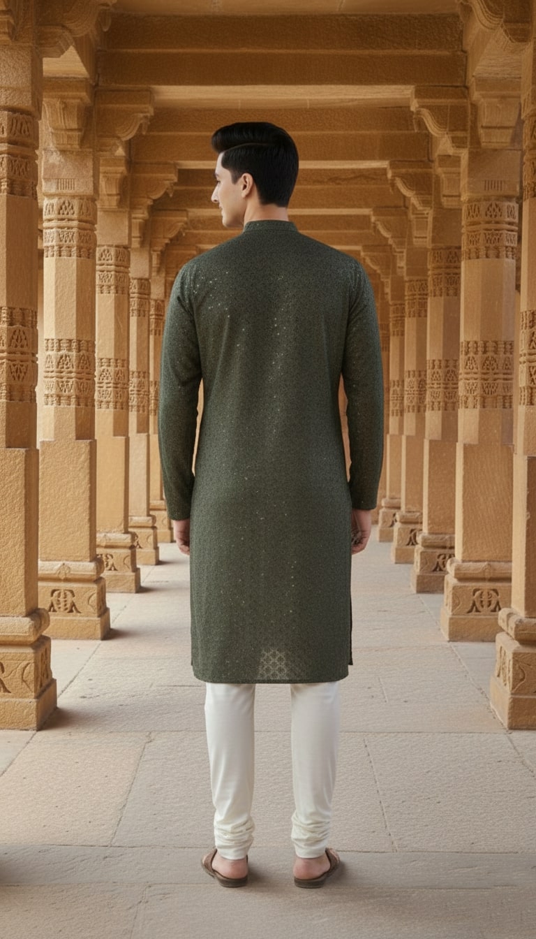 Sanwara Mens Designer Olive Coloured Kurta Set Featuring With Sequins with A Graceful Fusion