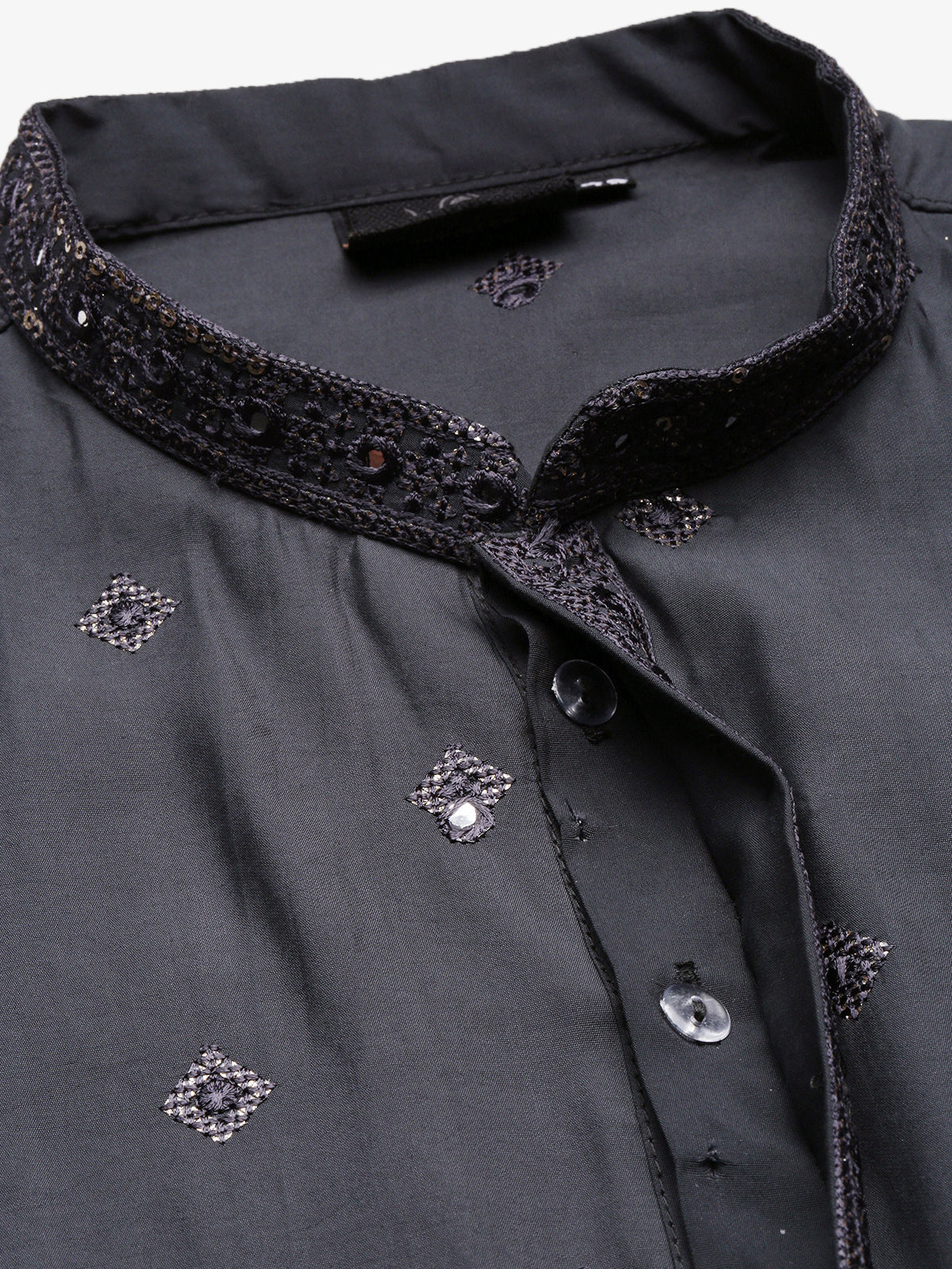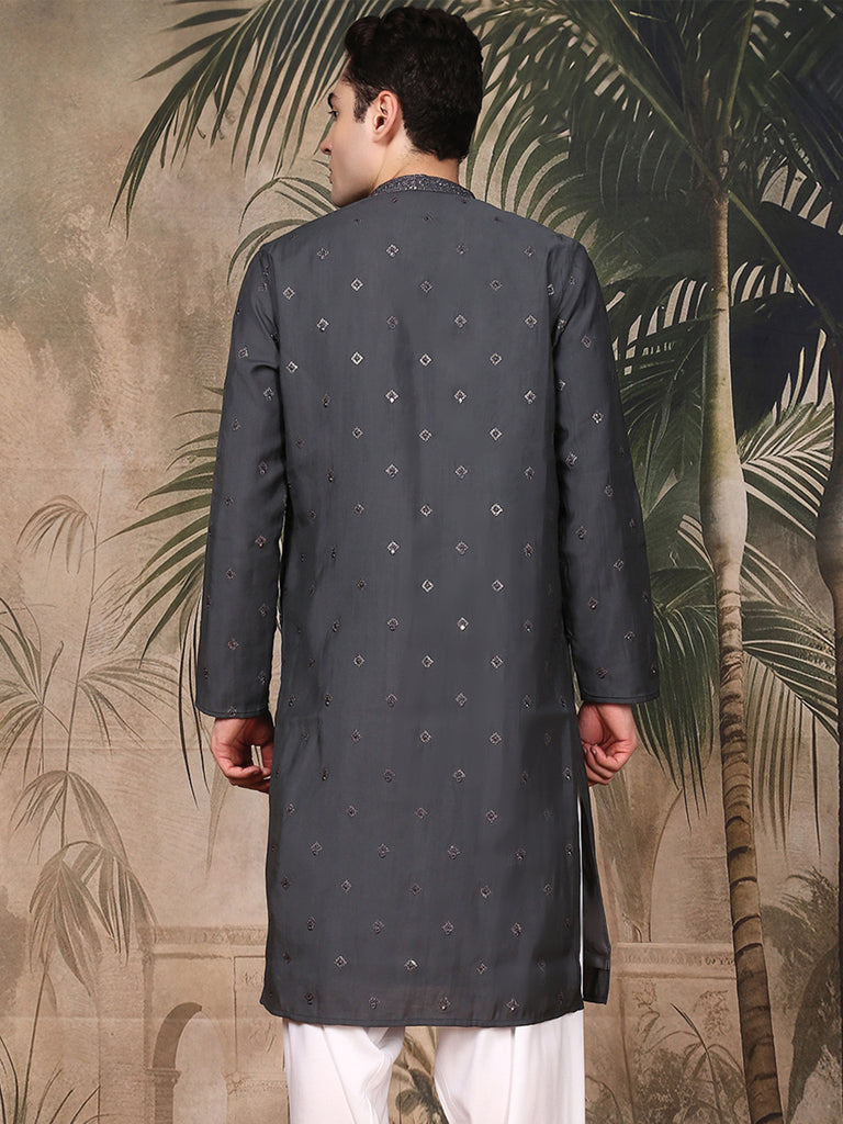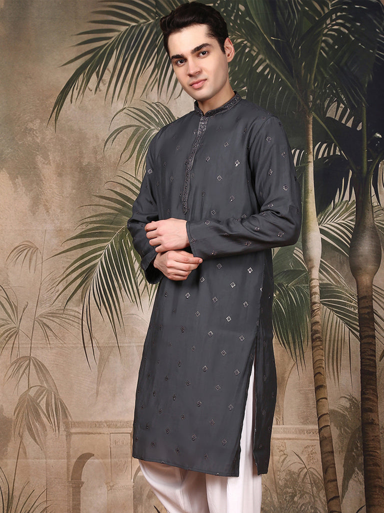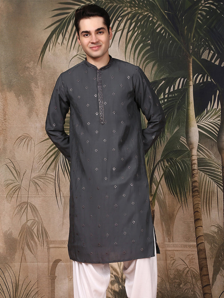 Sanwara Men’s Grey Designer Sequins Work Kurta in Rich Silk Blend Featuring Contemporary Flair for Festive Navratri Diwali Occasions