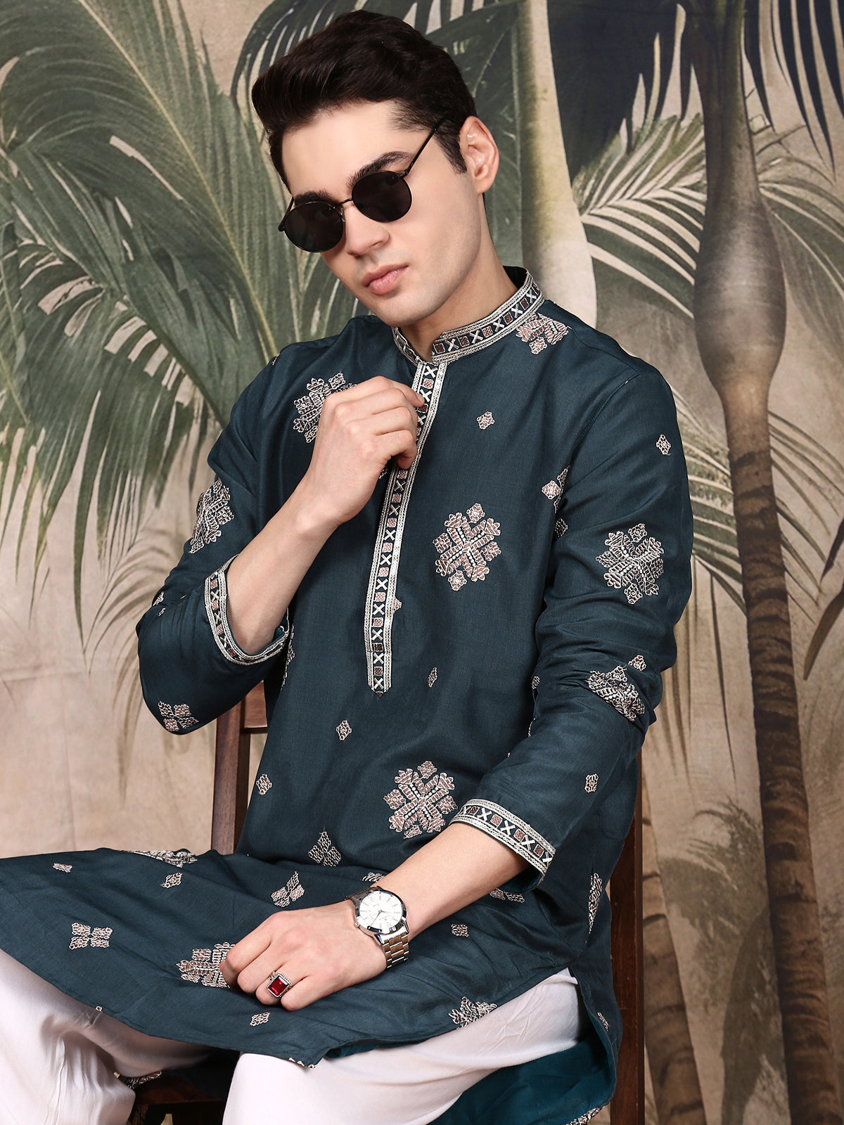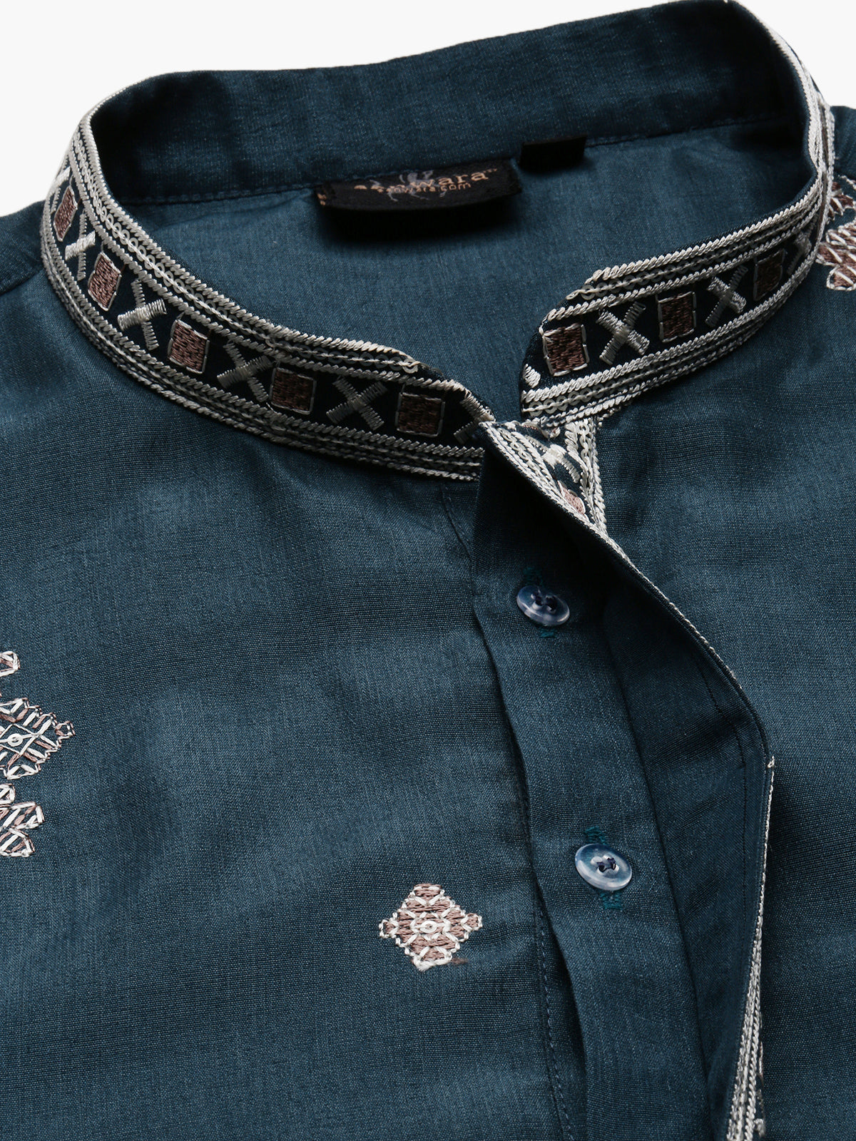 This men's kurta is meticulously crafted from premium fabric, ensuring a perfect blend of comfort and style. The mandarin collar elevates its traditional charm, bringing a touch of regal sophistication to your ethnic ensemble. Featuring a straight hem with side slits, it offers effortless movement while maintaining a sharp, contemporary silhouette.Two side pockets blend the elegance of this classic ethnic wear piece