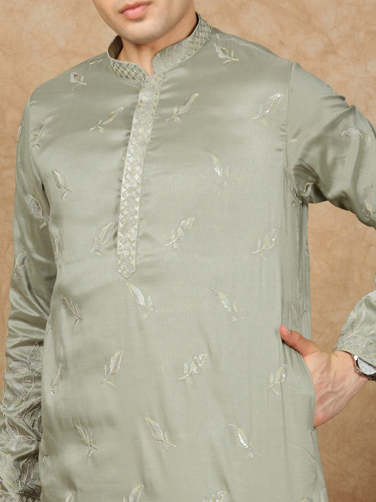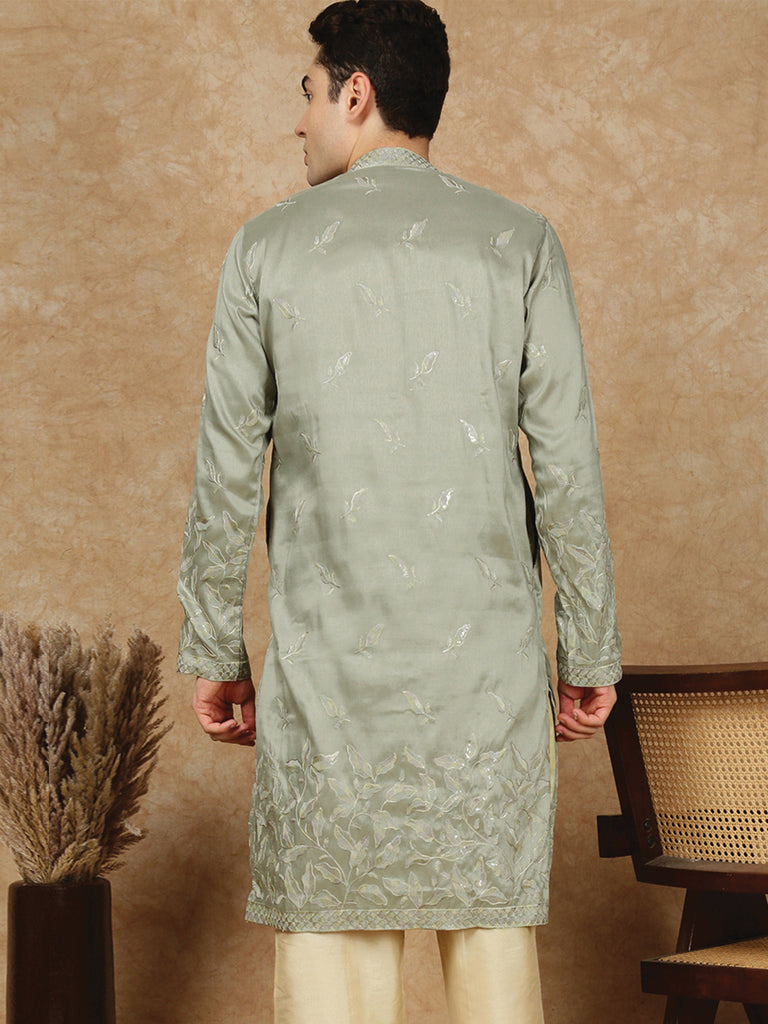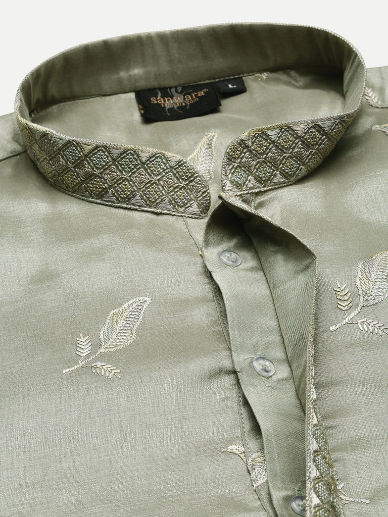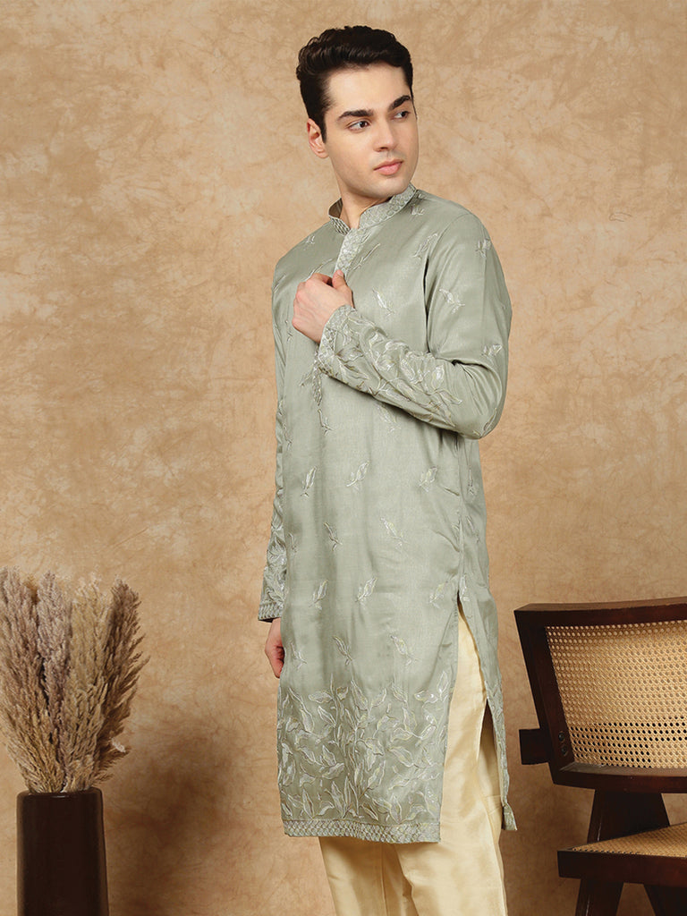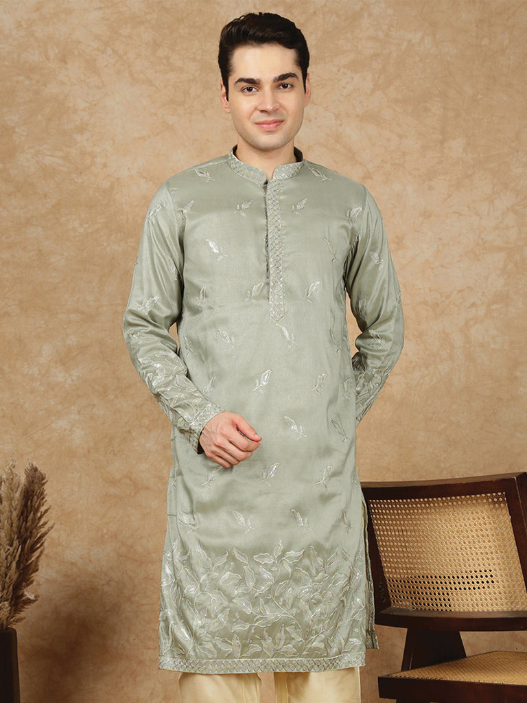 Sanwara Premium Thread Work Steal Green Silk Blend Kurta for Men – Stylish, Comfortable Festival Wear, Ideal for Navratri, Diwali & Cultural Celebrations with Elegant Detailing