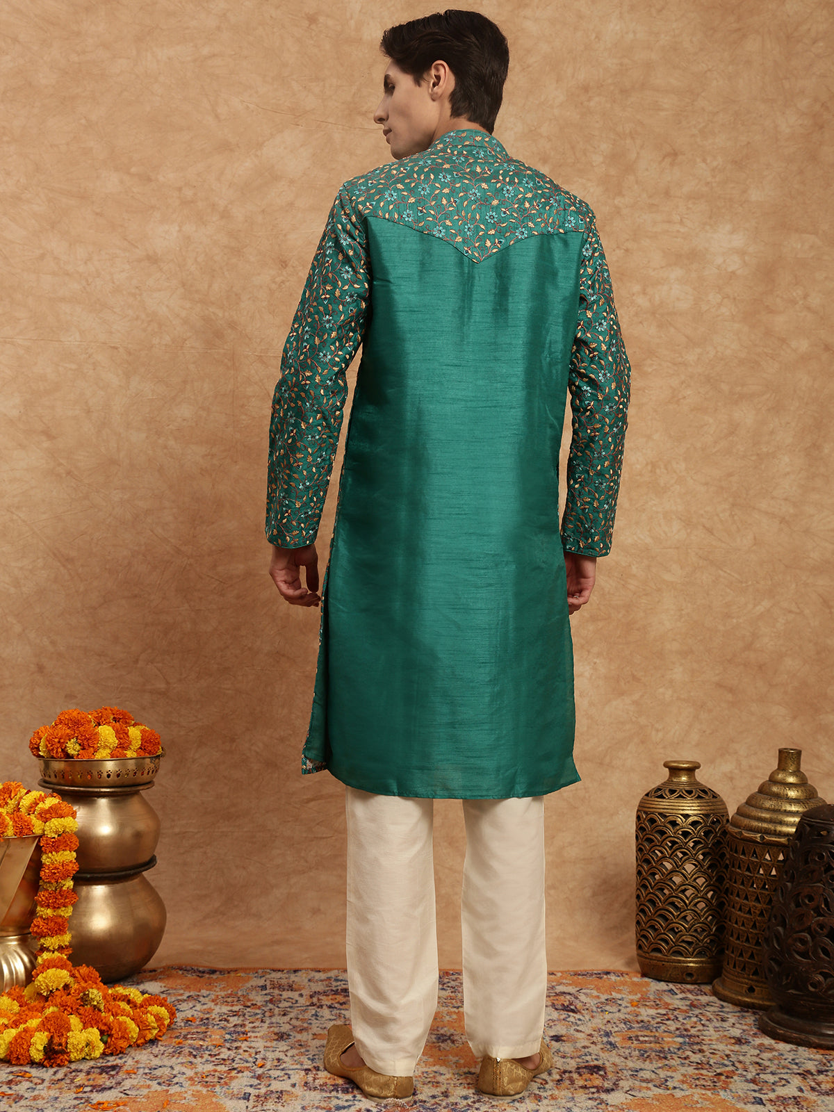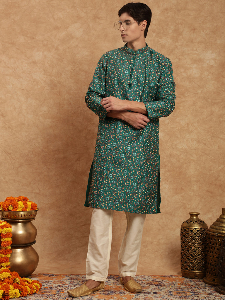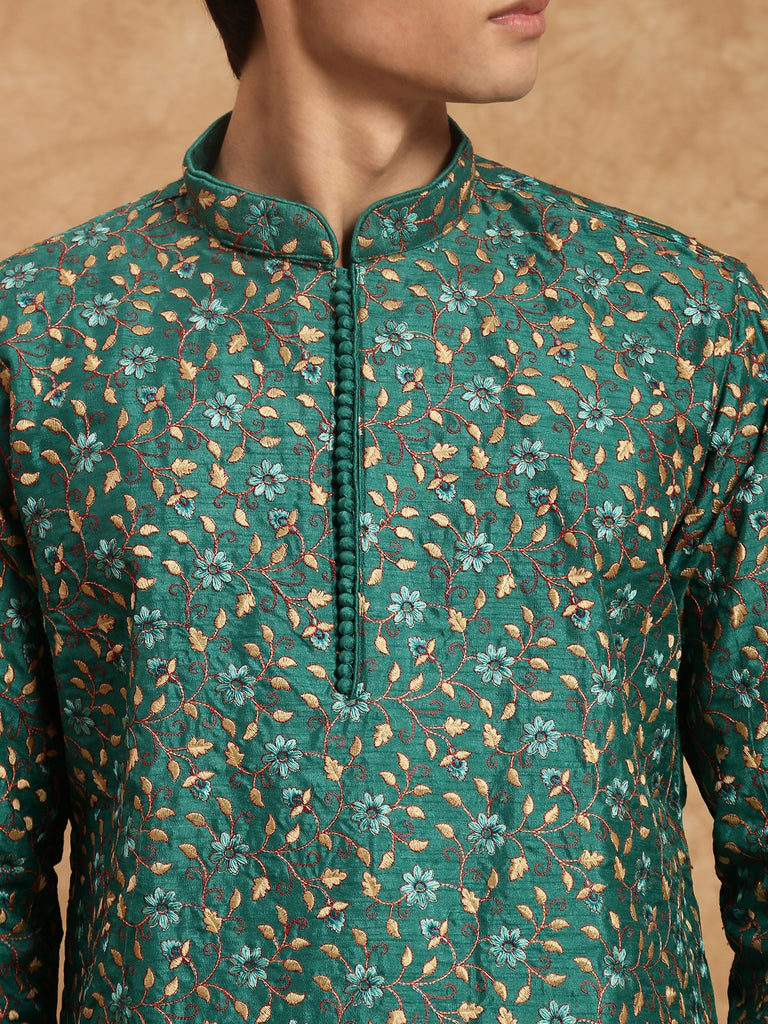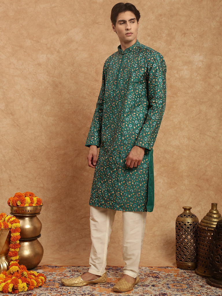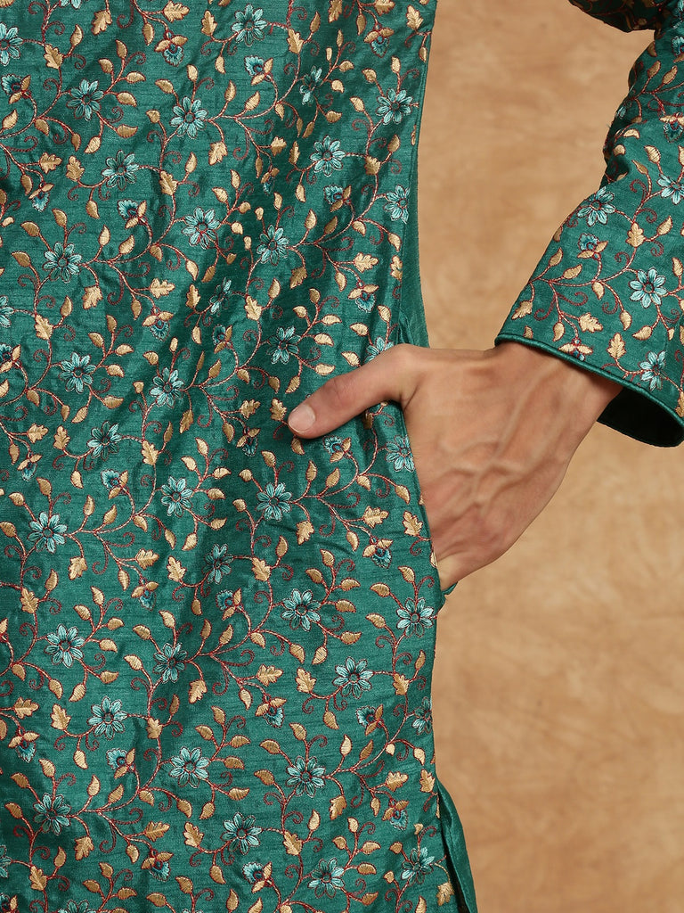 Men's Heritage Printed Work Embroidered Green Kurta In Silk by Sanwara