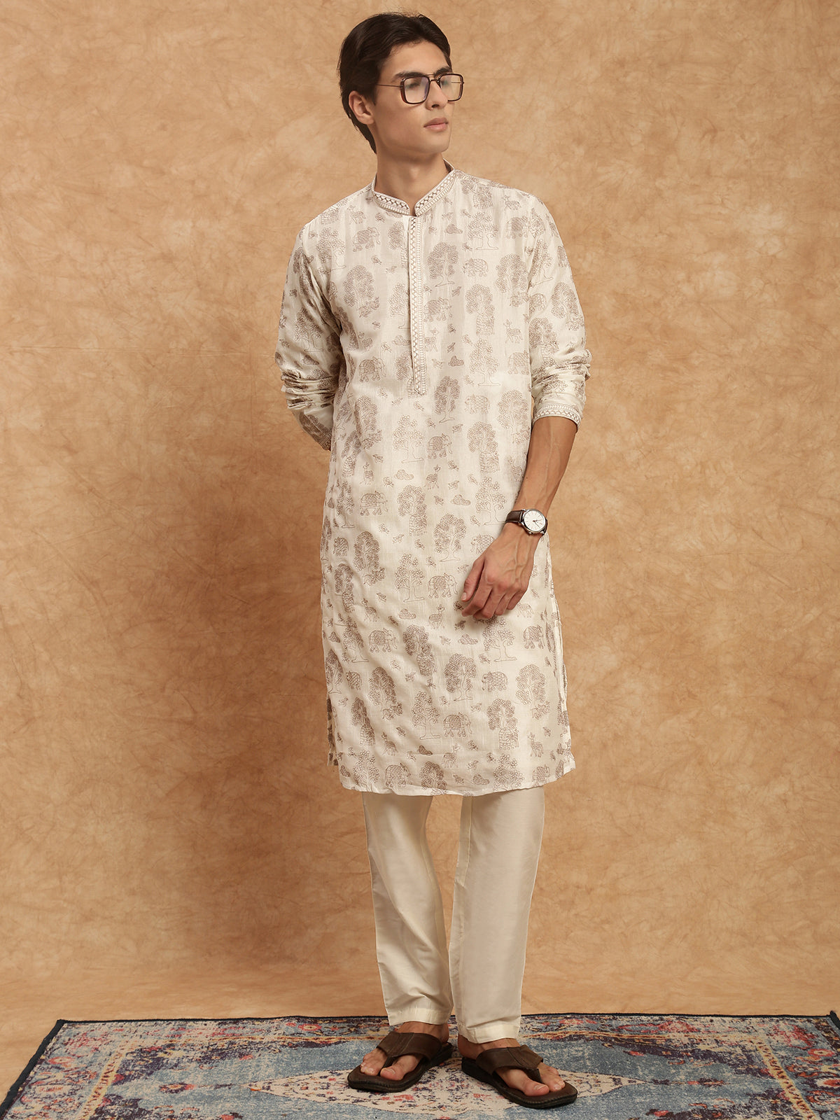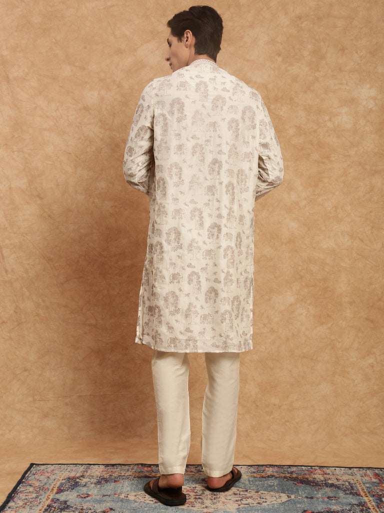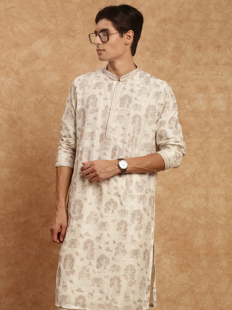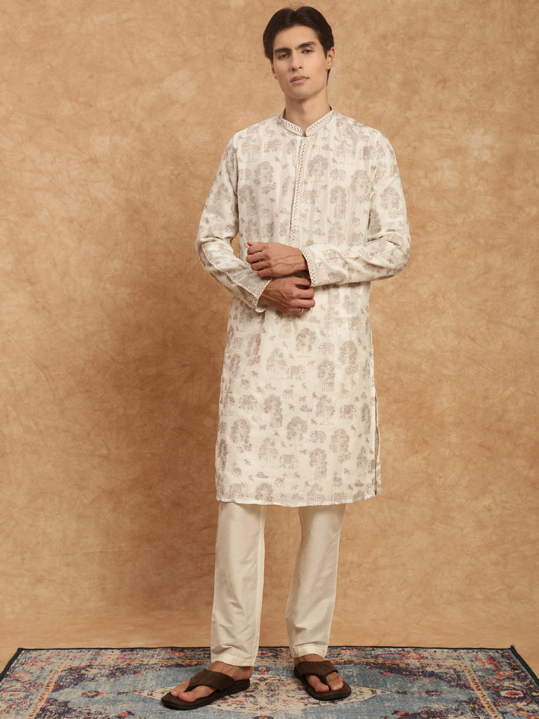 Men's Heritage Thread Work Off White Embroidered Kurta In Silk by Sanwara