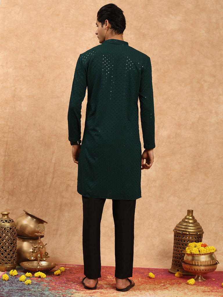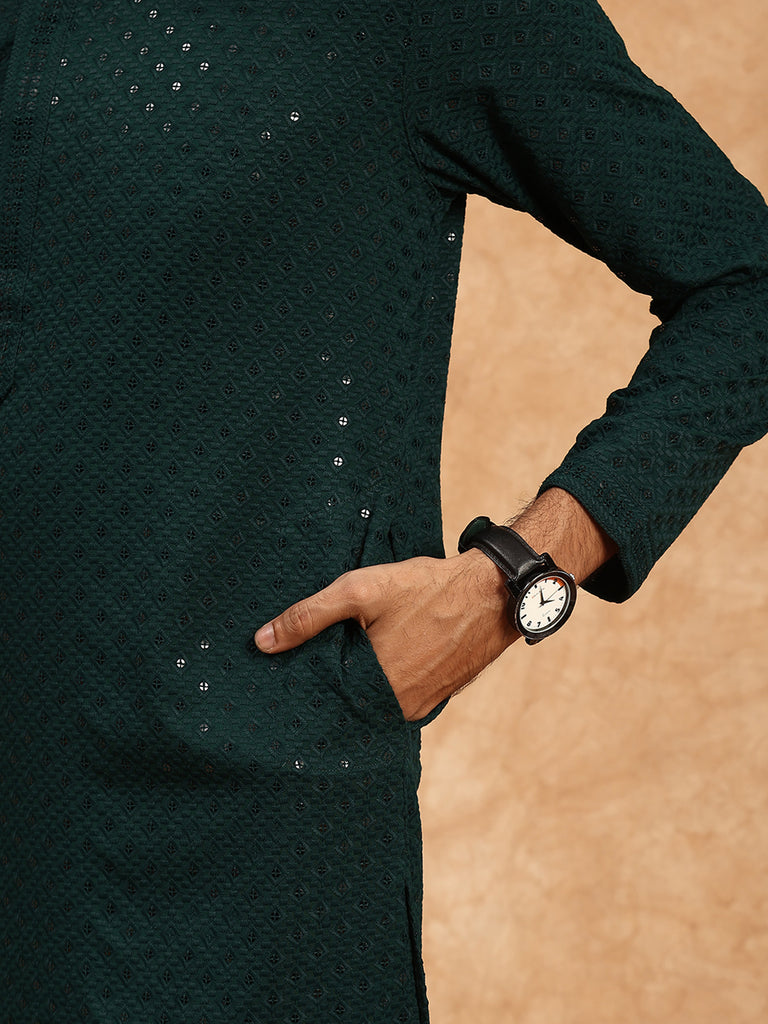 Sanwara Men's Classic Deep Green Chikankari Kurta With Sequins Detailing for Every Occasion