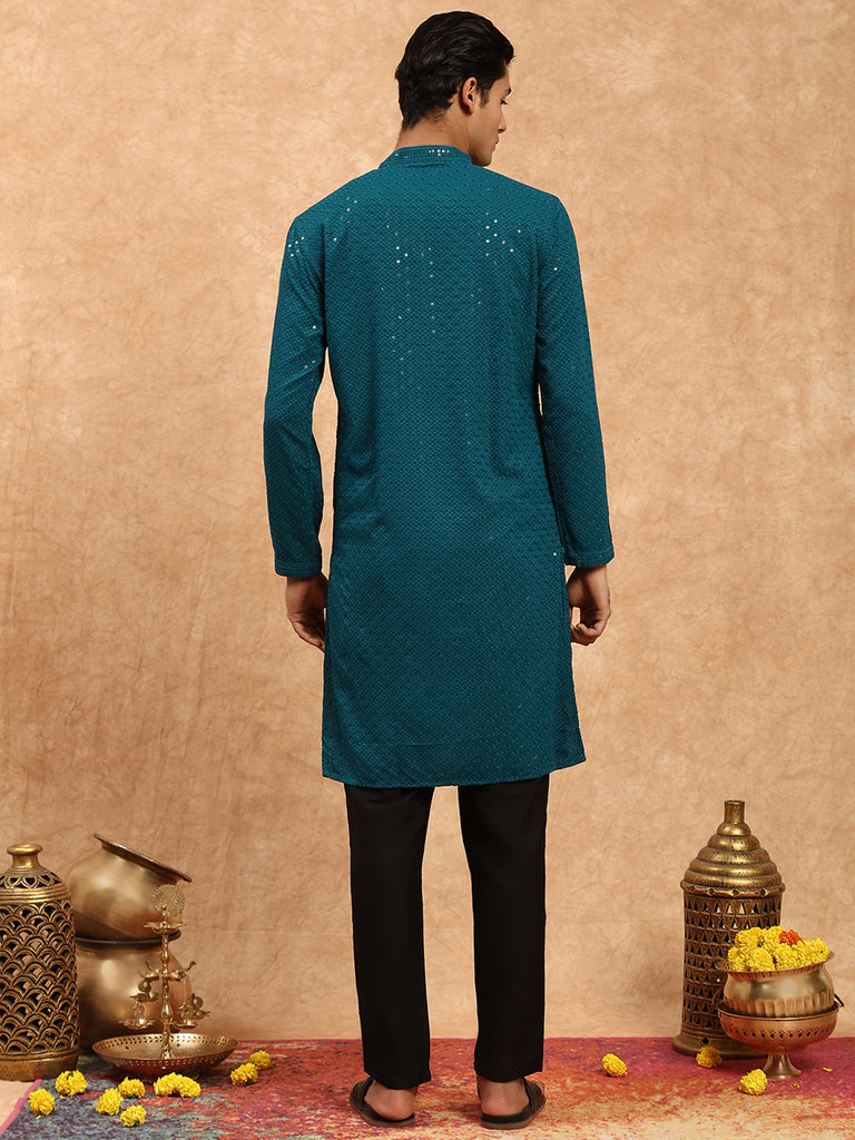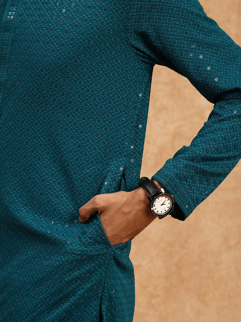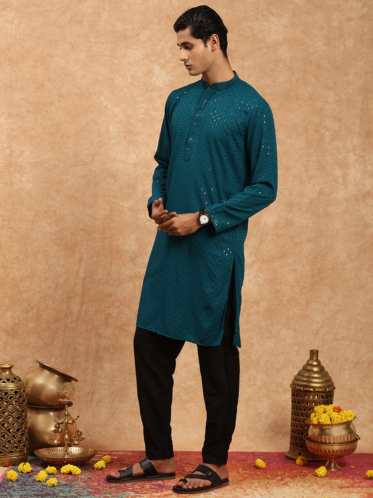 Sanwara Men's Classic Firozi Chikankari Kurta With Sequins Detailing for Every Occasion