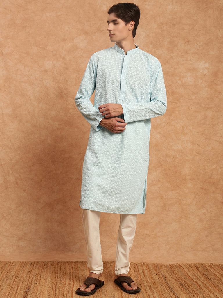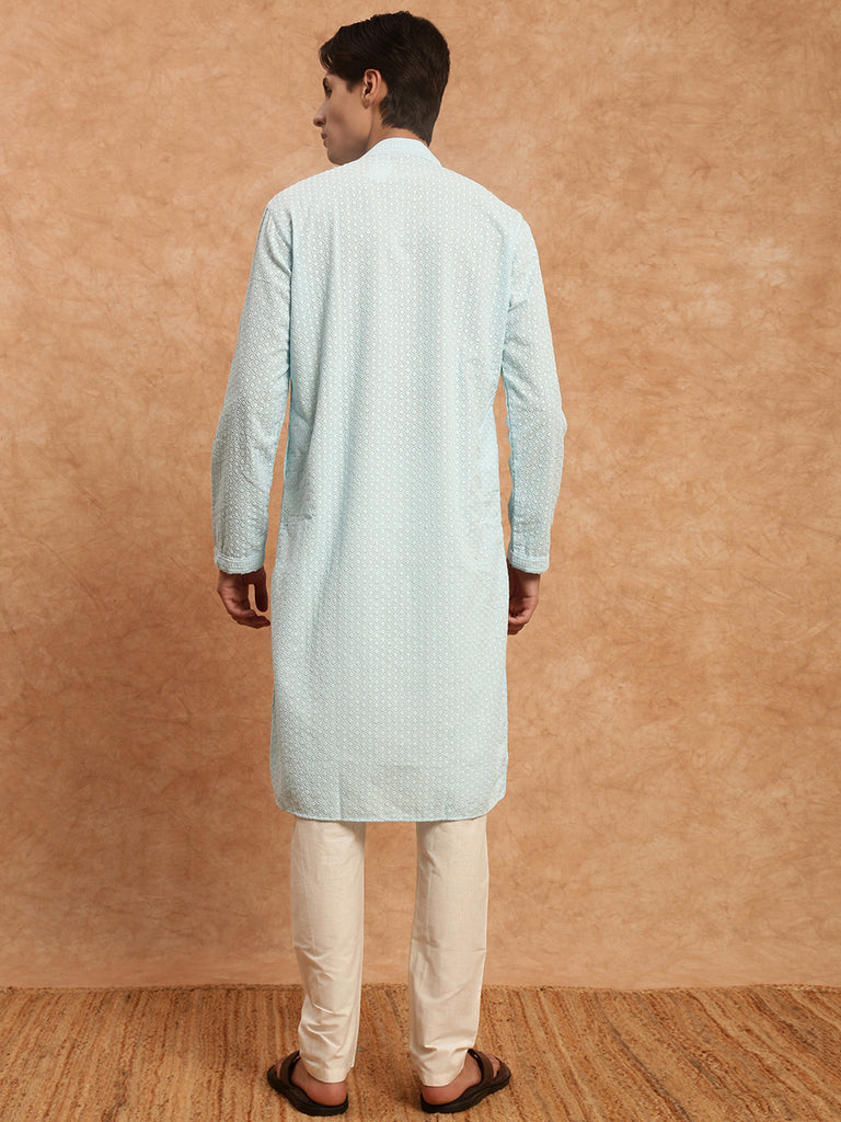 Sanwara's Solid Sky Blue Ethnic Chikankari Cotton Kurta for Men