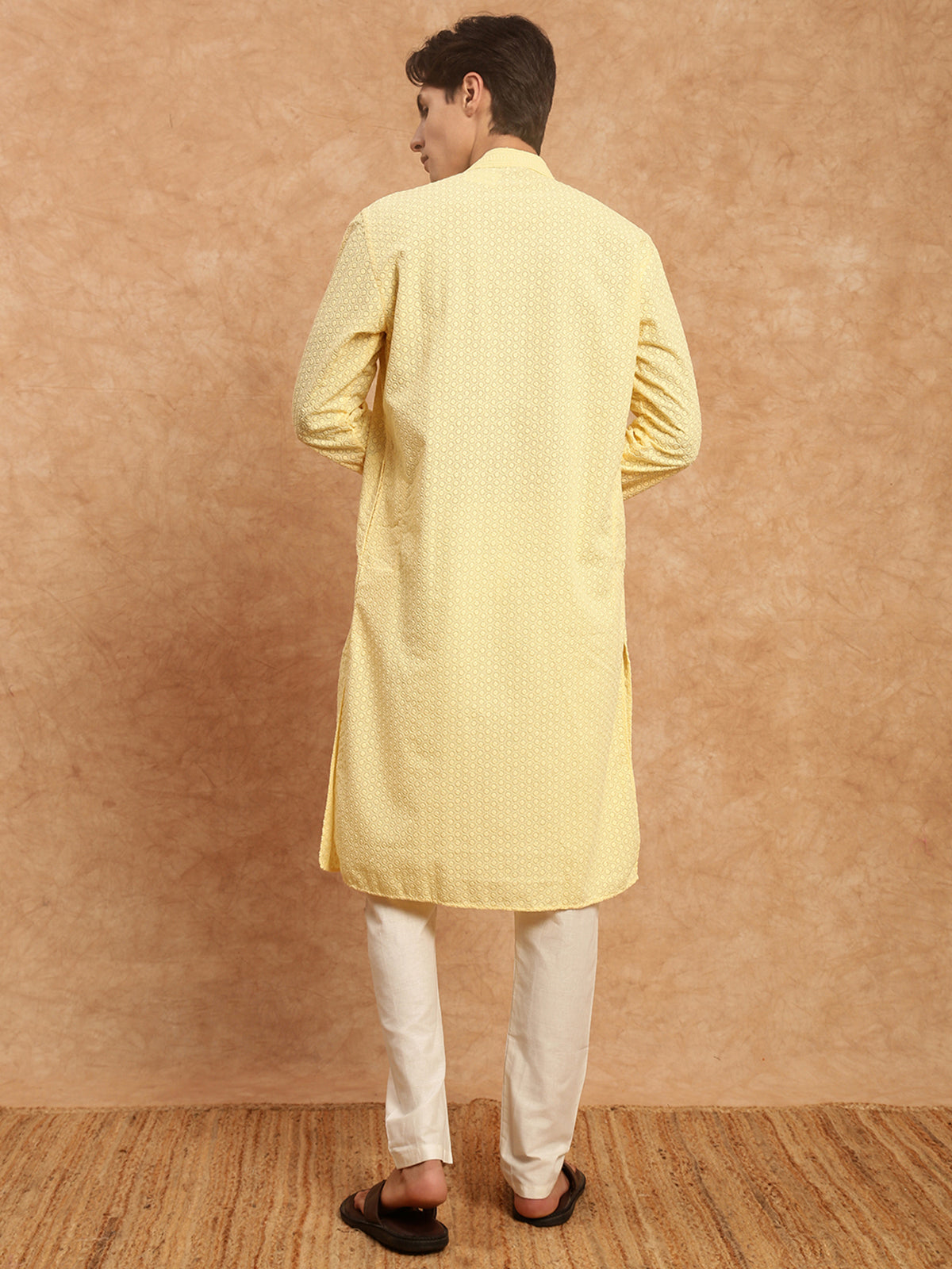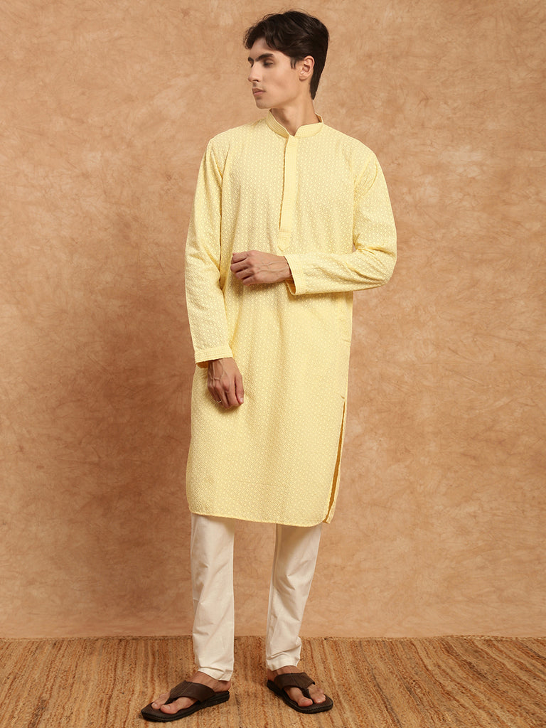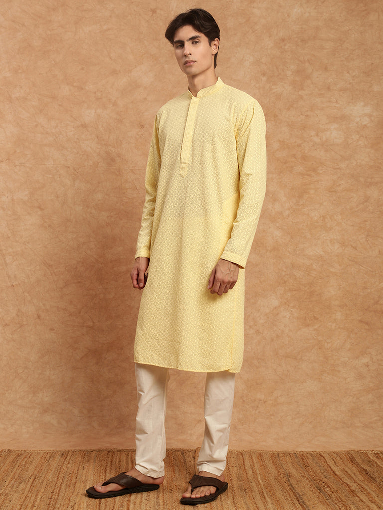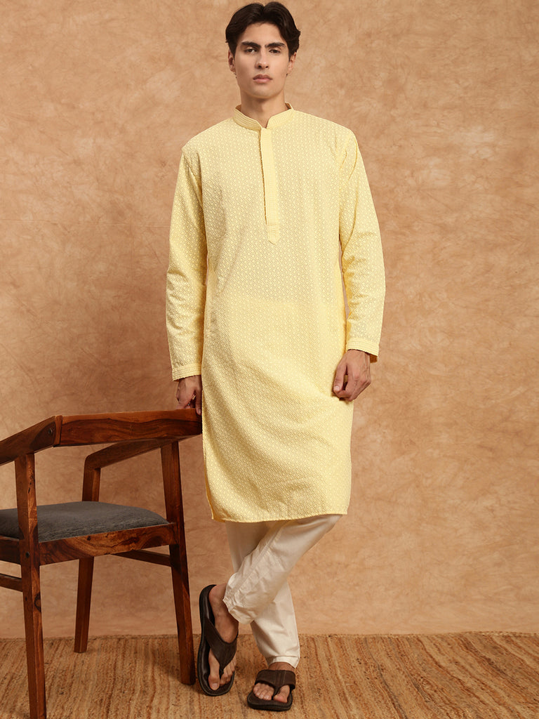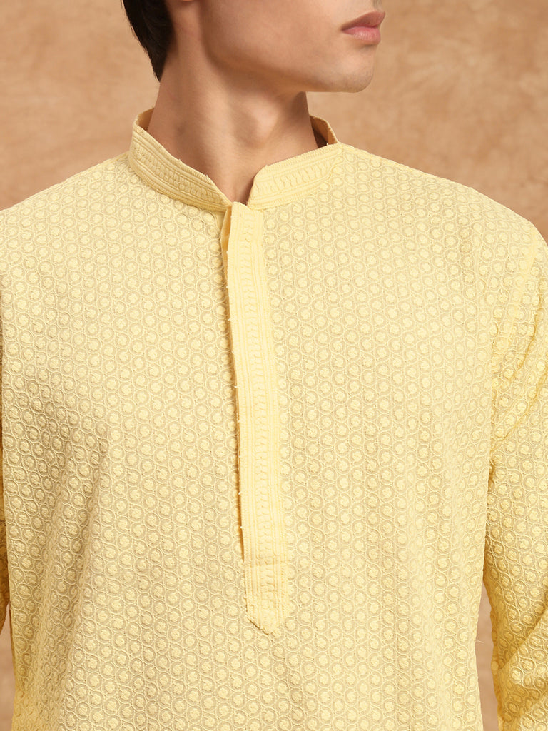 Sanwara's Solid Yellow Ethnic Chikankari Cotton Kurta for Men
