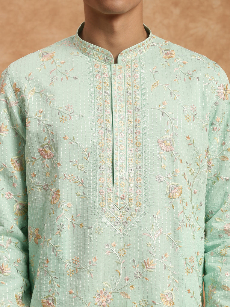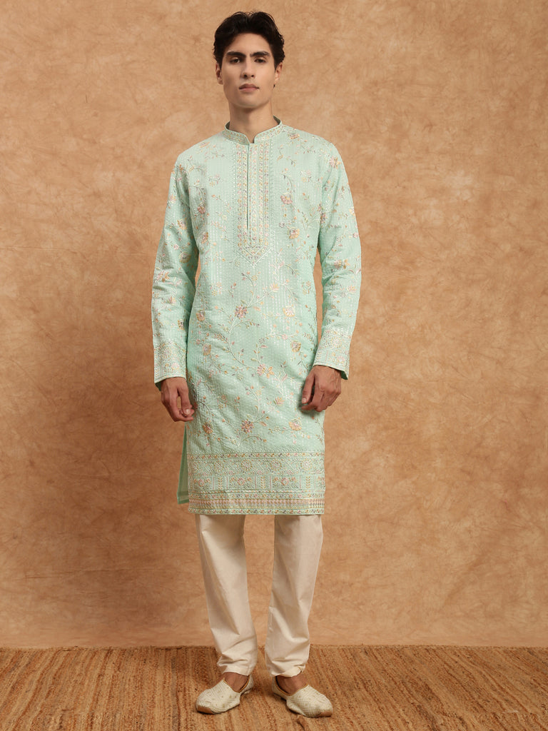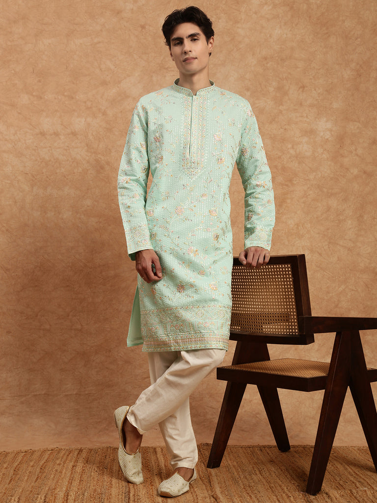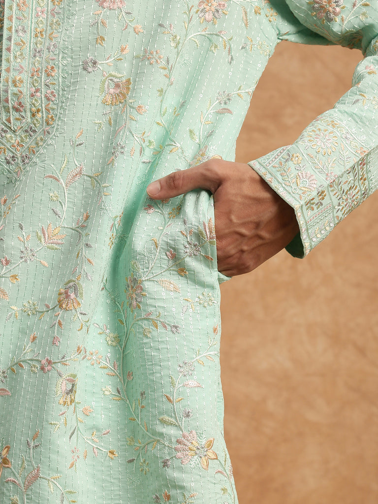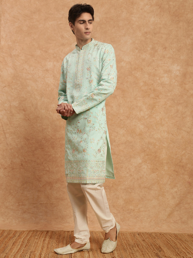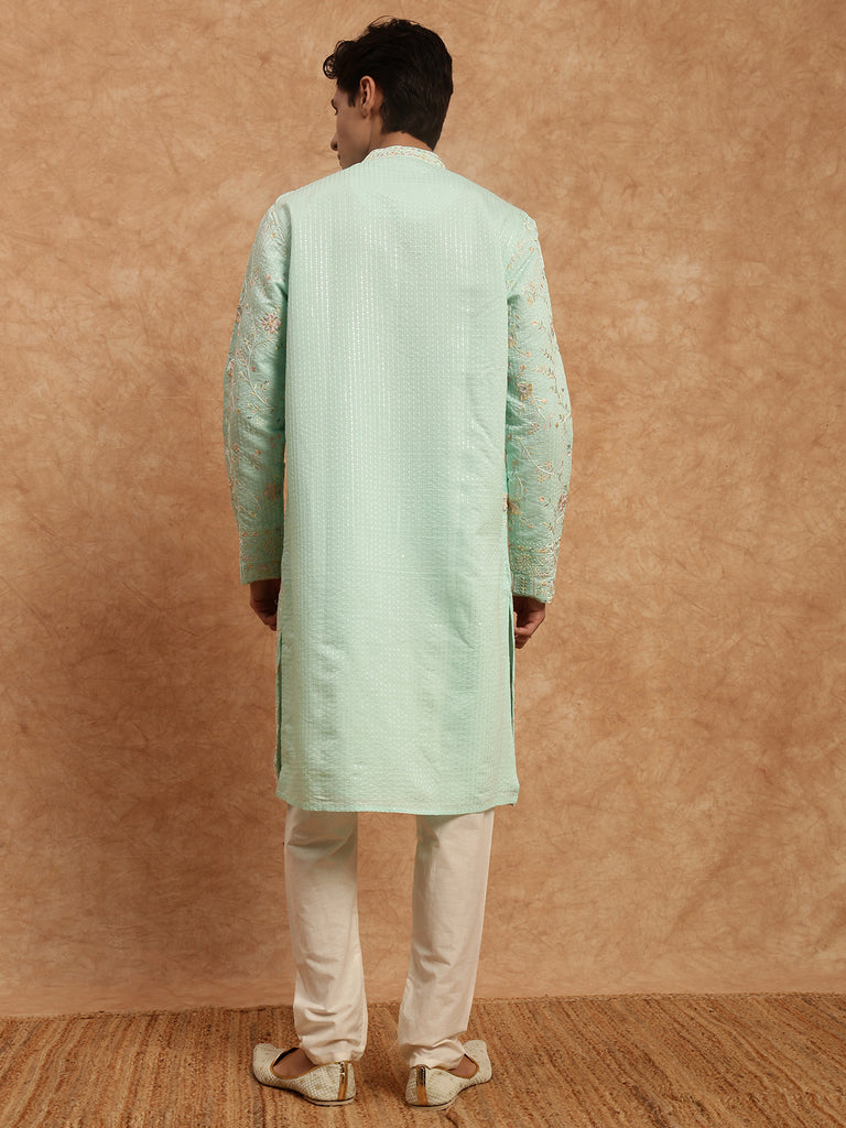 Sanwara Men's Classic Silk Sky Blue Printed With Sequins Work Kurta for Every Occasion