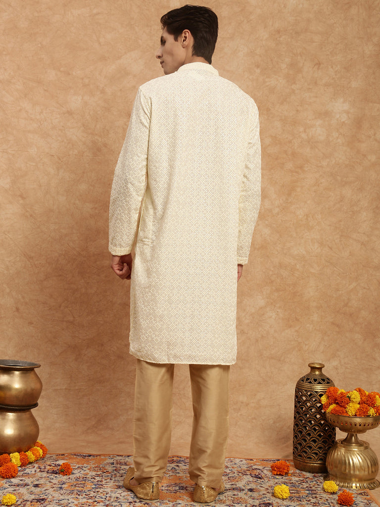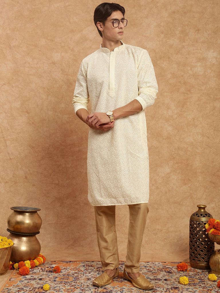 Men's Heritage Embroidered Work Off White Kurta In Cotton by Sanwara