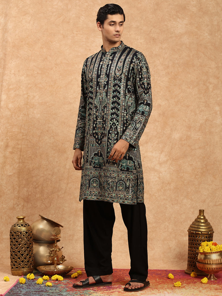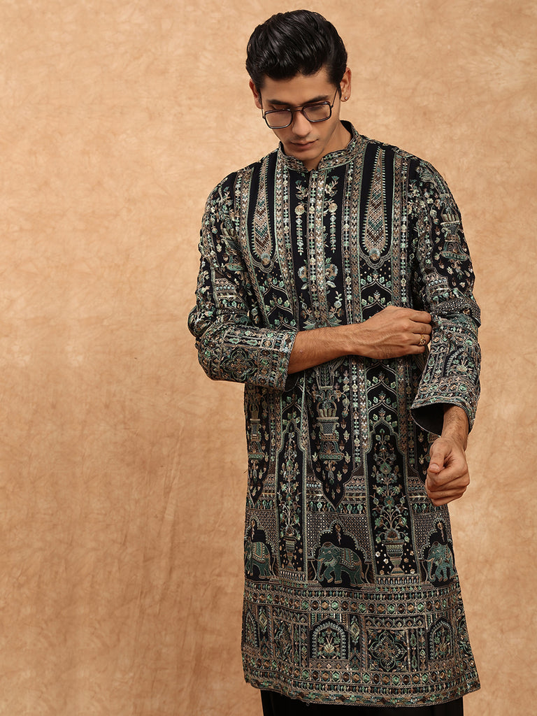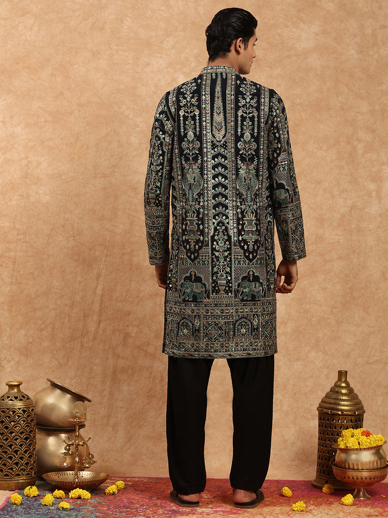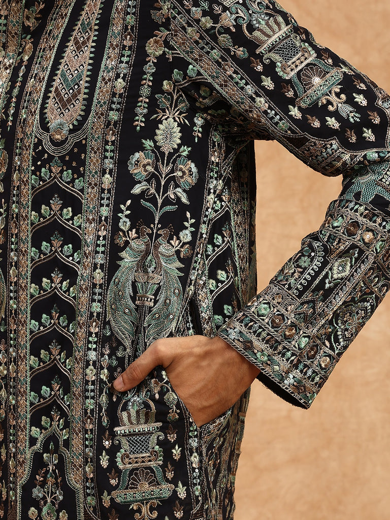Sanwara Men's Black Georgette Sequins With Heritage Embroidered Work Vintage kurtas