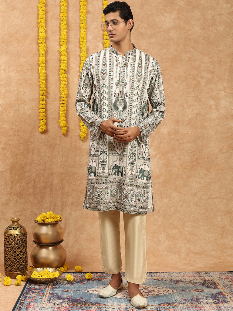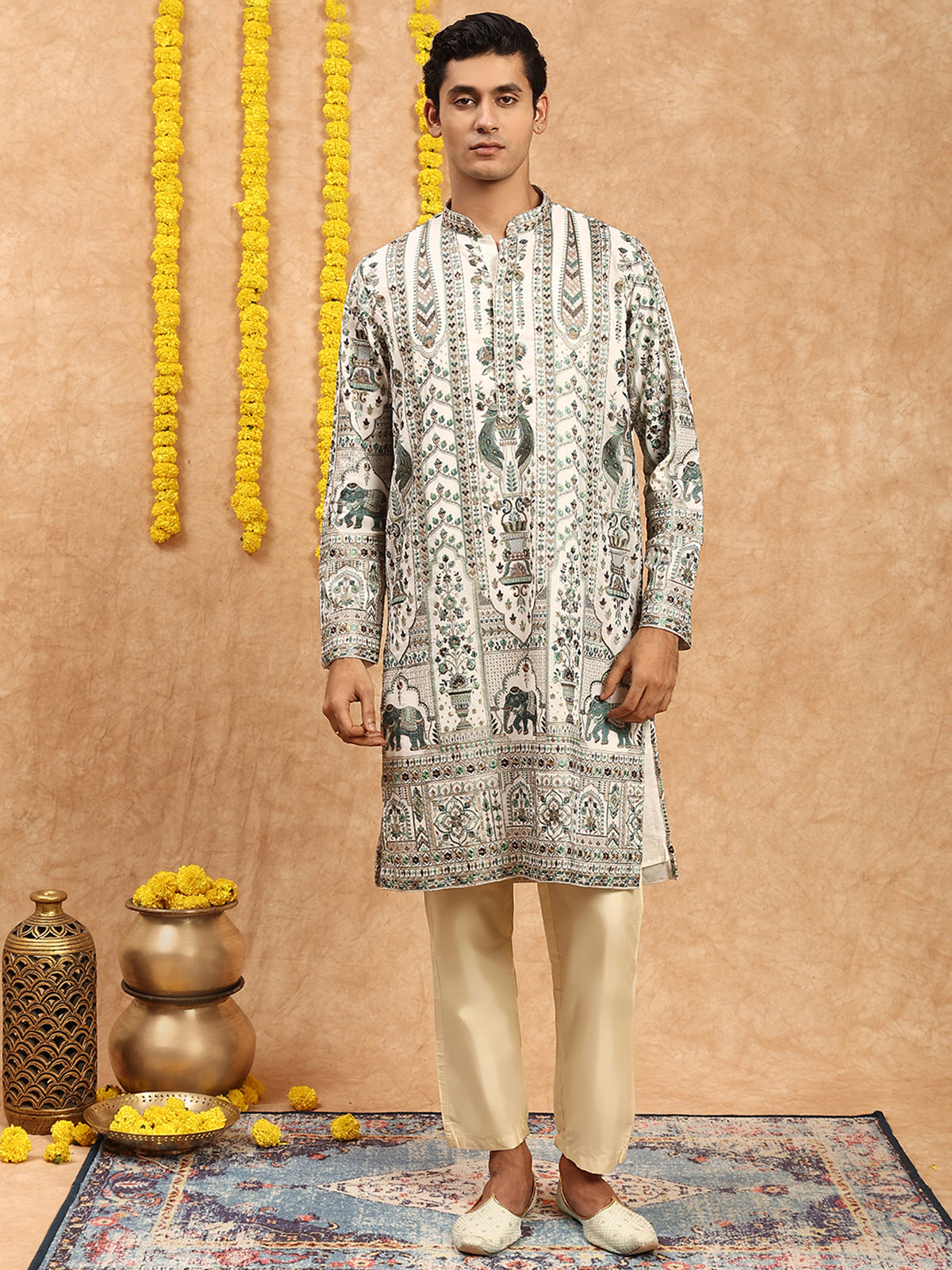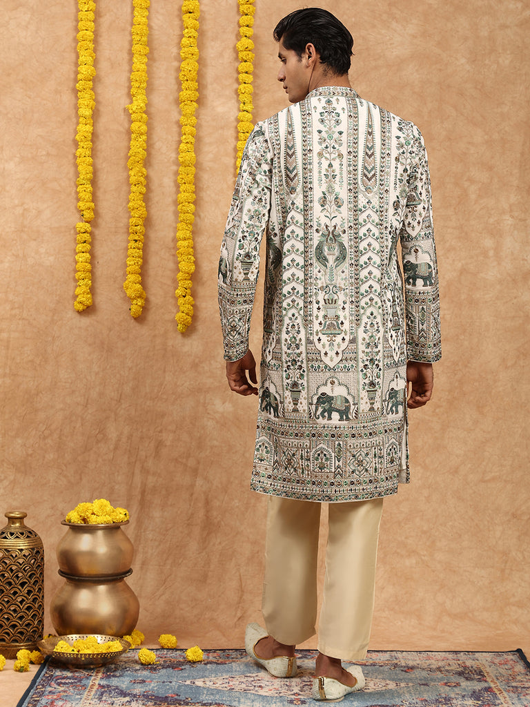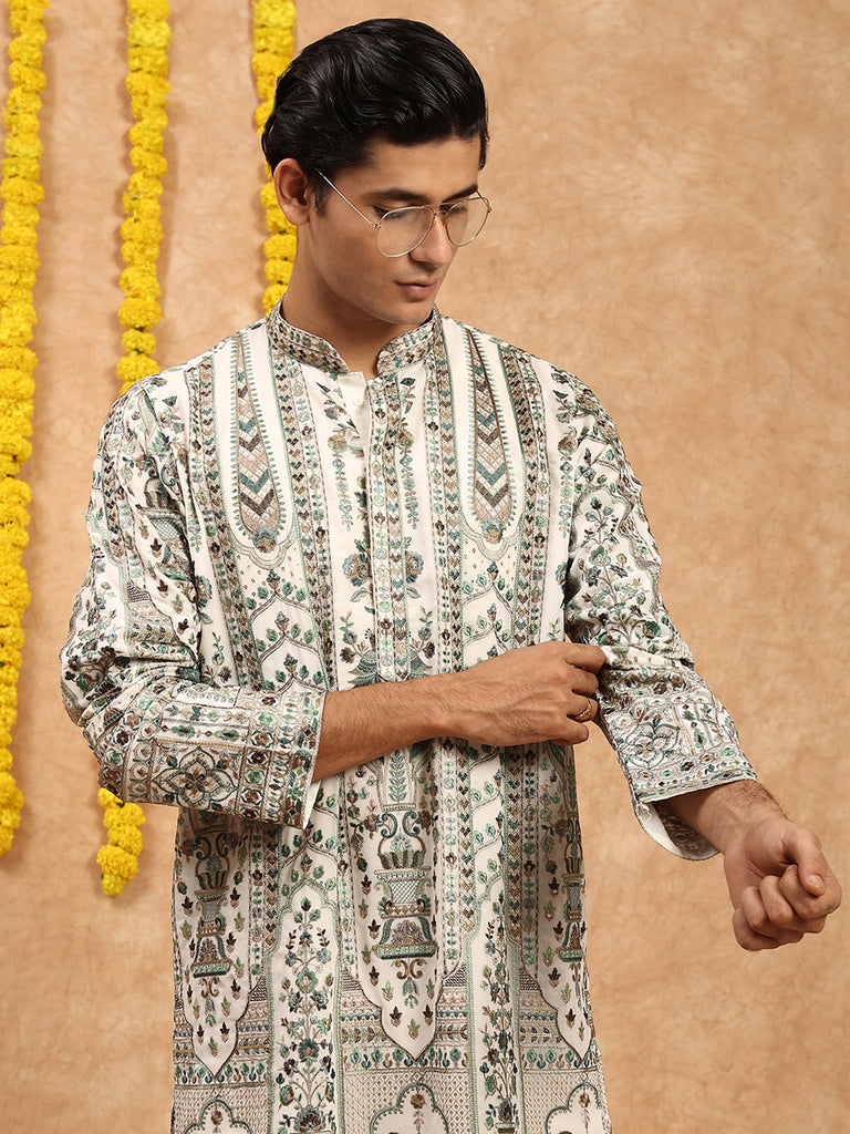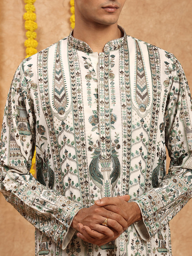 Sanwara Men's Green Georgette Sequins With Heritage Embroidered Work Vintage kurtas