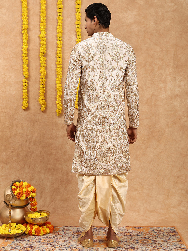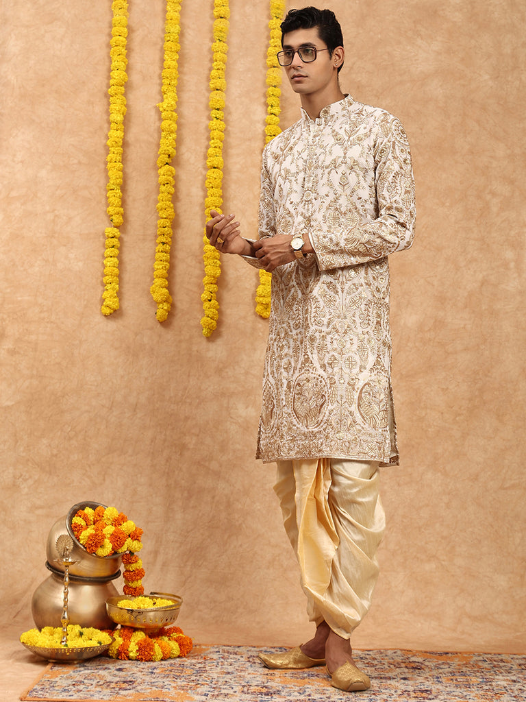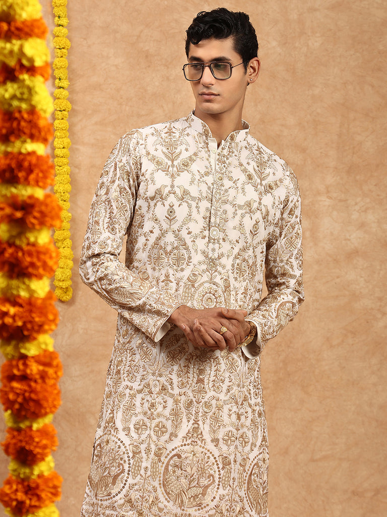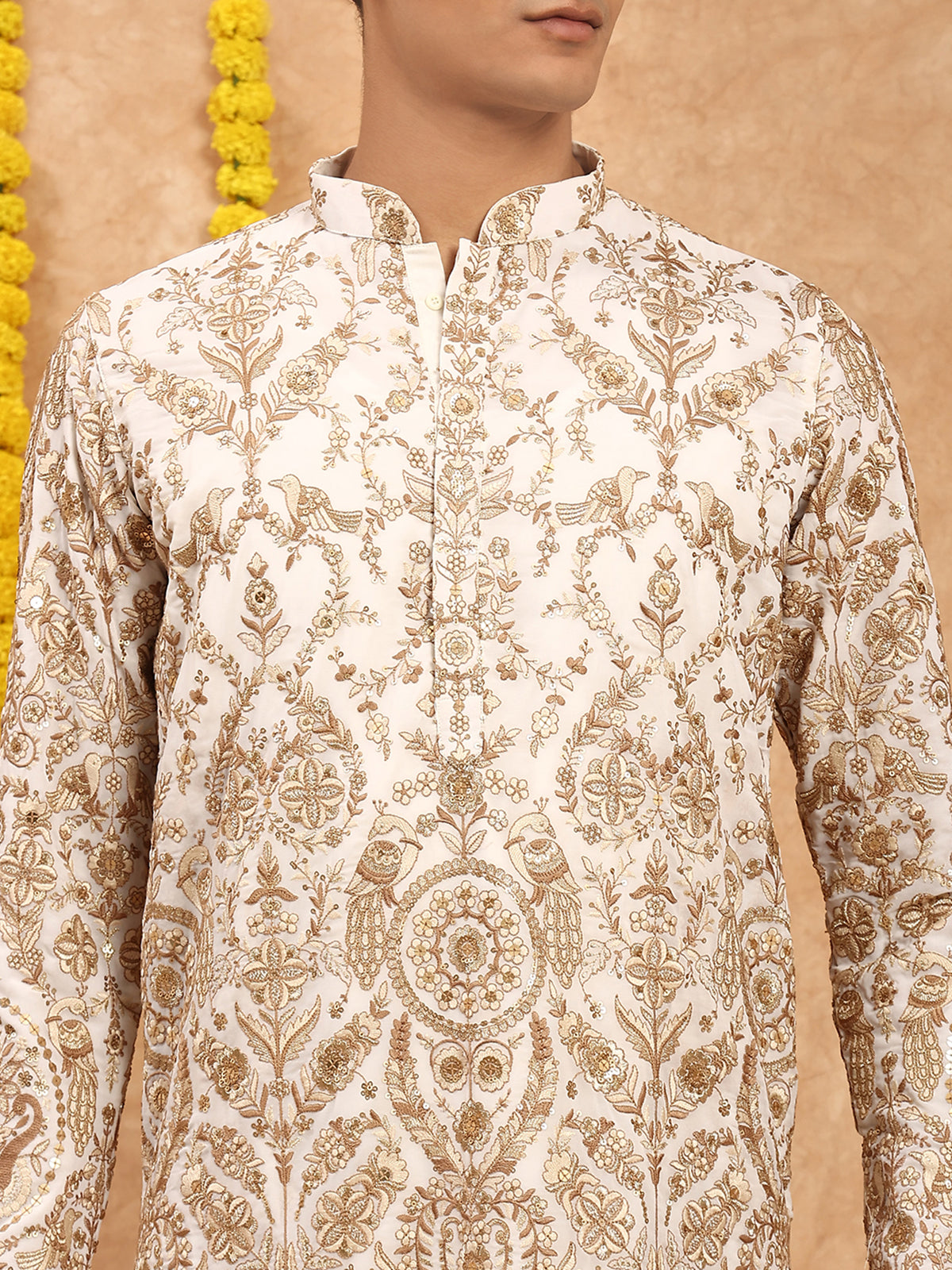Sanwara Men's White Georgette Sequins With Heritage Embroidered Work Vintage kurtas
