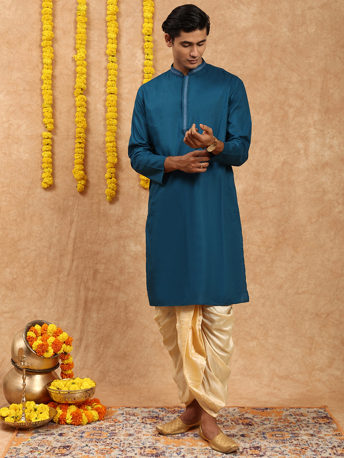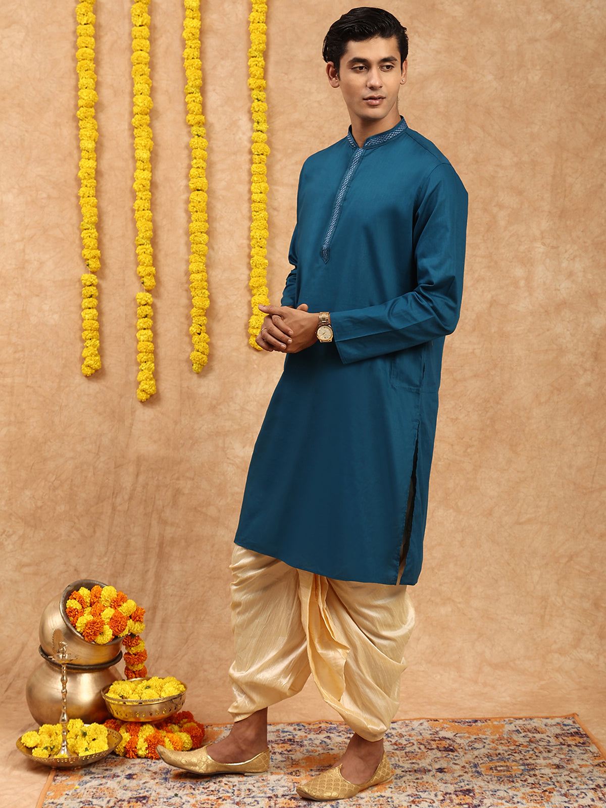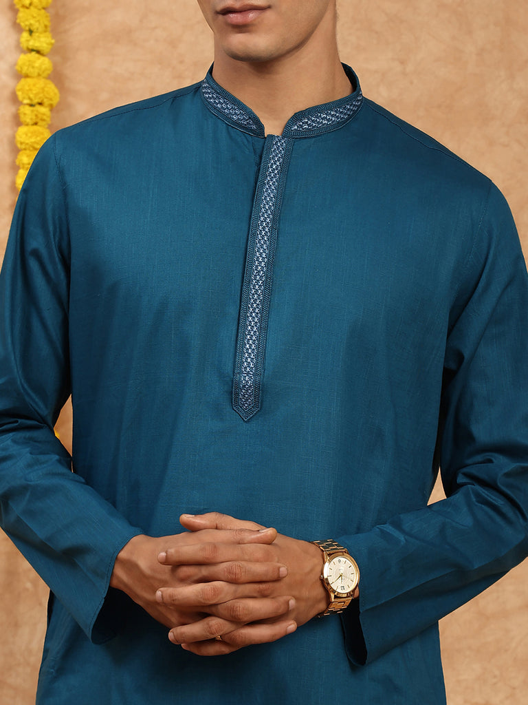 Sanwara Solid Cotton Firozi Collor Work Kurta For Men's