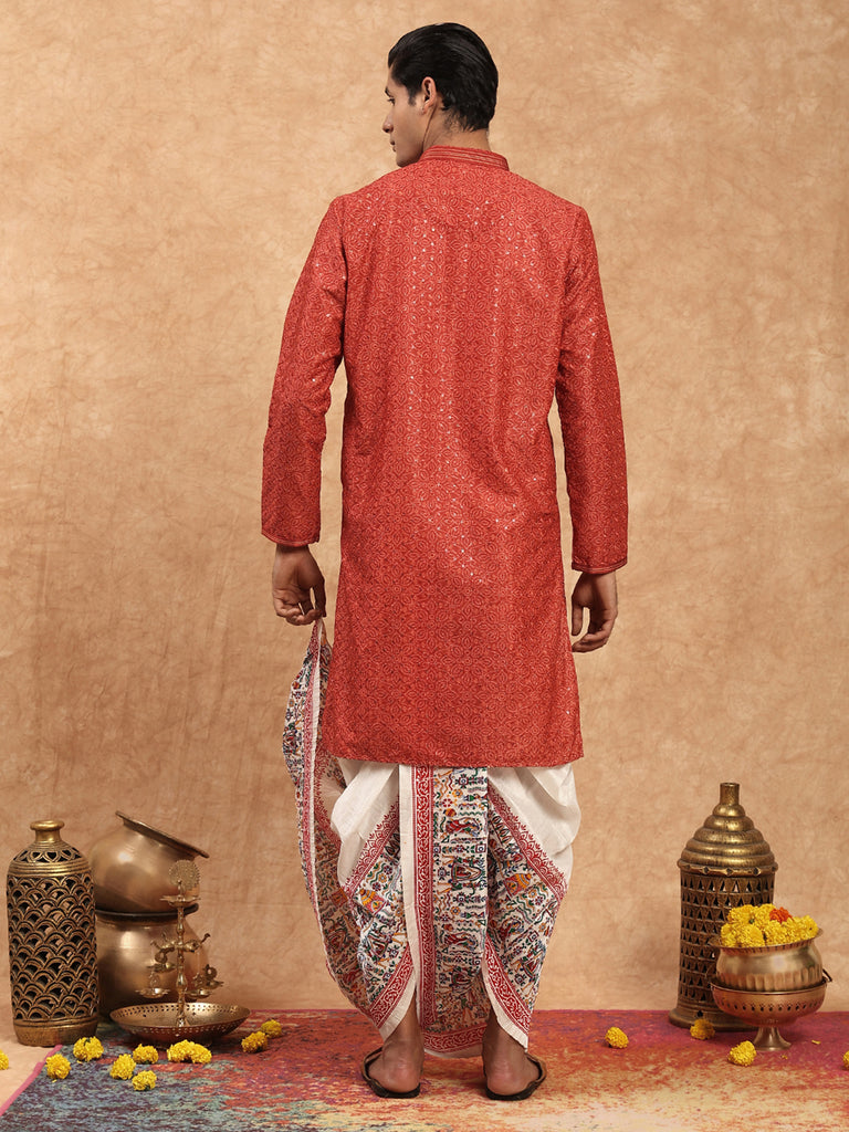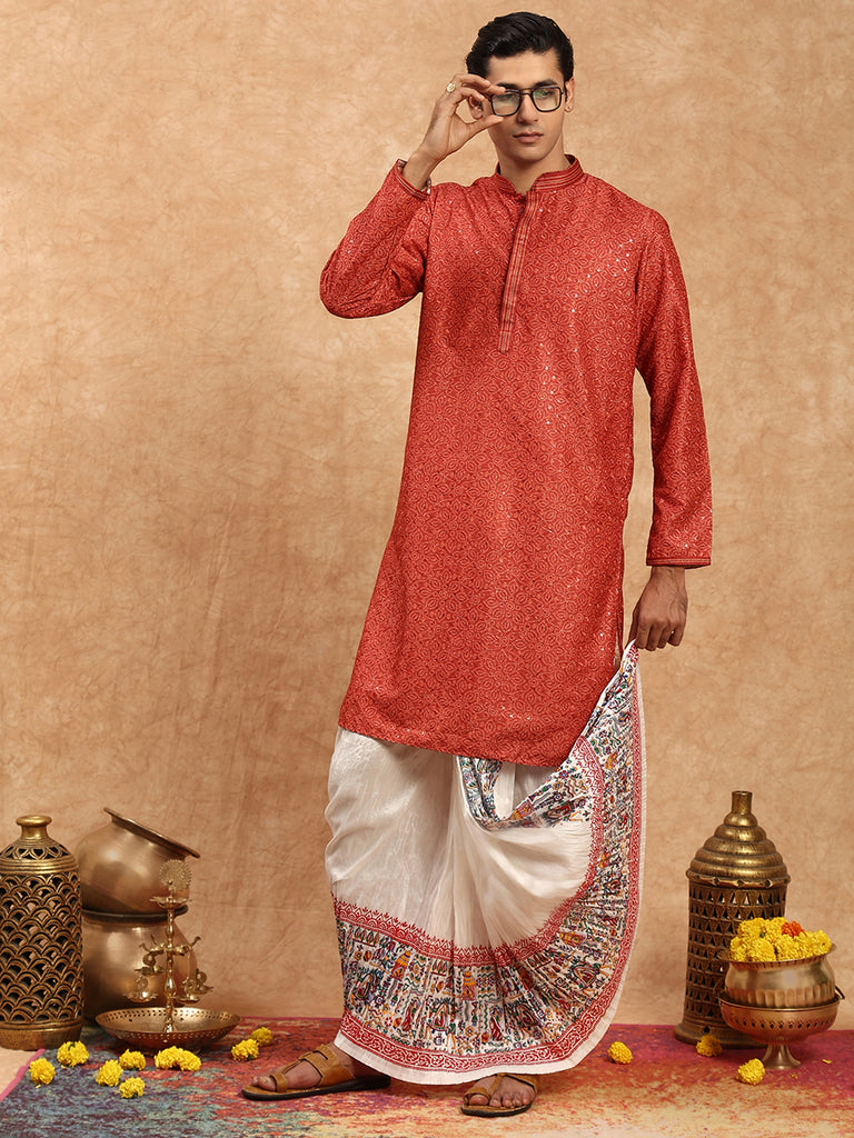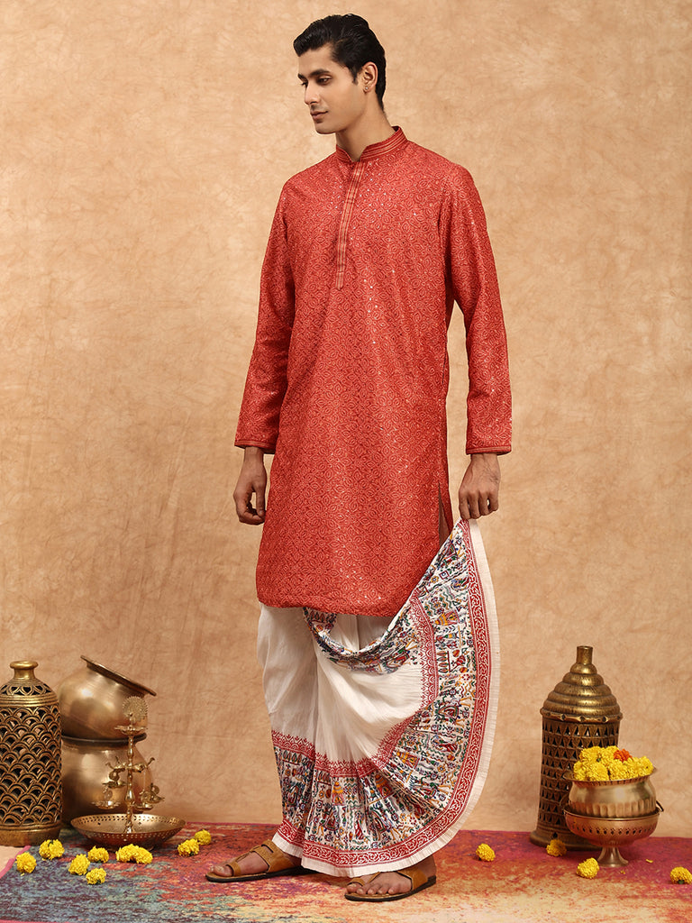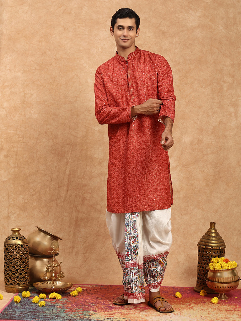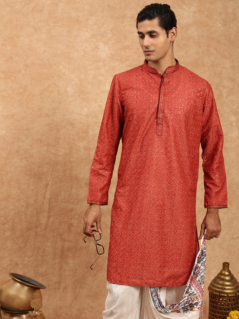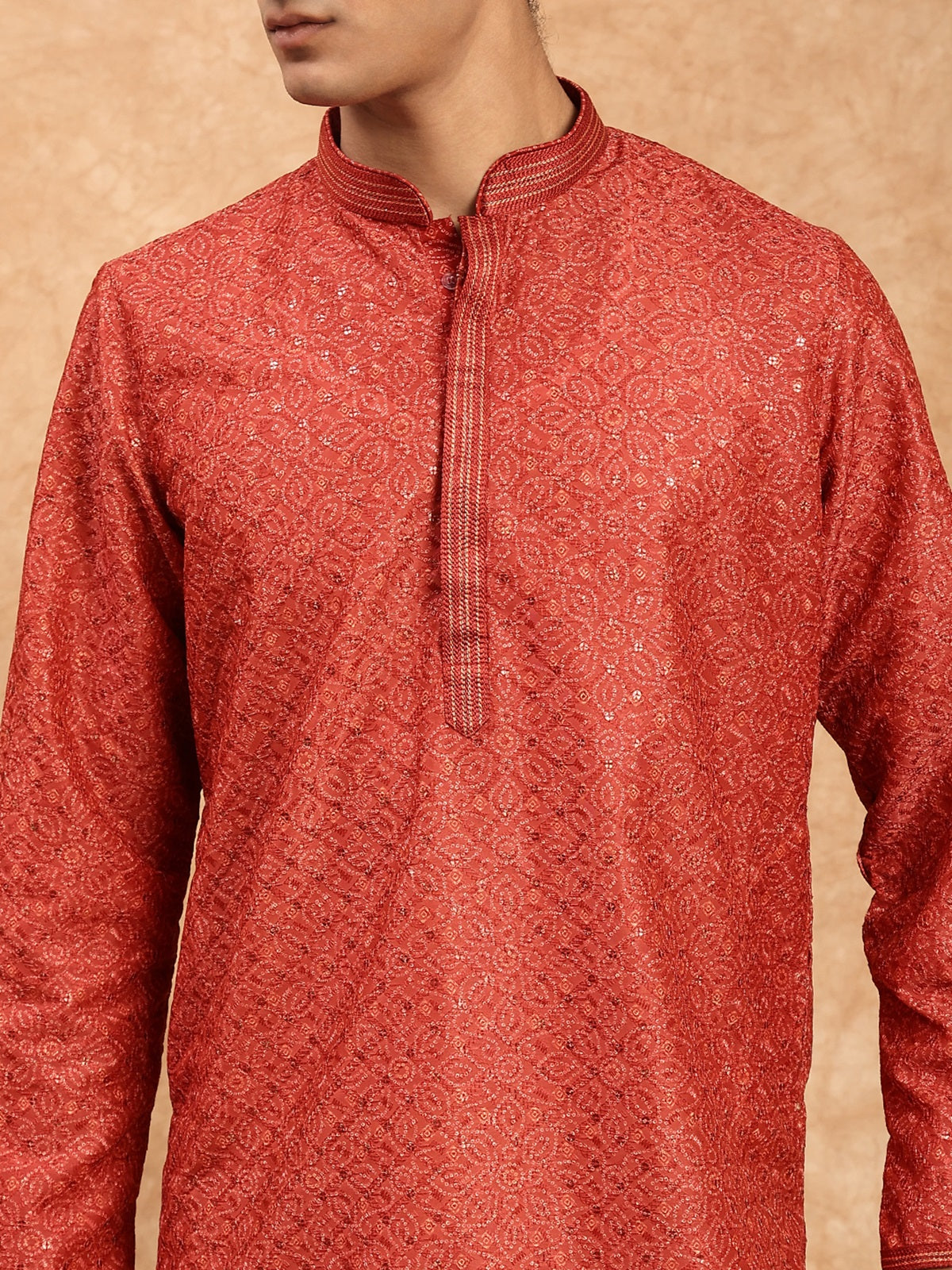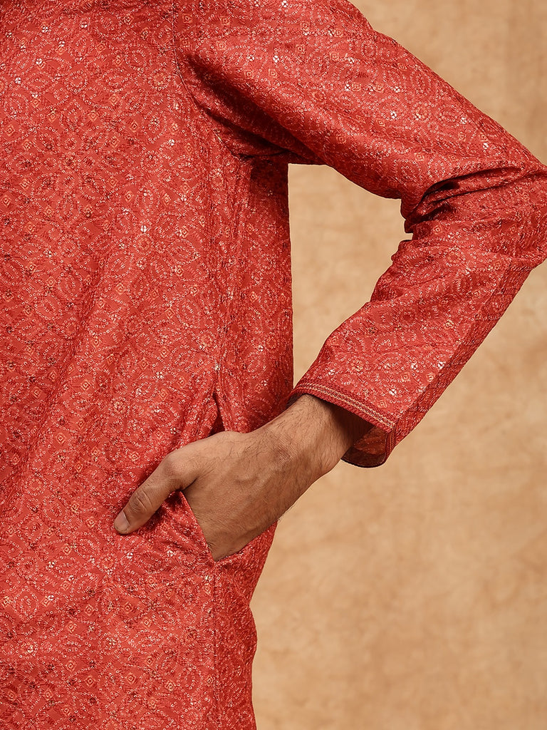 Sanwara Red Bandhej Print With Sequins Detailing Work Designer Diwali Festive Wear Kurta For Men's