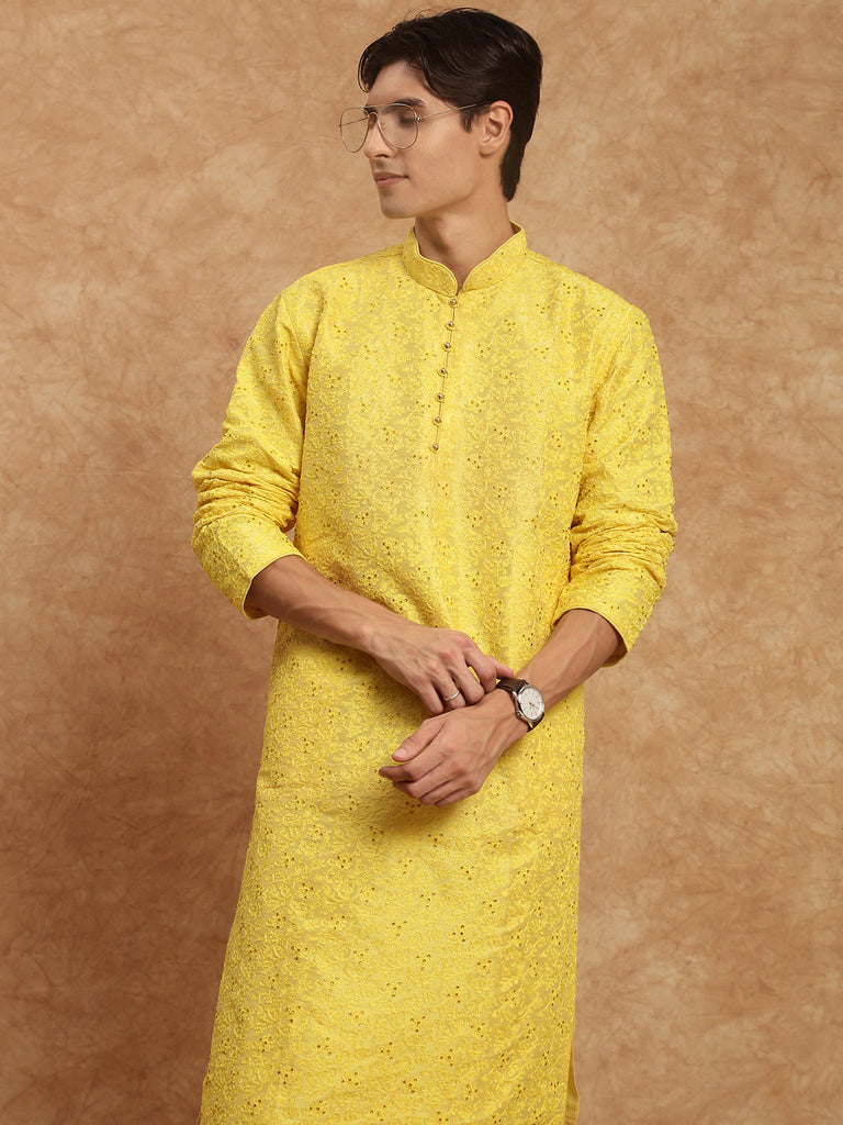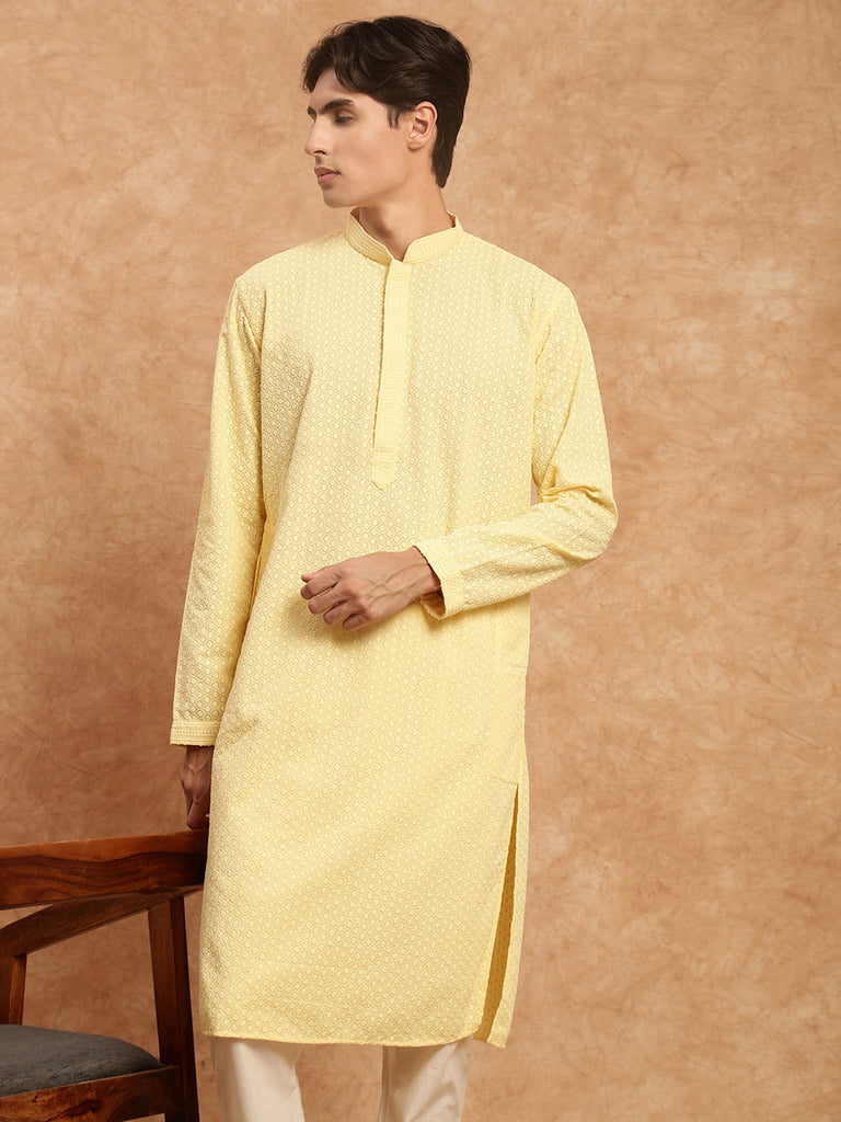 Sanwara's Solid Yellow Ethnic Chikankari Cotton Kurta for Men