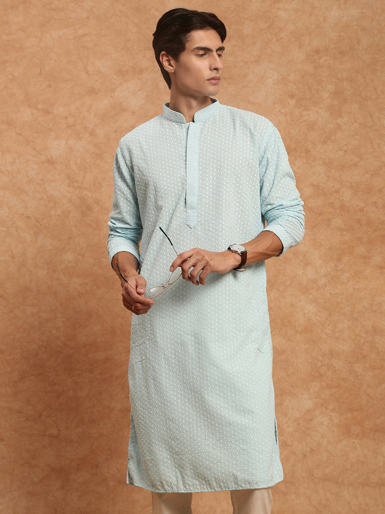 Sanwara's Solid Sky Blue Ethnic Chikankari Cotton Kurta for Men