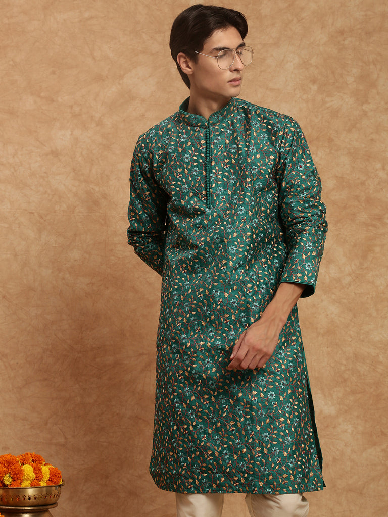 Men's Heritage Printed Work Embroidered Green Kurta In Silk by Sanwara