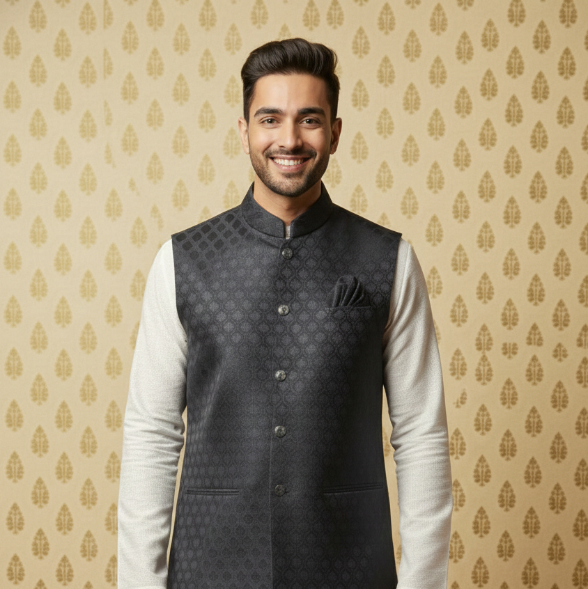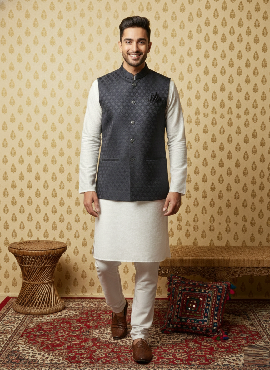 Sanwara presents a statement-making Nehru Jacket thoughtfully crafted for the modern man who values timeless tradition with a contemporary edge. The kurta is tailored with a sharp mandarin collar, and practical pockets for effortless sophistication. Complementing it, the sleeveless Nehru jacket features a luxurious inner lining, structured stand collar, ornate buttons, and a precision fit that elevates the ensemble with refined charm.